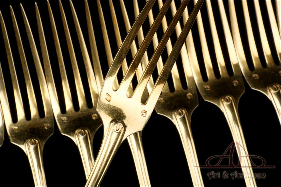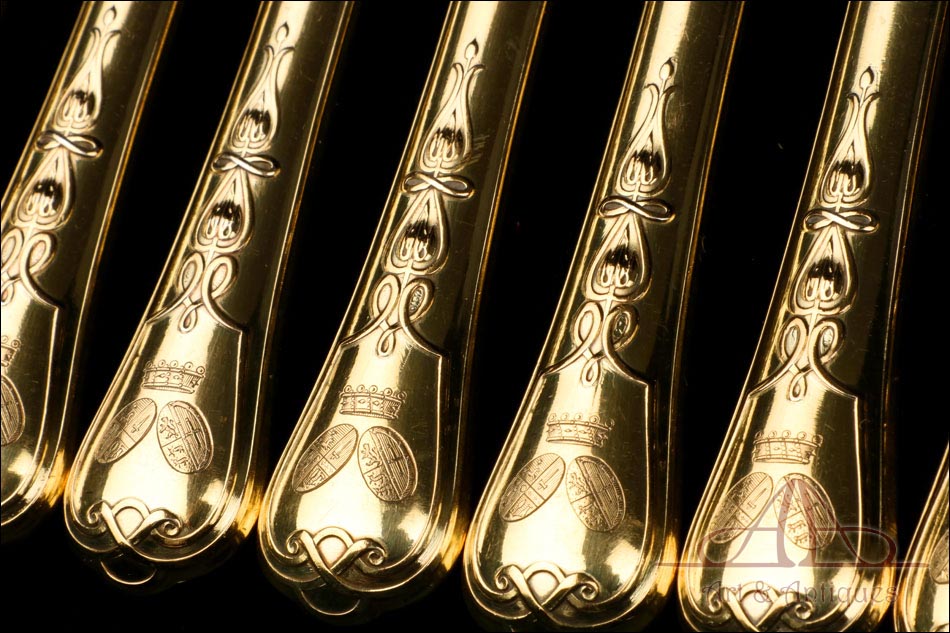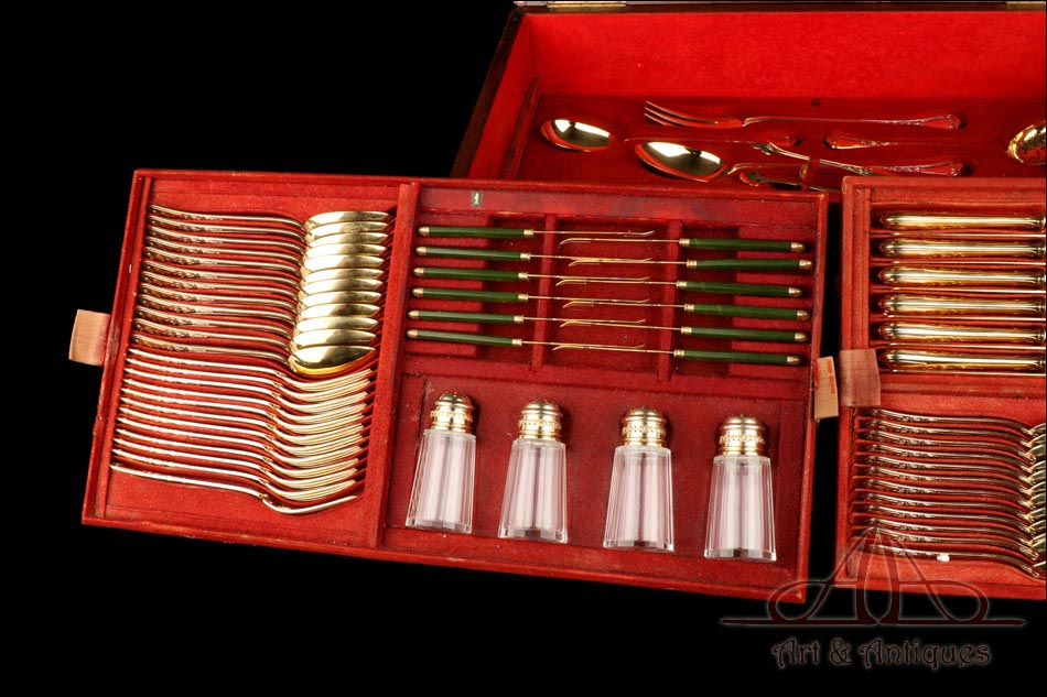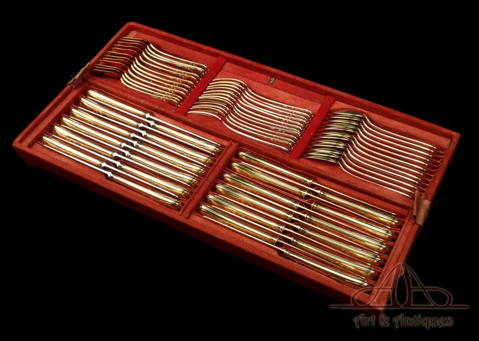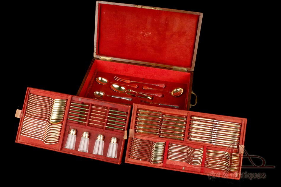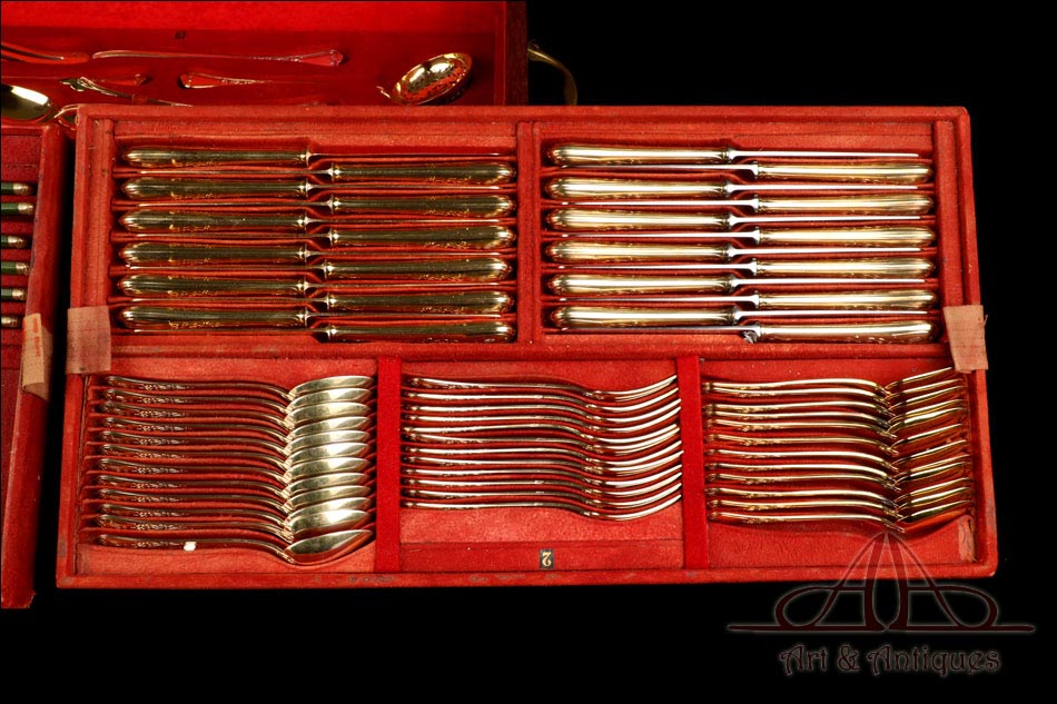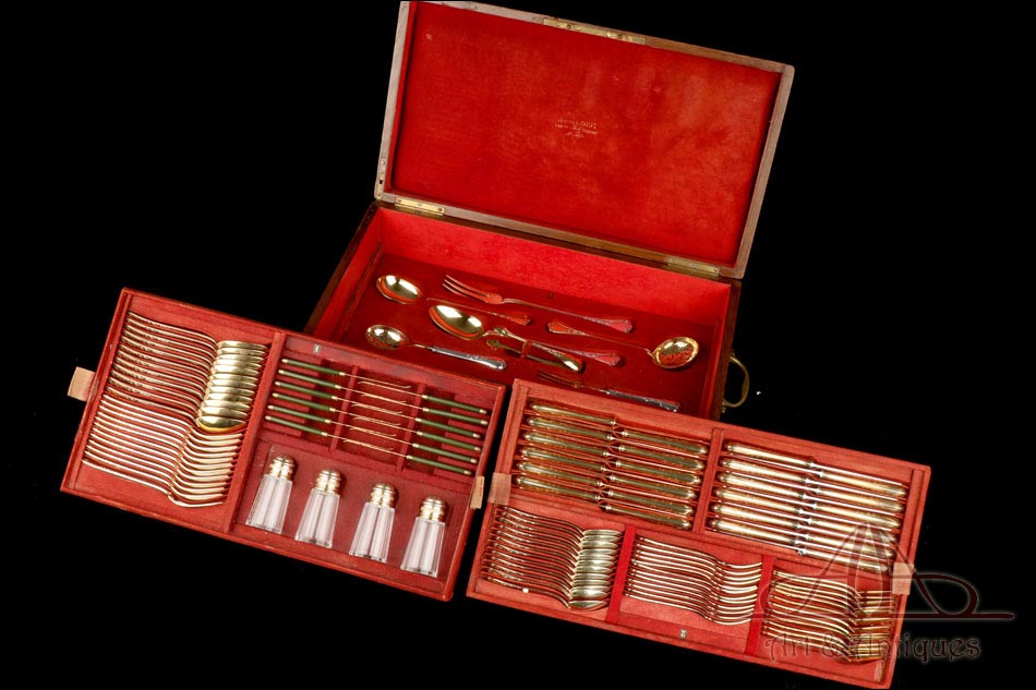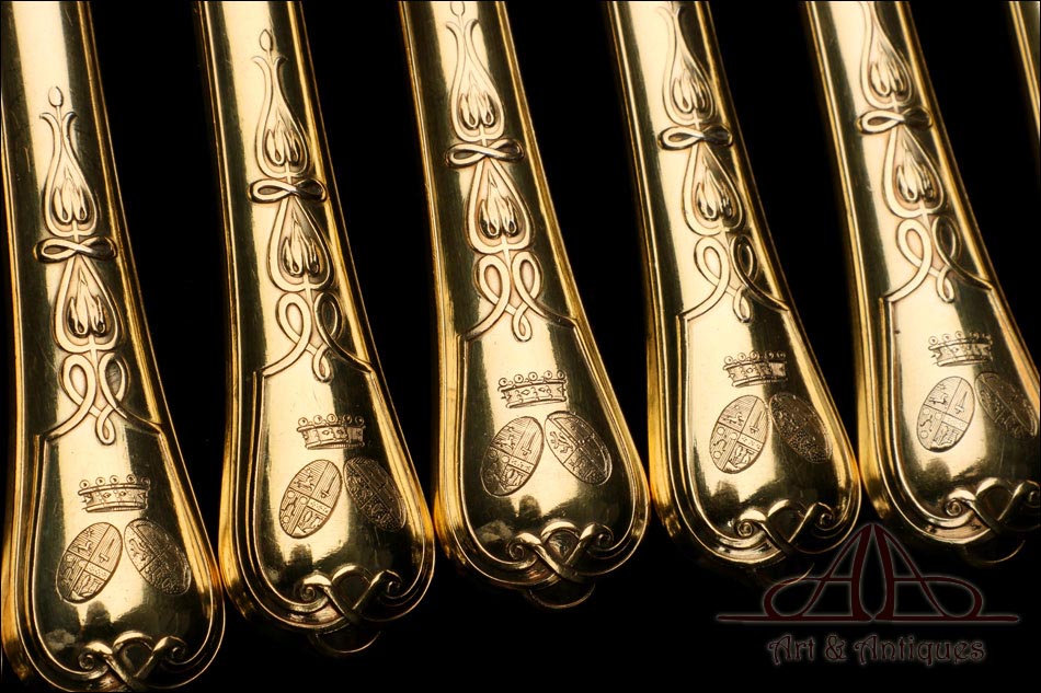 Espectacular cubertería antigua de plata dorada de la Casa Odiot, fabricada en París circa 1900 y completa. La cubertería está formada por 12 servicios de 8 cubiertos e incluye 4 saleros y 10 cubiertos para servir (110 piezas en total). Las piezas son de plata maciza, excepto un juego de cuchillos con hoja de acero y mango de plata. Se trata de cubiertos de gran belleza que crean un elegante y original efecto que llenará de encanto la mesa más elegante. Los cubiertos llevan el nombre ODIOT grabado en el canto, mientras que la tapa del estuche lleva encastrado un medallón de latón con un escudo y la corona condal.