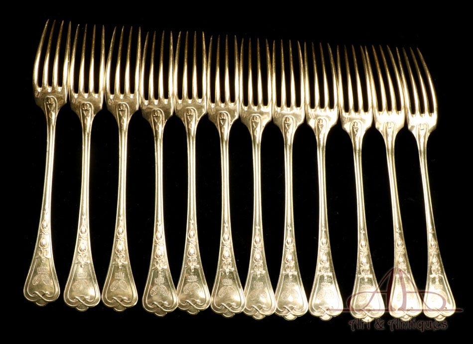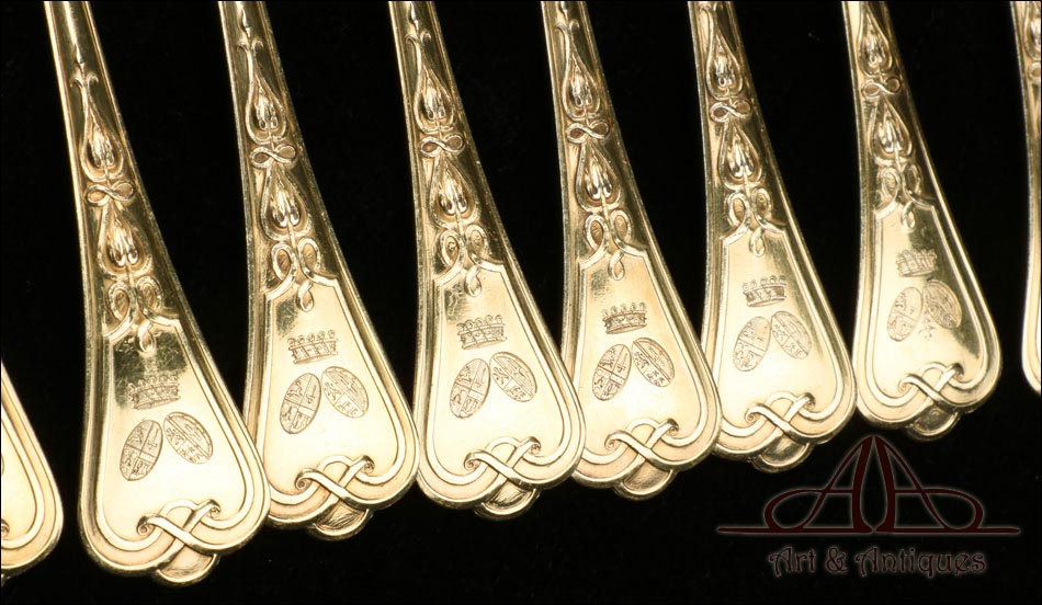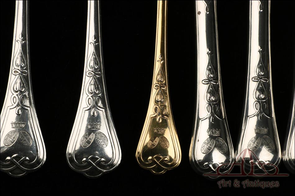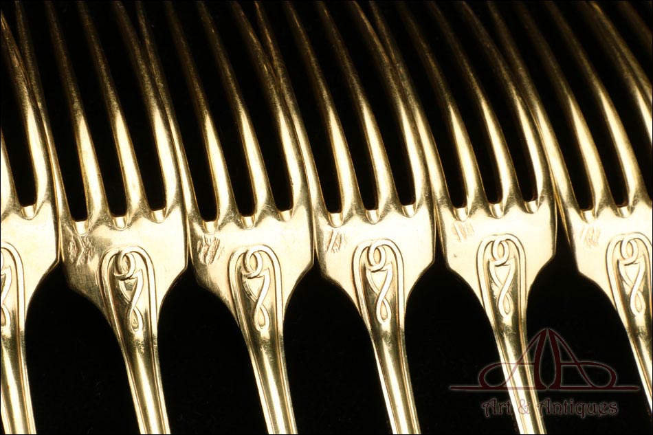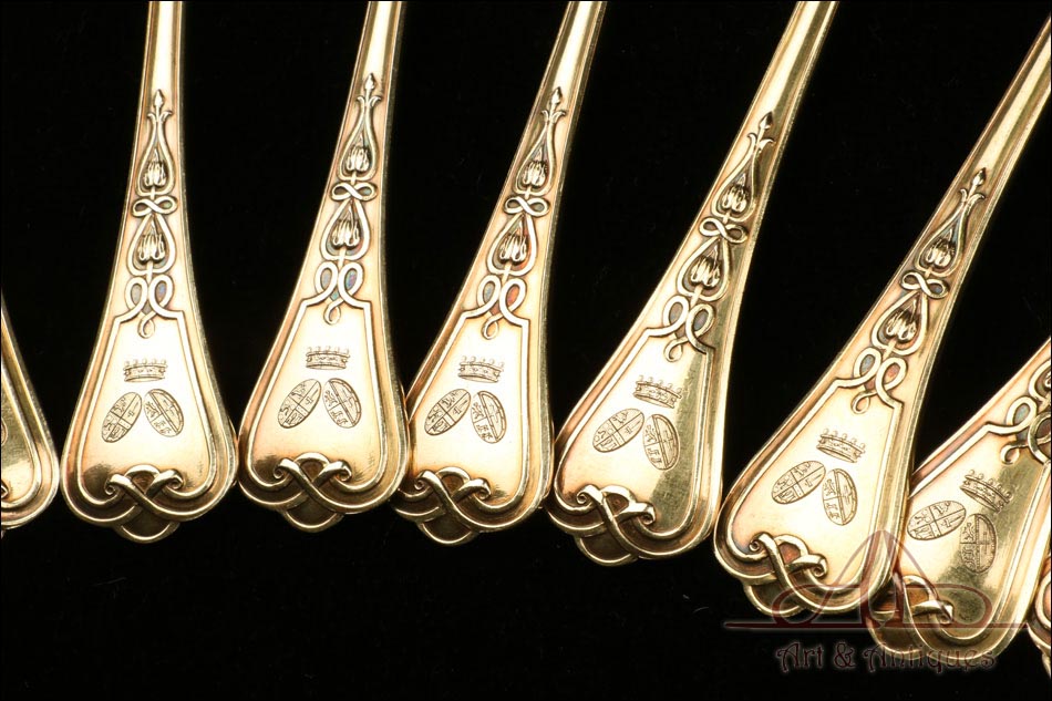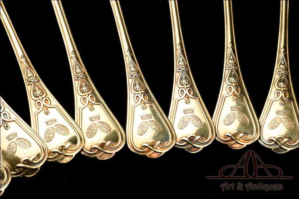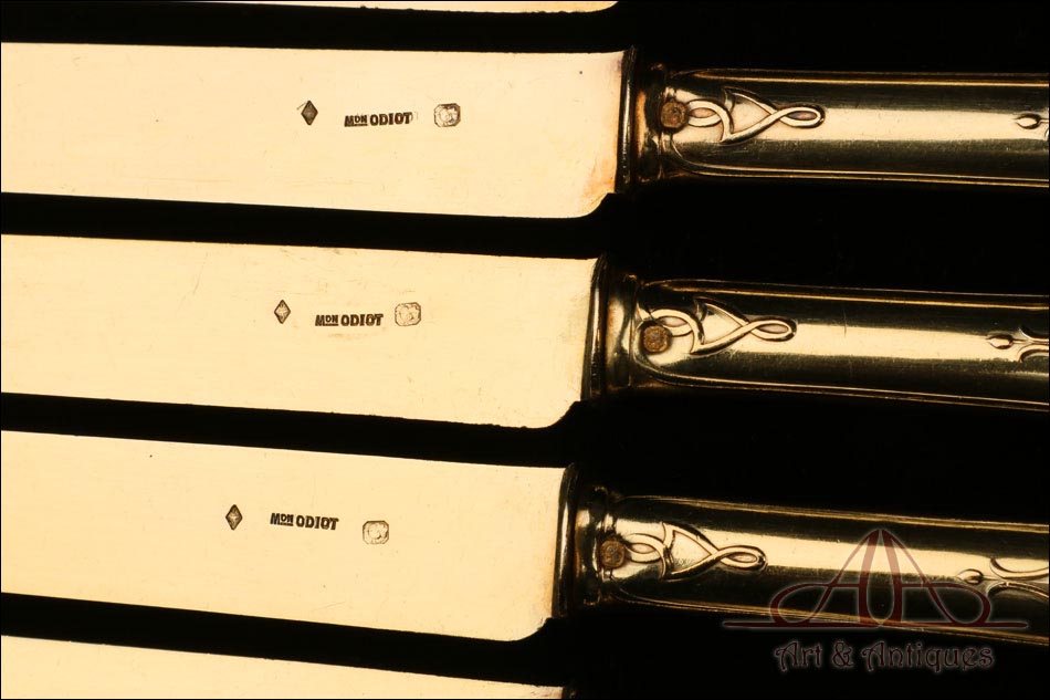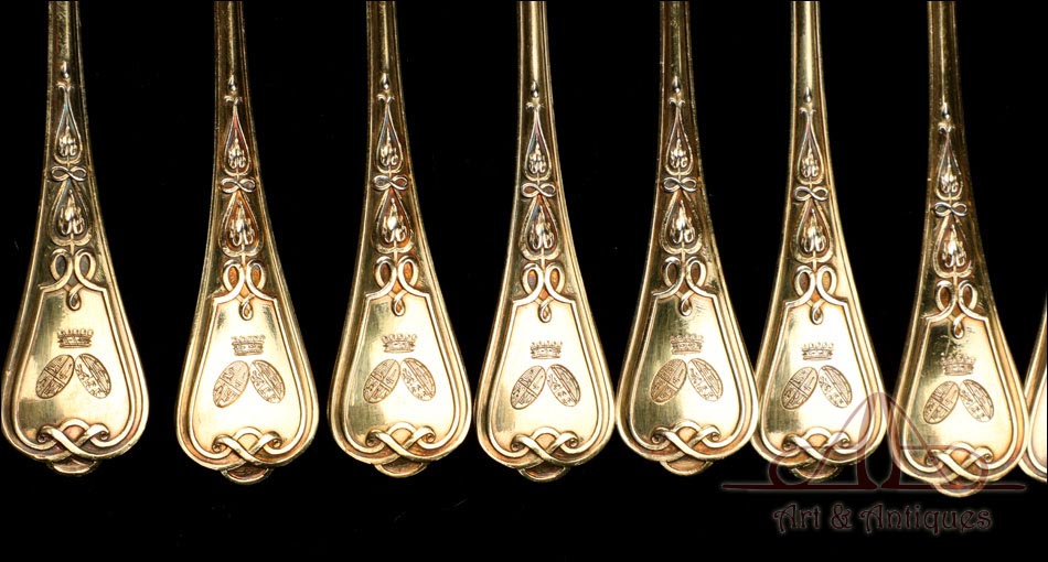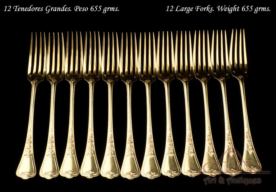 Espectacular cubertería antigua de plata dorada de la Casa Odiot, fabricada en París circa 1900 y completa. La cubertería está formada por 12 servicios de 8 cubiertos e incluye 4 saleros y 10 cubiertos para servir (110 piezas en total). Las piezas son de plata maciza, excepto un juego de cuchillos con hoja de acero y mango de plata. Se trata de cubiertos de gran belleza que crean un elegante y original efecto que llenará de encanto la mesa más elegante. Los cubiertos llevan el nombre ODIOT grabado en el canto, mientras que la tapa del estuche lleva encastrado un medallón de latón con un escudo y la corona condal.