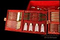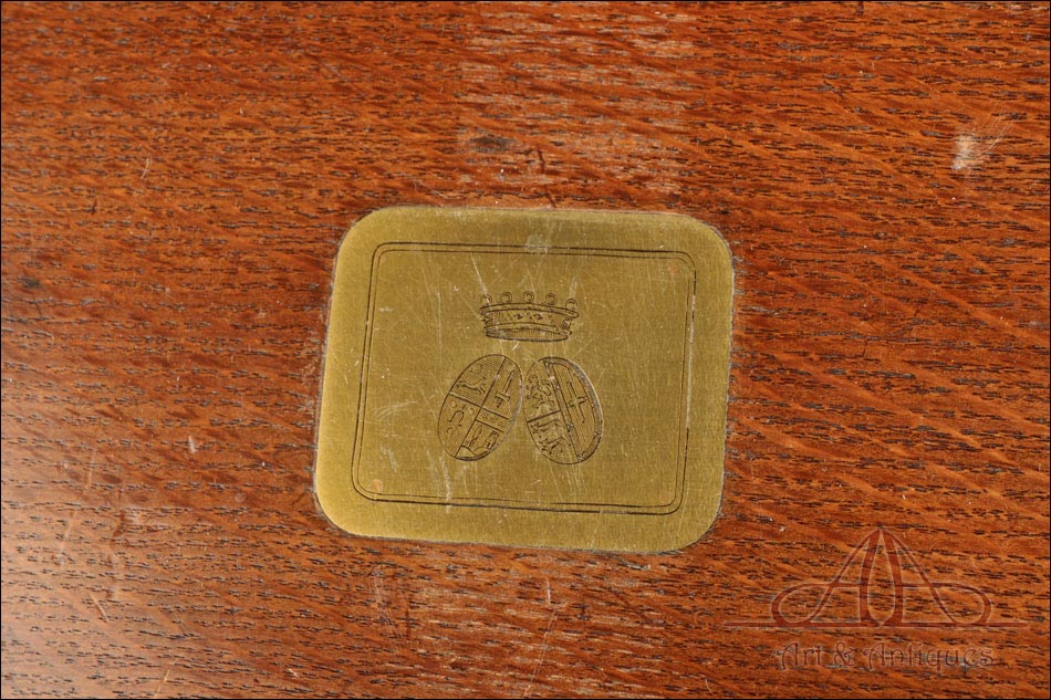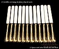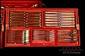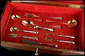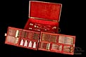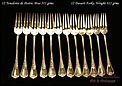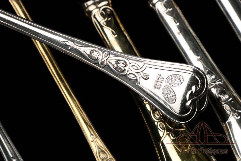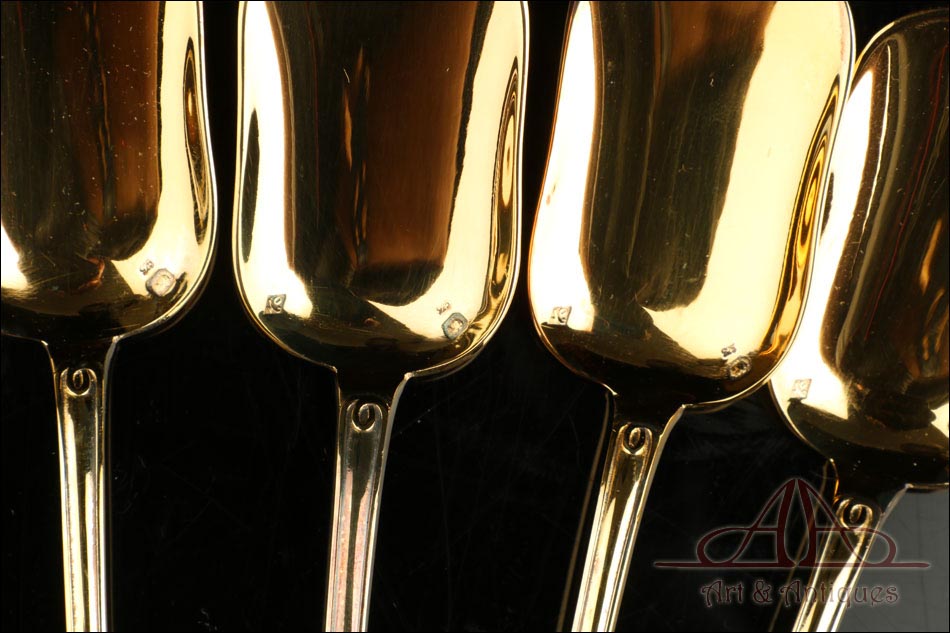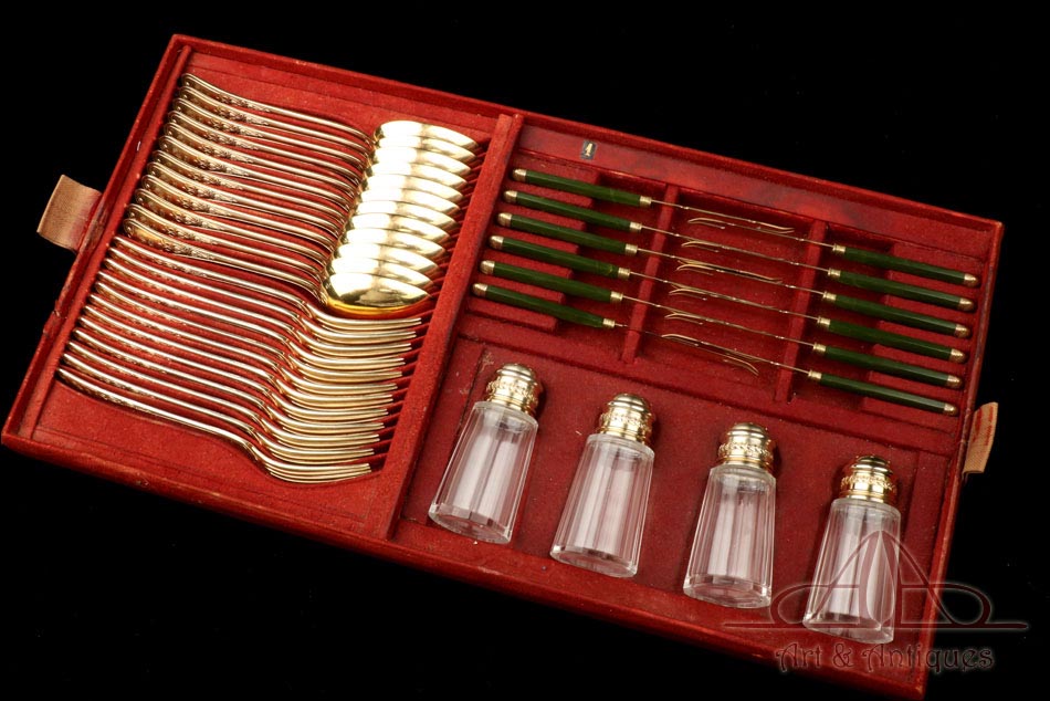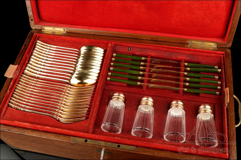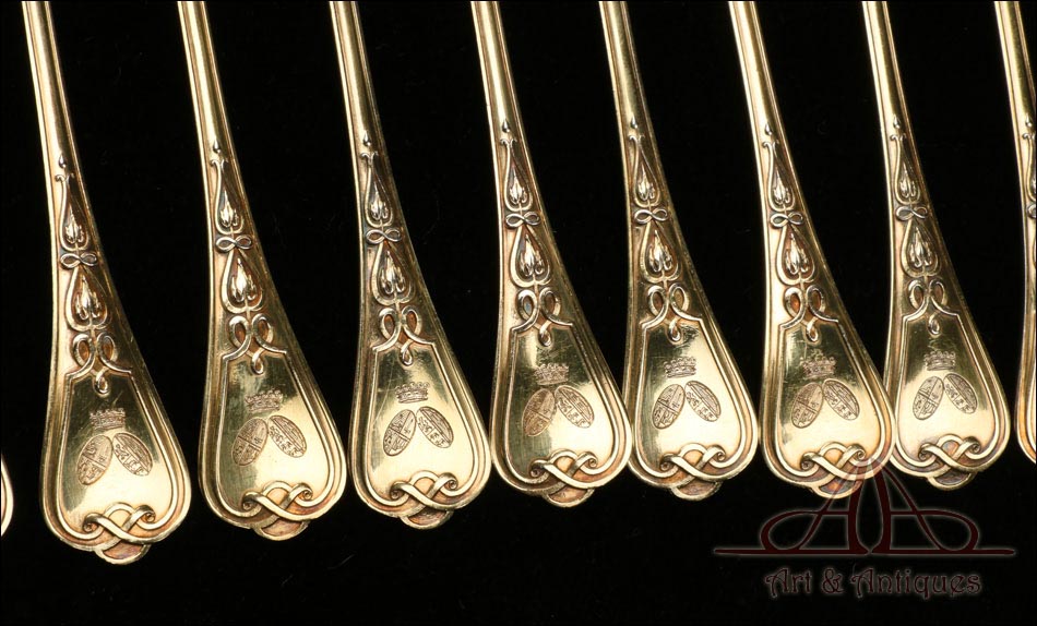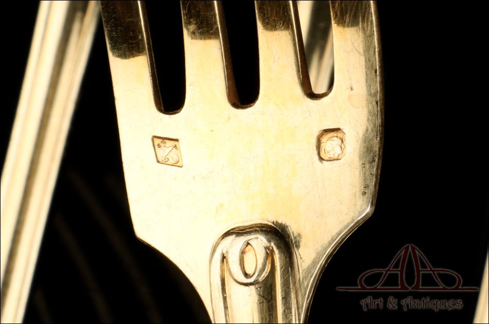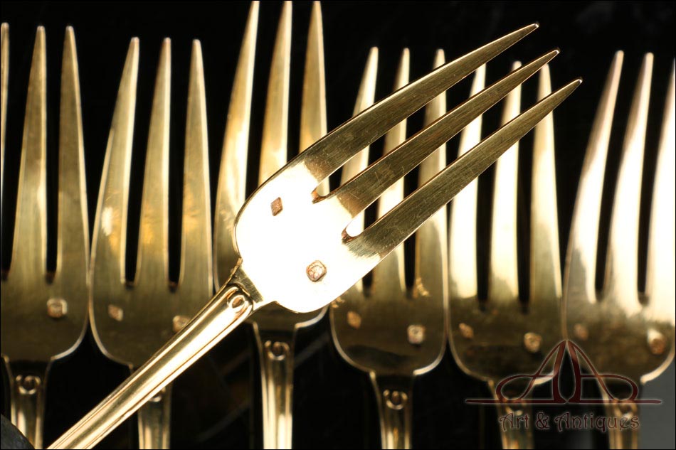 Espectacular cubertería antigua de plata dorada de la Casa Odiot, fabricada en París circa 1900 y completa. La cubertería está formada por 12 servicios de 8 cubiertos e incluye 4 saleros y 10 cubiertos para servir (110 piezas en total). Las piezas son de plata maciza, excepto un juego de cuchillos con hoja de acero y mango de plata. Se trata de cubiertos de gran belleza que crean un elegante y original efecto que llenará de encanto la mesa más elegante. Los cubiertos llevan el nombre ODIOT grabado en el canto, mientras que la tapa del estuche lleva encastrado un medallón de latón con un escudo y la corona condal.