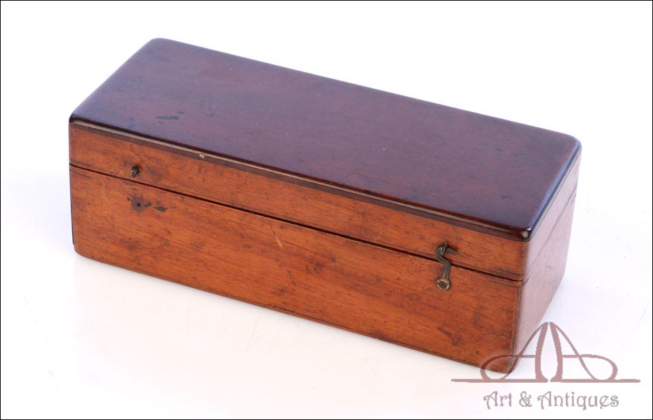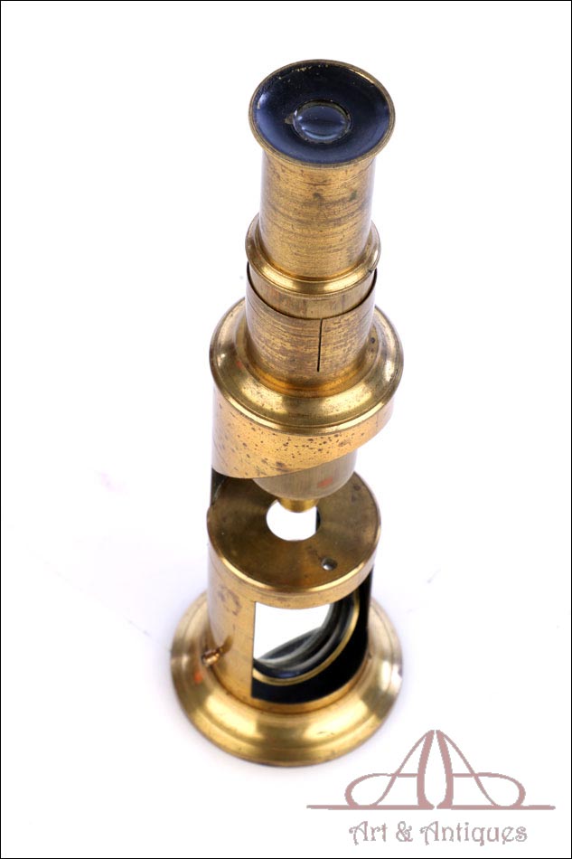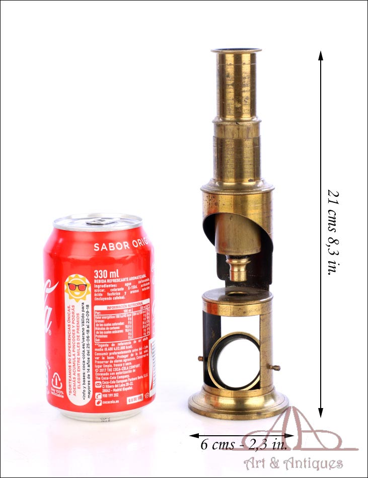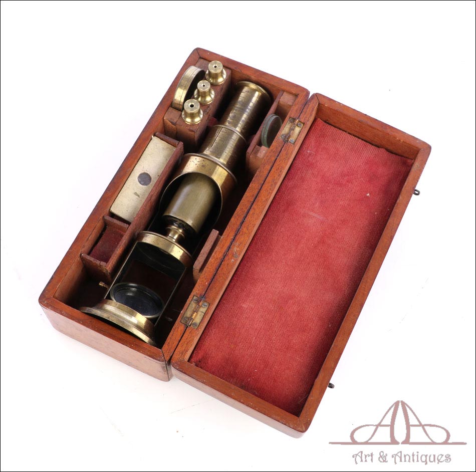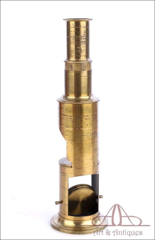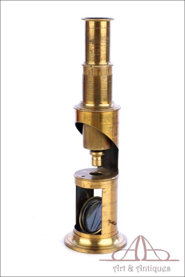 Antiguo microscopio de tambor con 4 objetivos, fabricado circa 1880 y en buen estado de conservación. Este singular aparato, completo y en funcionamiento, se presenta en su estuche original de madera de caoba, también en muy buenas condiciones. Está formado por un tubo de latón con lente, ocular y espejo y se puede emplear a día de hoy para visualizar muestras y preparados. Posiblemente proceda de Francia, si bien está sin firmar. El latón está bien conservado, con solo ligeros signos de desgaste producto del paso del tiempo y el uso. Este detalle aporta al instrumento una atractiva pátina de autenticidad. El estuche conserva el barniz original y el forro interior de tela roja, así como los compartimentos de madera destinados a mantener en orden las distintas piezas.