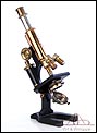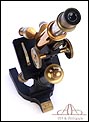 El microscopio lleva pie de herradura de metal negro y parte superior de latón. El latón conserva la laca protectora original de época, que aporta al metal una hermosa pátina característica de los instrumentos científicos antiguos. El sistema de cremallera de la torre está en excelente estado y se desliza con fluidez, al igual que todas las piezas móviles del aparato. El estuche de guardado, por su parte, es también el original y está fabricado en madera de caoba maciza. Lleva grabado el número de serie del microscopio y cuenta con compartimentos para organizar los accesorios, todos ellos en excelente estado.