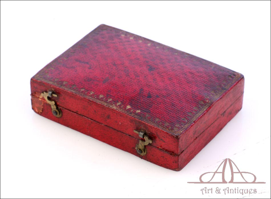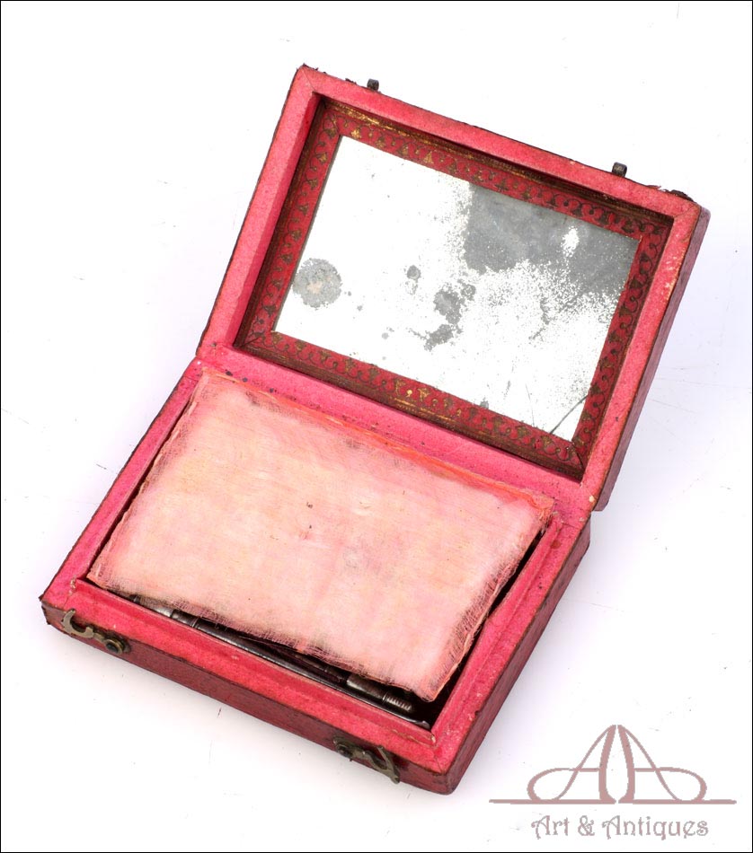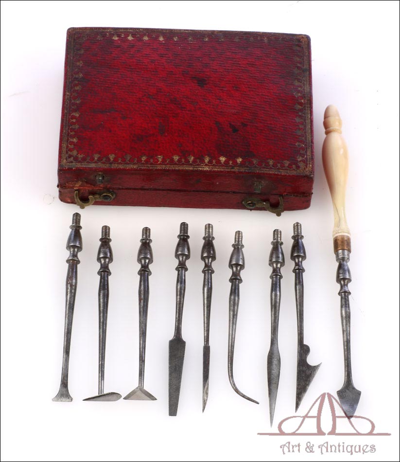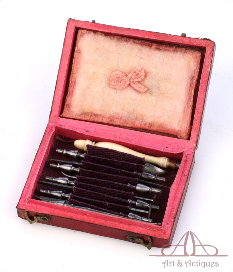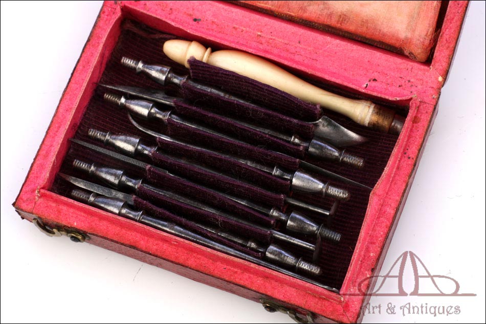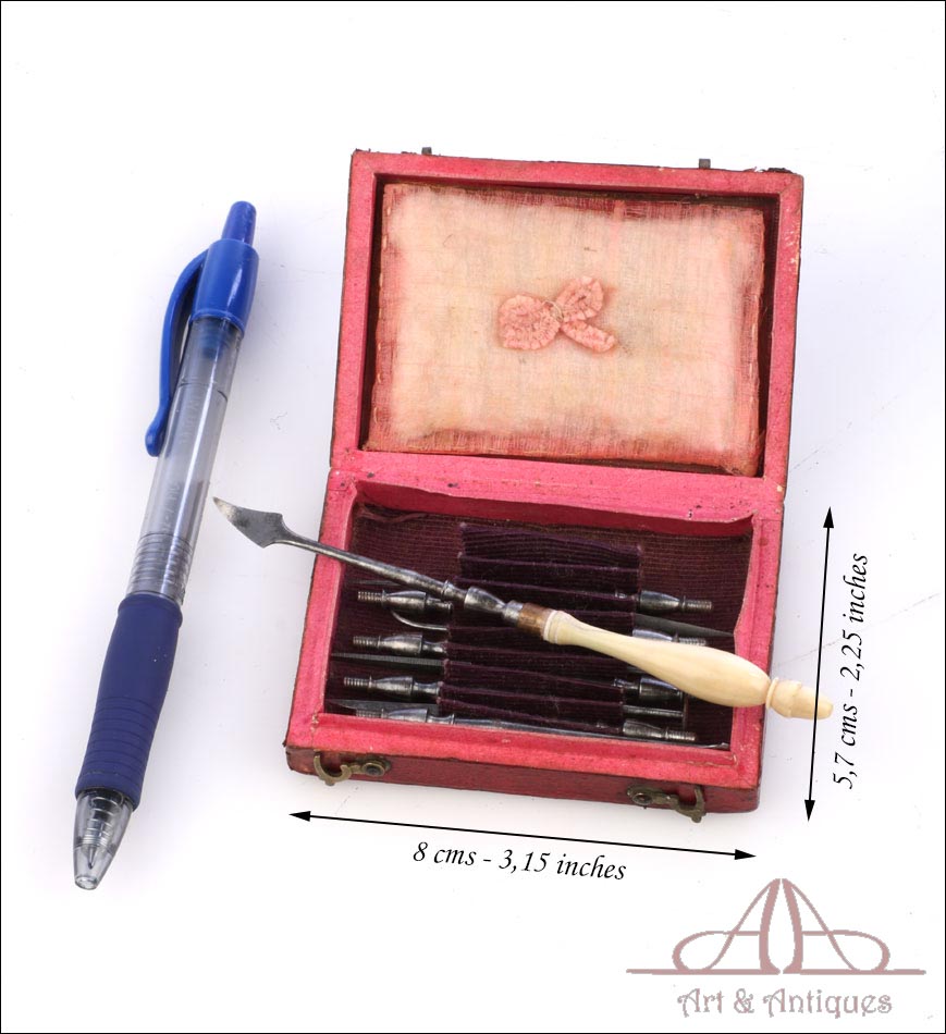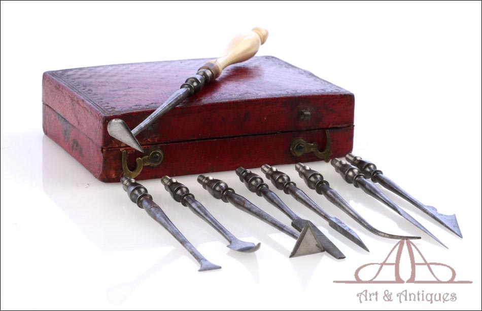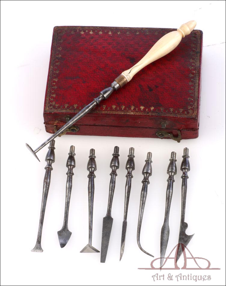 Antiguo estuche con instrumental para dentista, completo y fabricado circa 1800. El artículo consiste en varios instrumentos de acero acompañados de una empuñadura de marfil que sirve para todos ellos. Las partes se unen mediante rosca; todas las roscas están en buenas condiciones y permiten montar los instrumentos tal y como se hacía cuando fueron fabricados, hace más de 200 años. El instrumental se guarda en su estuche original de madera, revestido por el exterior en piel roja y en muy buen estado. En el interior, la tapa lleva una tabla forrada en satén acolchado, con un detalle bordado. Si retiramos la tabla encontraremos un espejo de época. En la caja hay una estructura de tela con separaciones, destinadas a mantener los instrumentos ordenados.