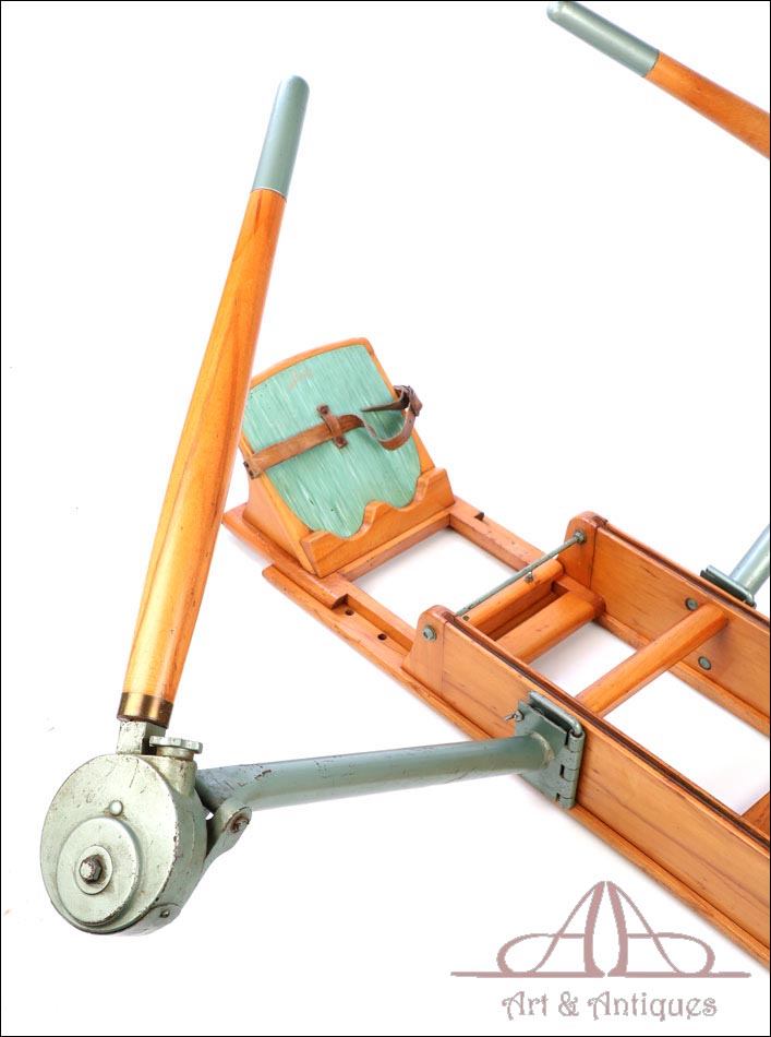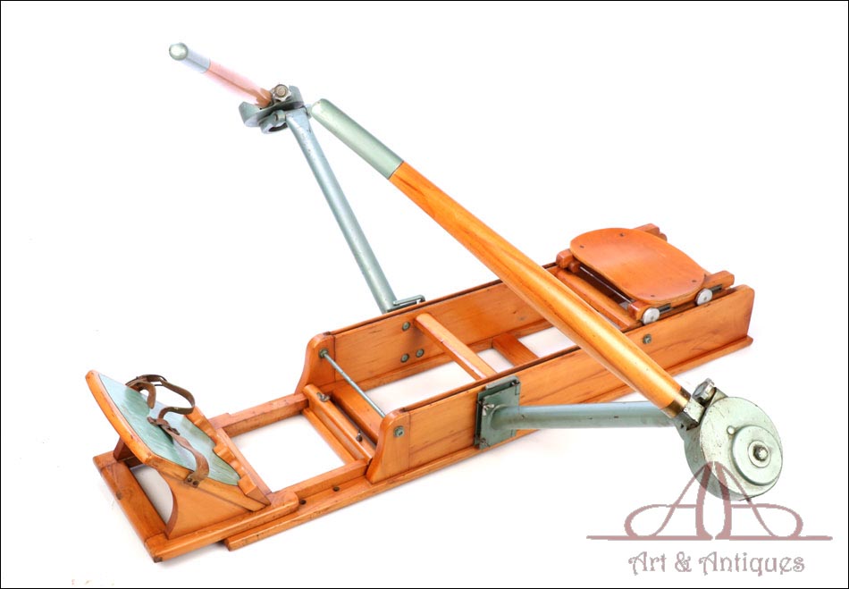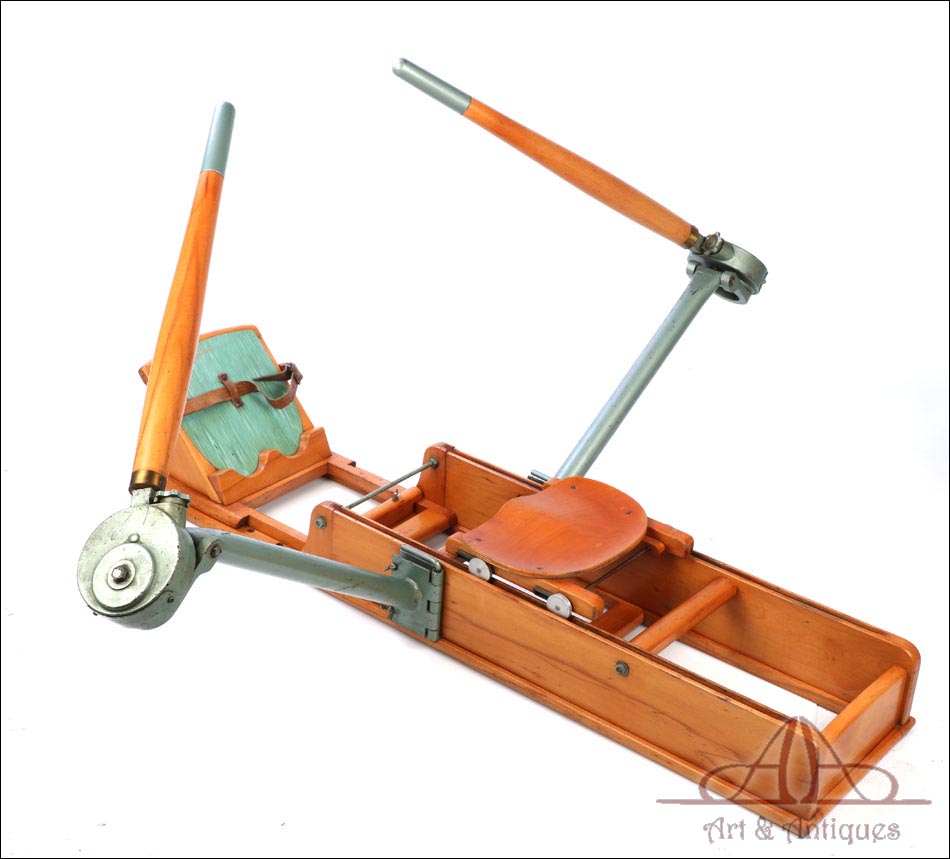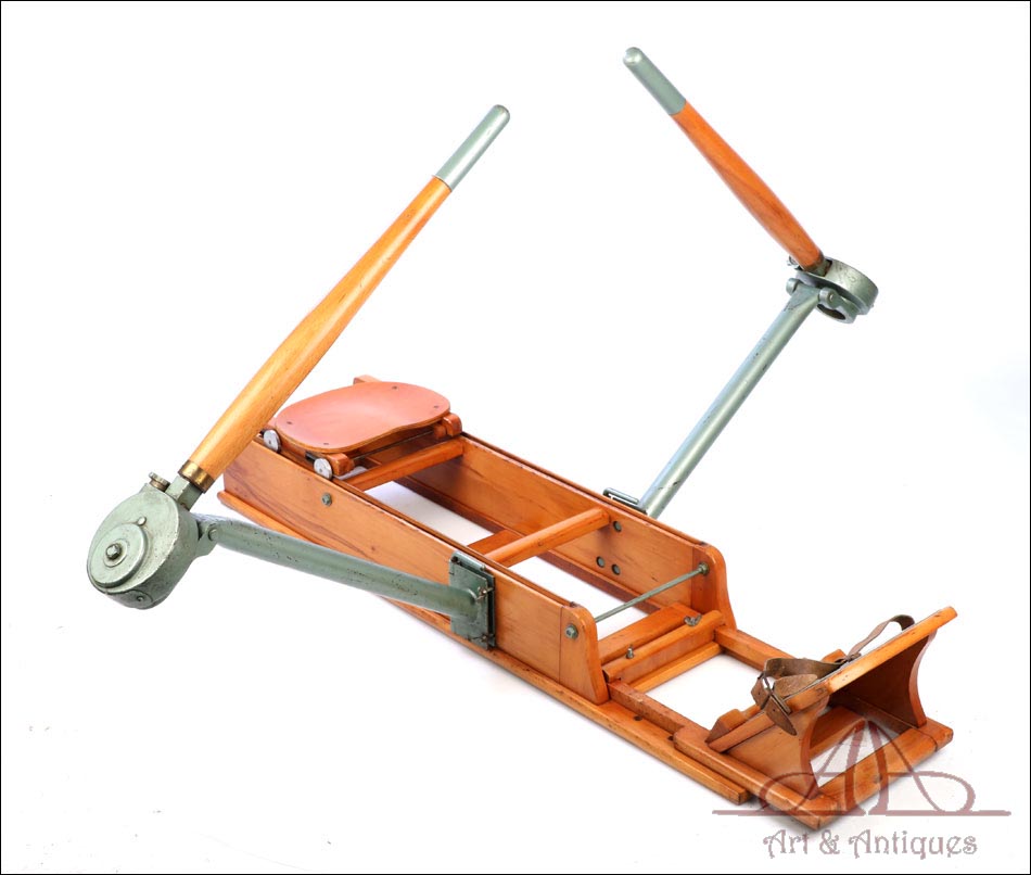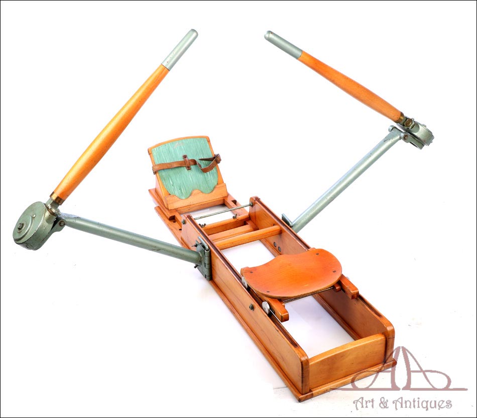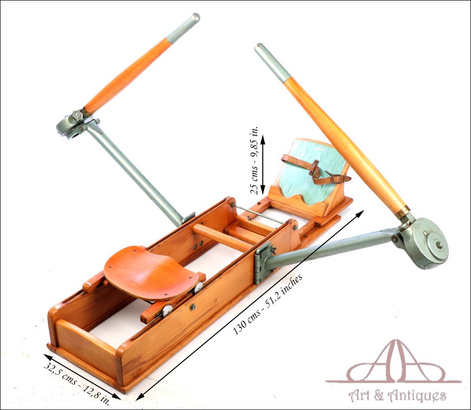 Rara y antigua máquina de remos italiana Lamborghini, fabricada en Italia en los años 40 y en magnífico estado de conservación. La máquina funciona perfectamente y se puede emplear para hacer ejercicio, siendo al mismo tiempo una hermosa antigüedad original de época. Está completamente realizada en madera, a excepción de las barras de metal que conectan los brazos a la base de la máquina. En la placa verde que reviste el reposapiés podemos ver la firma de la empresa fabricante, Lamborghini. No es probable que se trate de la famosa marca fabricante de automóviles, ya que este tipo de aparatos se dejaron de producir en 1947 y la empresa no se fundó hasta los años 60 del siglo XX. La estructura permite regular la resistencia de la máquina para realizar distintos tipos de entrenamiento. Las correas de cuero para sujetar los pies a la hora de hacer ejercicio son originales y se encuentran aún en estado de uso.