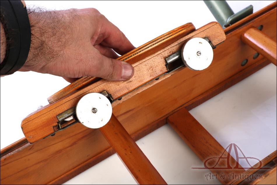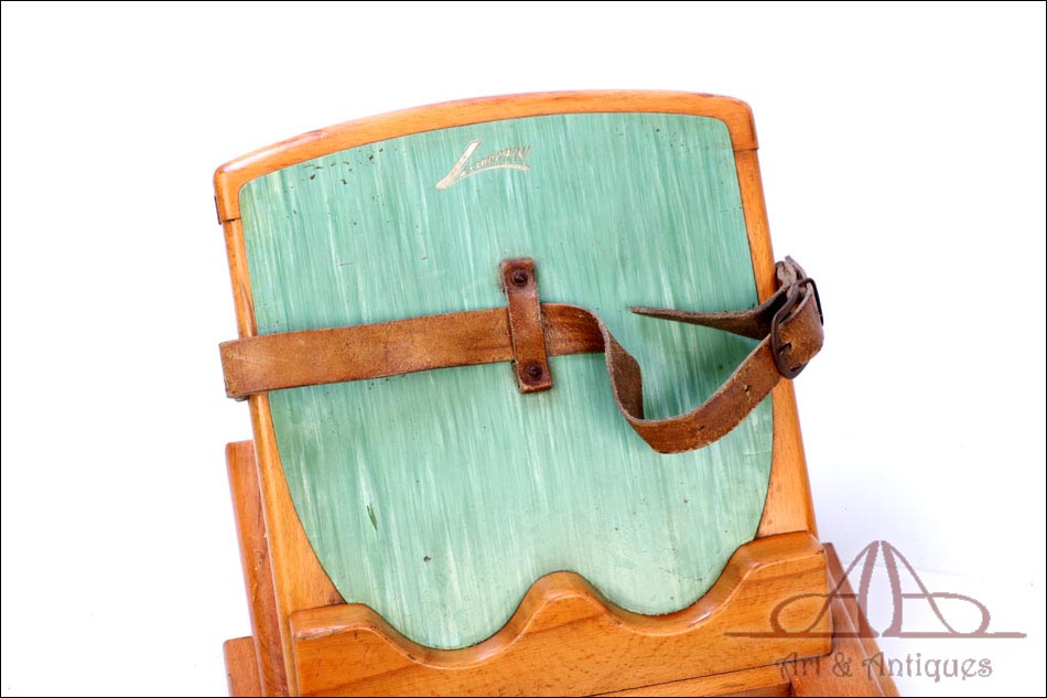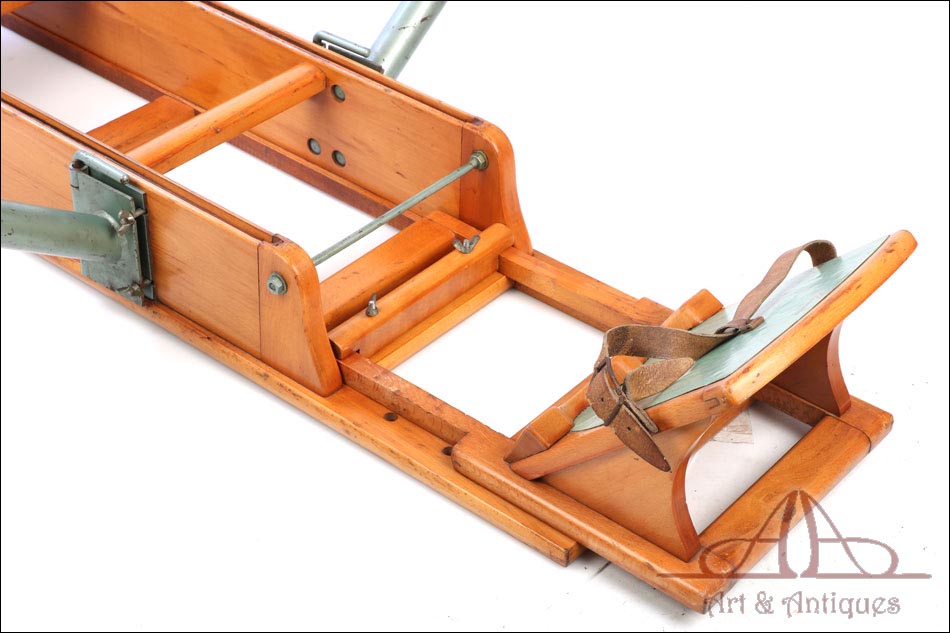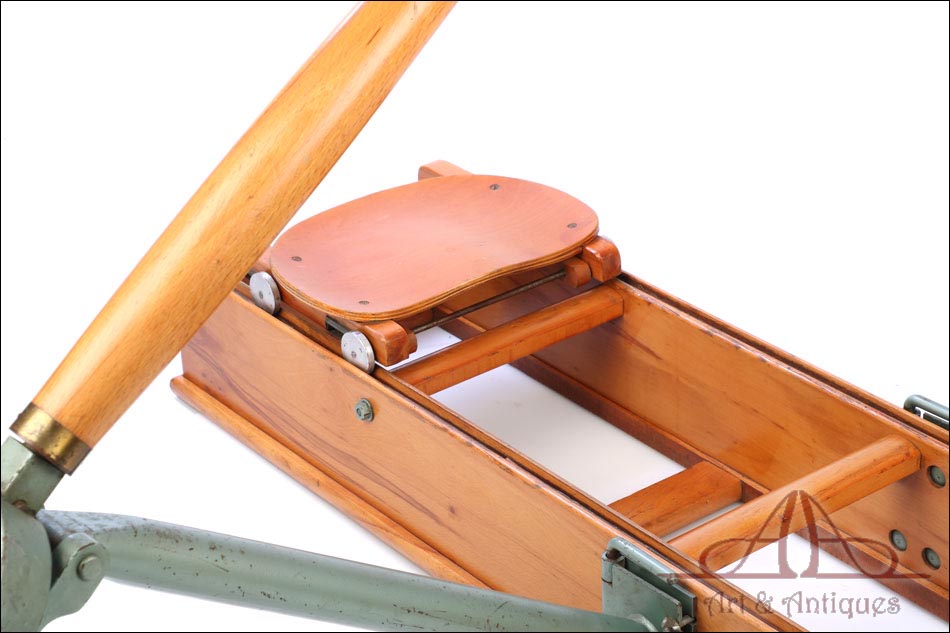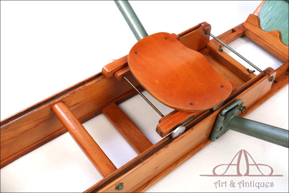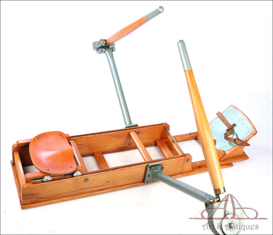 Rara y antigua máquina de remos italiana Lamborghini, fabricada en Italia en los años 40 y en magnífico estado de conservación. La máquina funciona perfectamente y se puede emplear para hacer ejercicio, siendo al mismo tiempo una hermosa antigüedad original de época. Está completamente realizada en madera, a excepción de las barras de metal que conectan los brazos a la base de la máquina. En la placa verde que reviste el reposapiés podemos ver la firma de la empresa fabricante, Lamborghini. No es probable que se trate de la famosa marca fabricante de automóviles, ya que este tipo de aparatos se dejaron de producir en 1947 y la empresa no se fundó hasta los años 60 del siglo XX. La estructura permite regular la resistencia de la máquina para realizar distintos tipos de entrenamiento. Las correas de cuero para sujetar los pies a la hora de hacer ejercicio son originales y se encuentran aún en estado de uso.