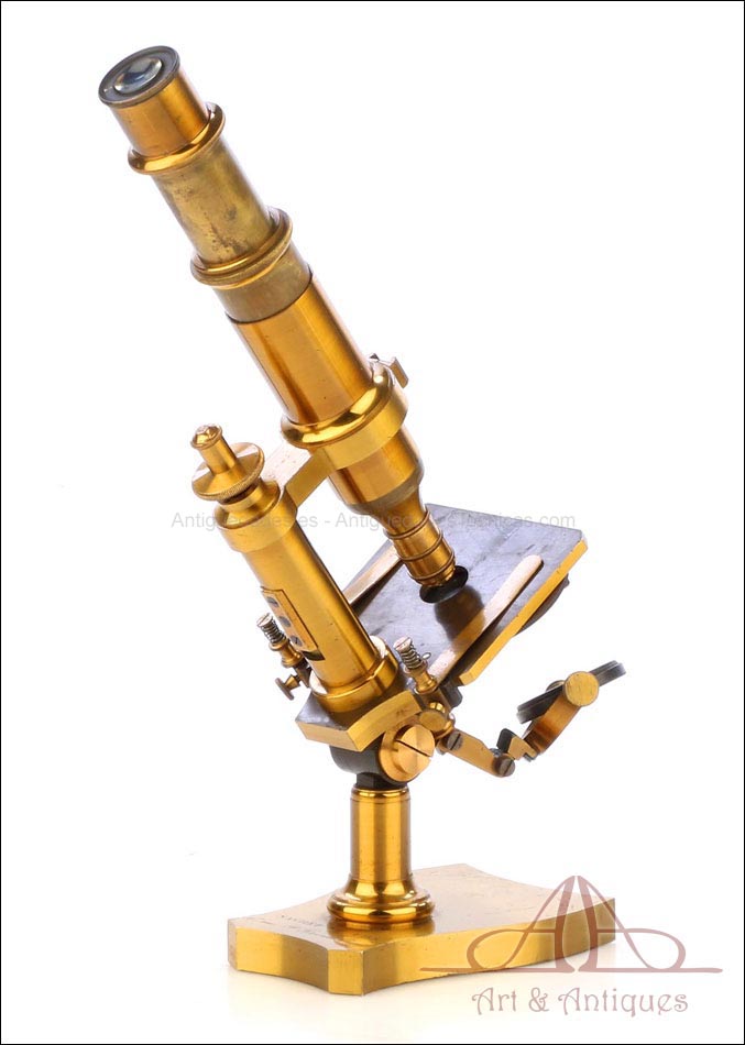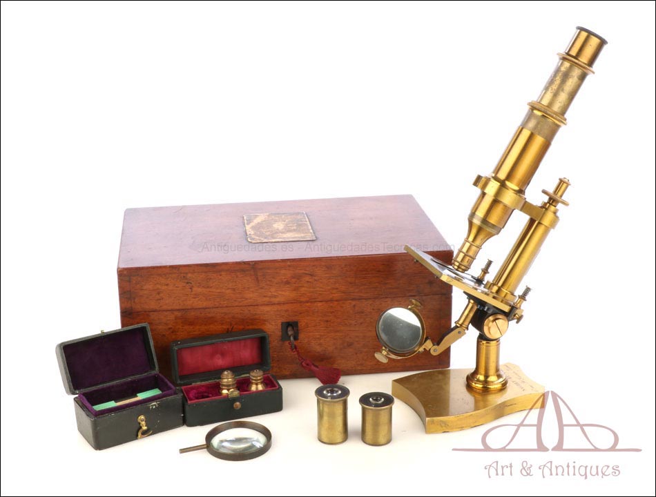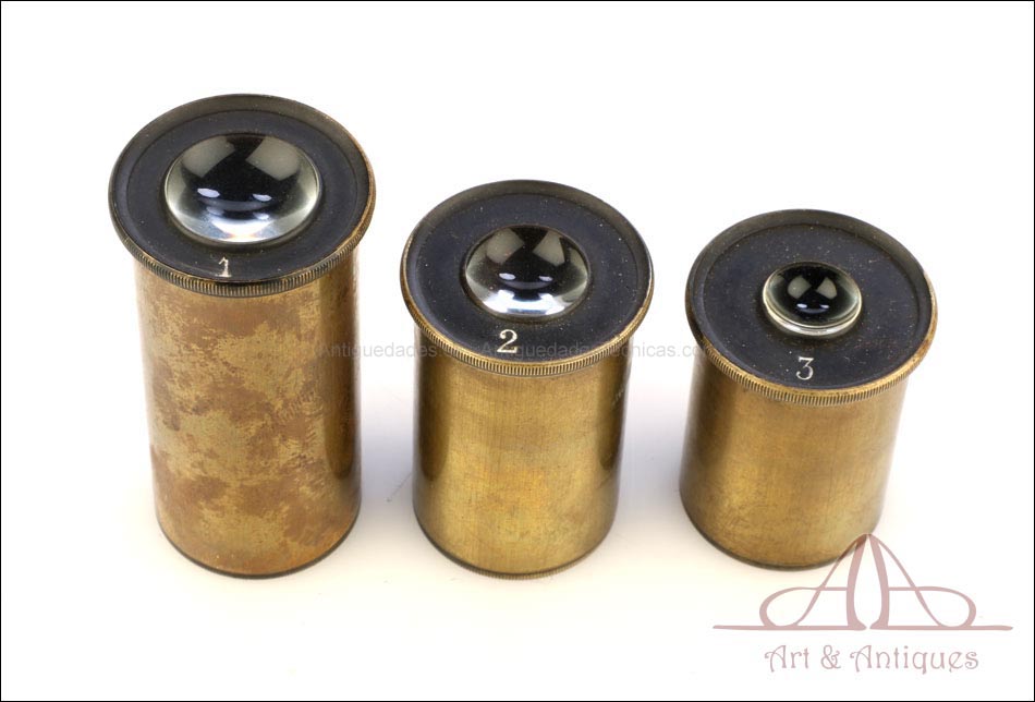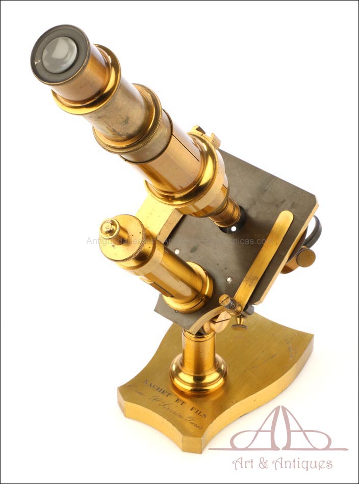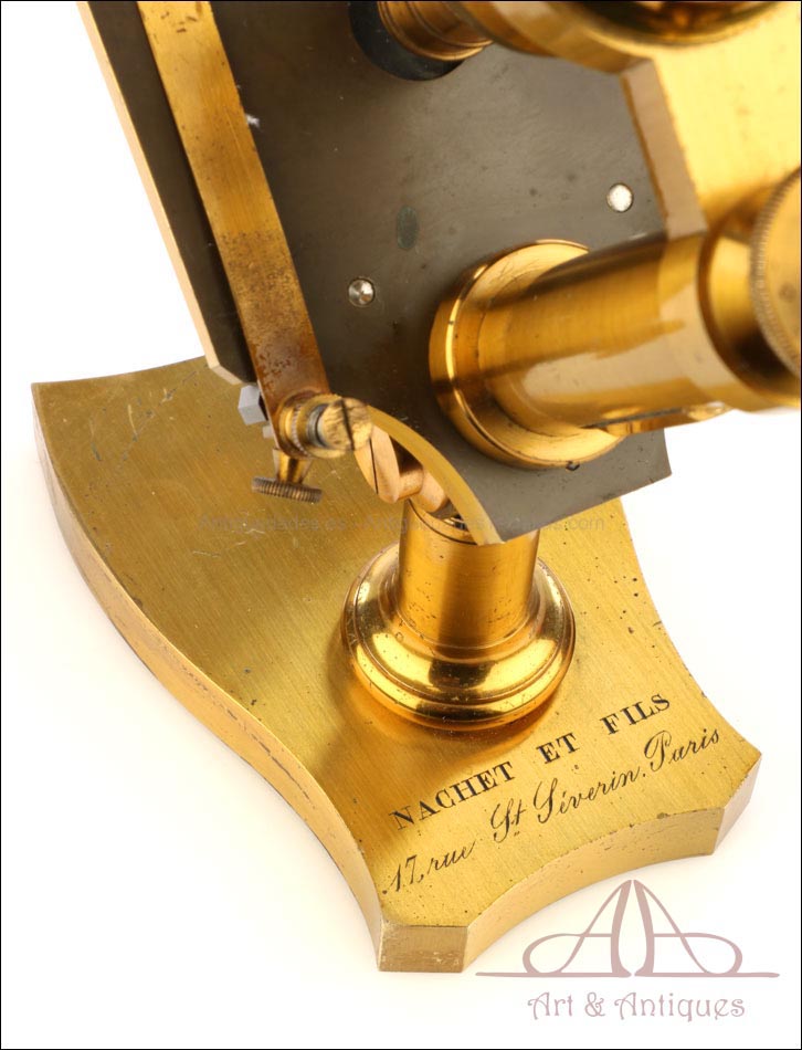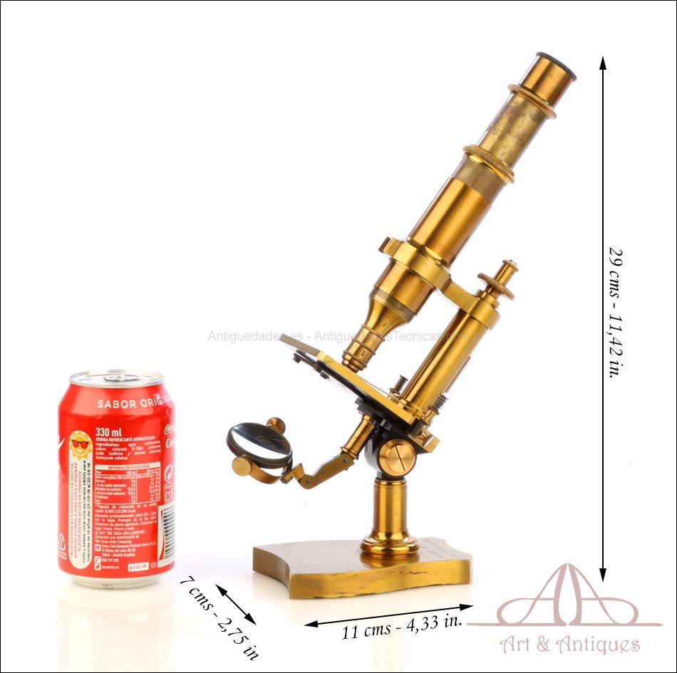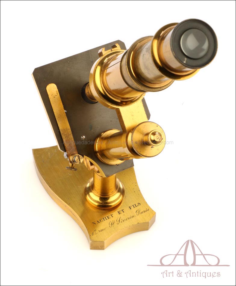 Precioso y antiguo microscopio Nachet modelo Moyen nº 9, fabricado en Francia circa 1890 y en muy buenas condiciones. El microscopio funciona muy bien, puede utilizarse y se presenta en su estuche original de época, bien conservado y con cerradura y llave originales. Va acompañado de dos estuches, uno con 3 oculares y otro con 2 objetivos. También incluye una cajita de preparados antiguos y una lente de concentración de luz, a la que le falta la pieza para insertarla en el tubo. El microscopio es de latón y conserva la laca protectora original de época; el metal está muy bien conservado, pulido y brillante. En la base podemos ver el nombre del fabricante, NACHET ET FILS, y la dirección en elegante letra cursiva. Se trata de un modelo muy raro que además incluye sistema de ajuste fino; este mecanismo está completo, pero parece estar atascado. Es muy probable que pueda volverse a utilizar tras someterlo a una limpieza profesional.