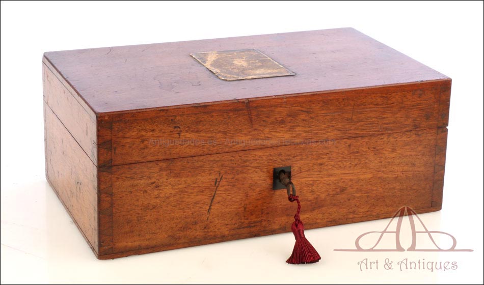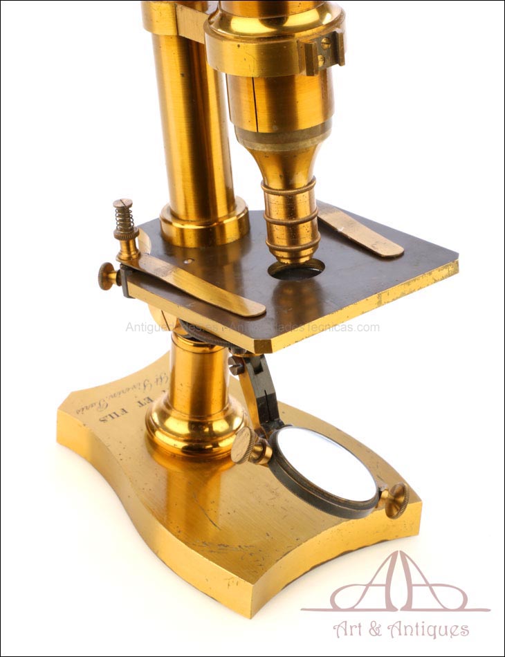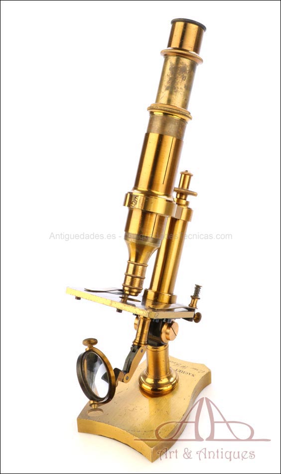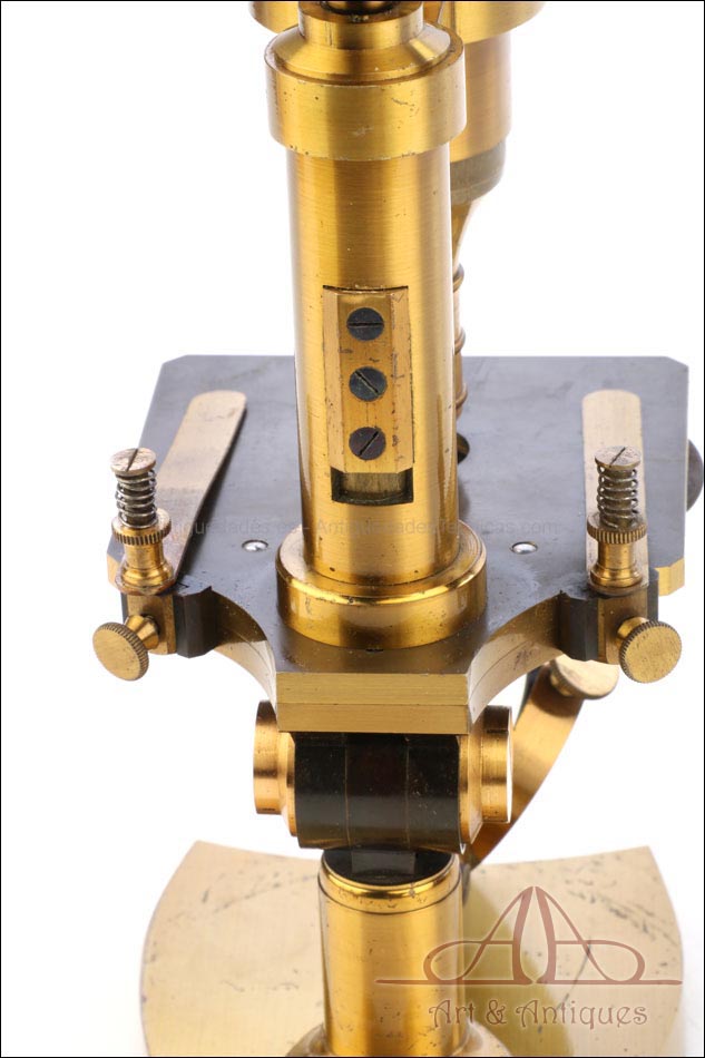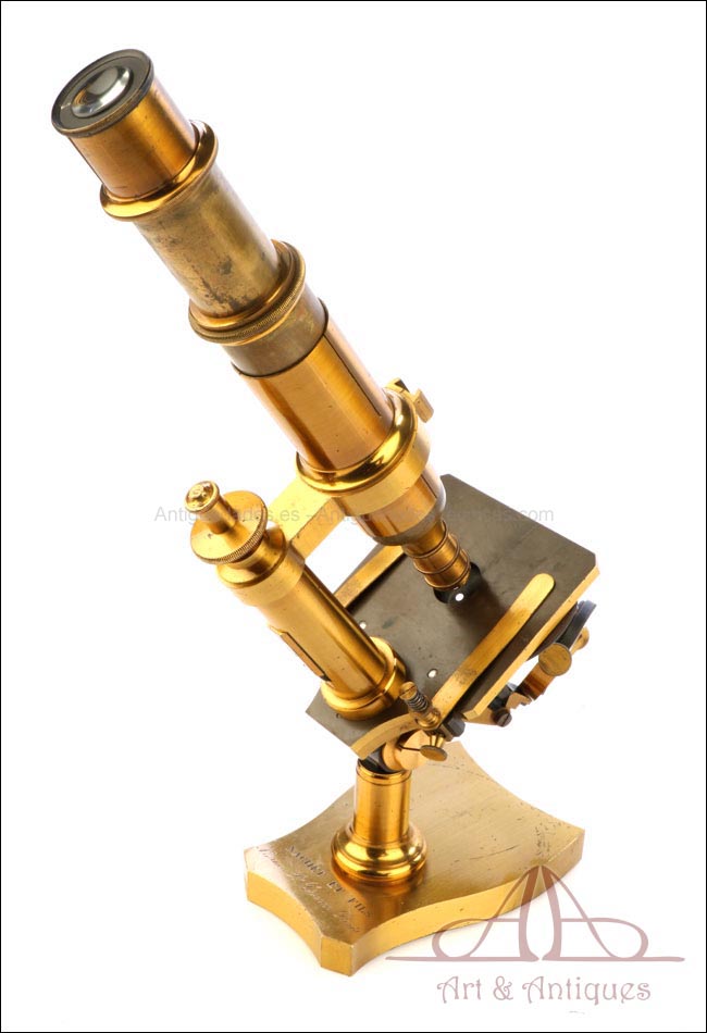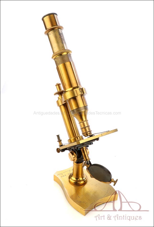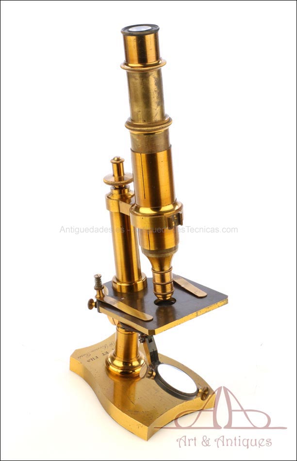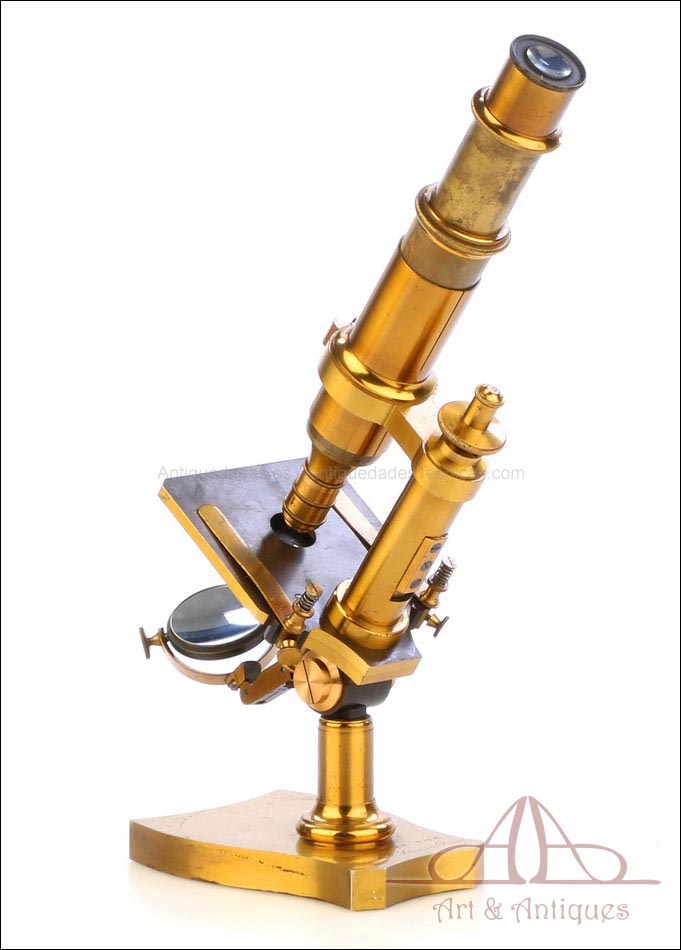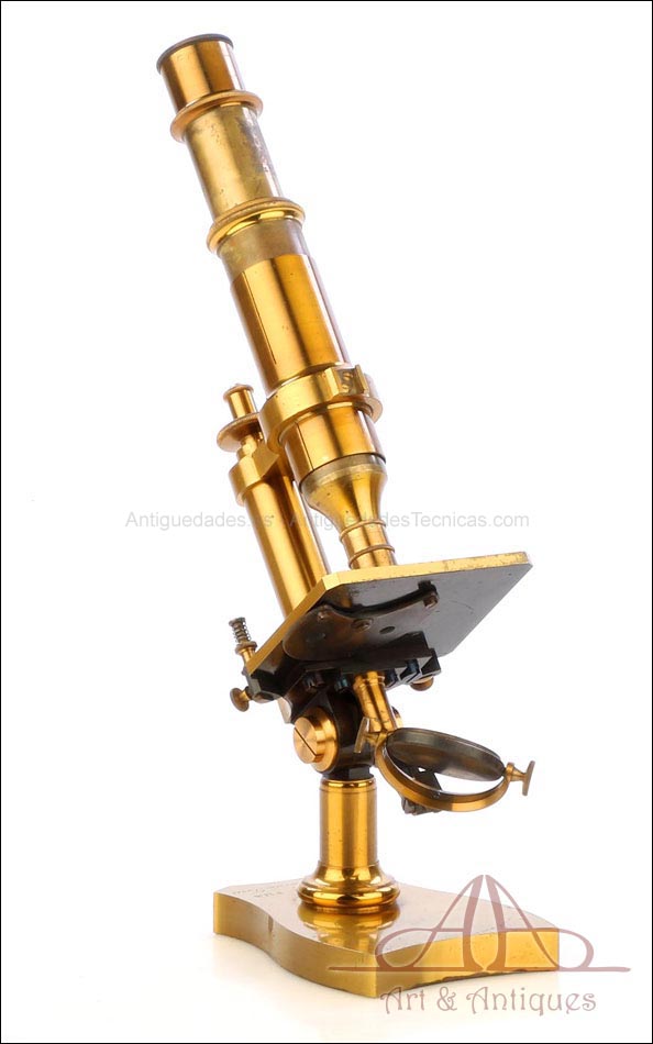 Precioso y antiguo microscopio Nachet modelo Moyen nº 9, fabricado en Francia circa 1890 y en muy buenas condiciones. El microscopio funciona muy bien, puede utilizarse y se presenta en su estuche original de época, bien conservado y con cerradura y llave originales. Va acompañado de dos estuches, uno con 3 oculares y otro con 2 objetivos. También incluye una cajita de preparados antiguos y una lente de concentración de luz, a la que le falta la pieza para insertarla en el tubo. El microscopio es de latón y conserva la laca protectora original de época; el metal está muy bien conservado, pulido y brillante. En la base podemos ver el nombre del fabricante, NACHET ET FILS, y la dirección en elegante letra cursiva. Se trata de un modelo muy raro que además incluye sistema de ajuste fino; este mecanismo está completo, pero parece estar atascado. Es muy probable que pueda volverse a utilizar tras someterlo a una limpieza profesional.