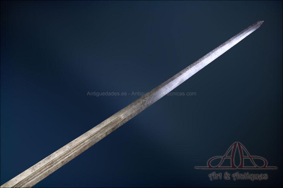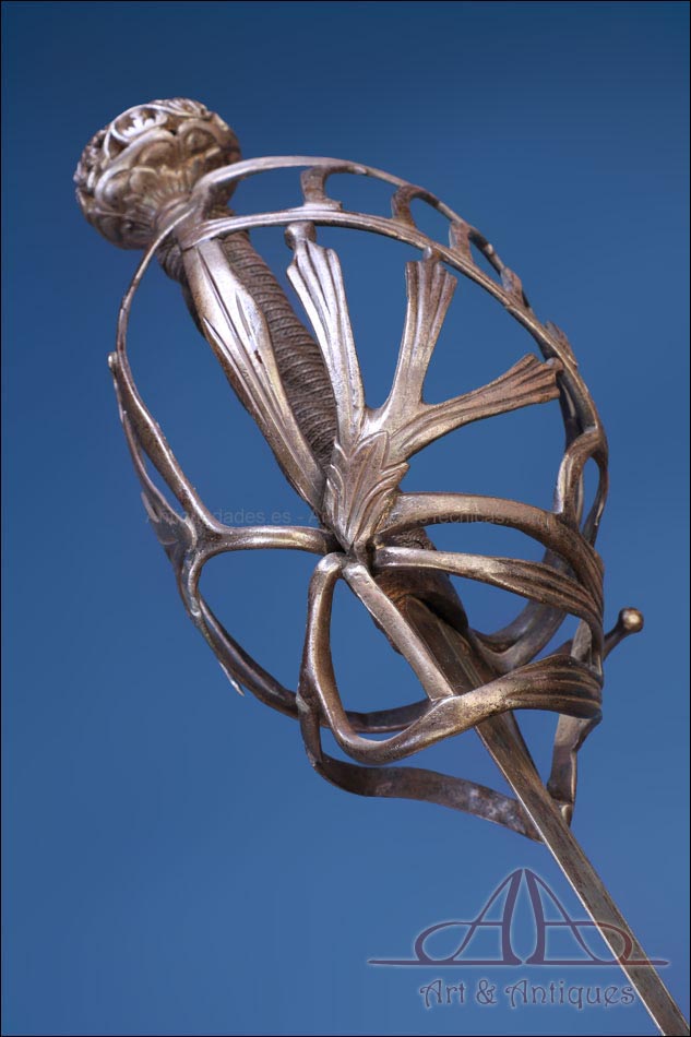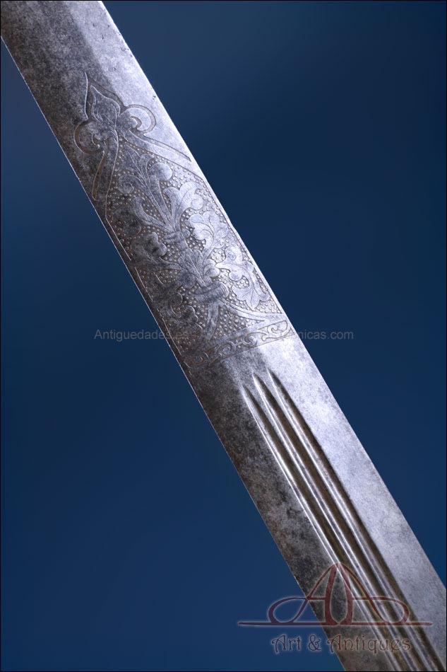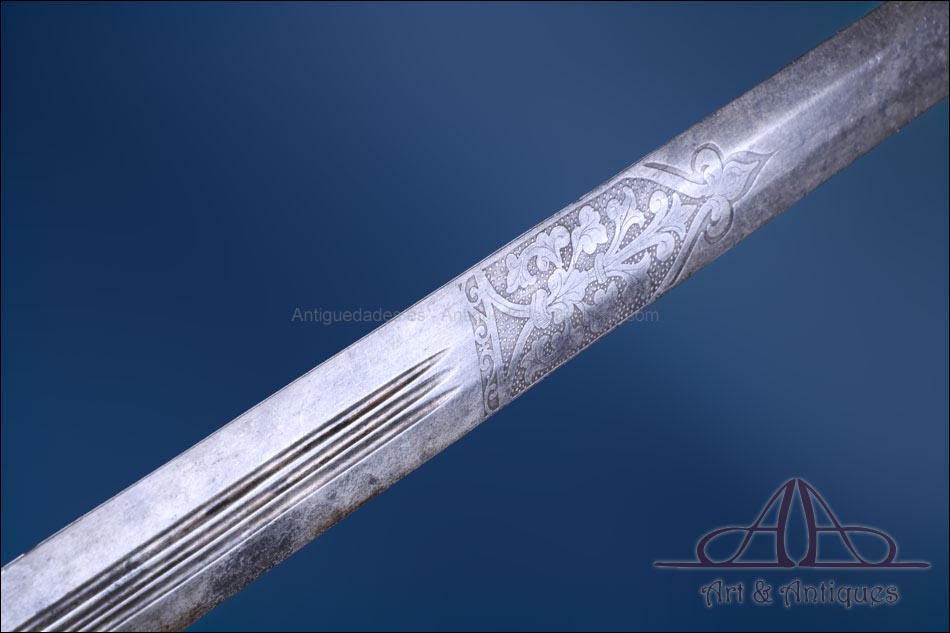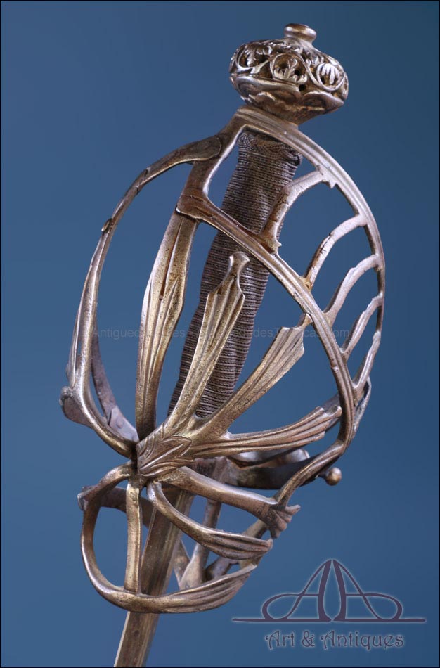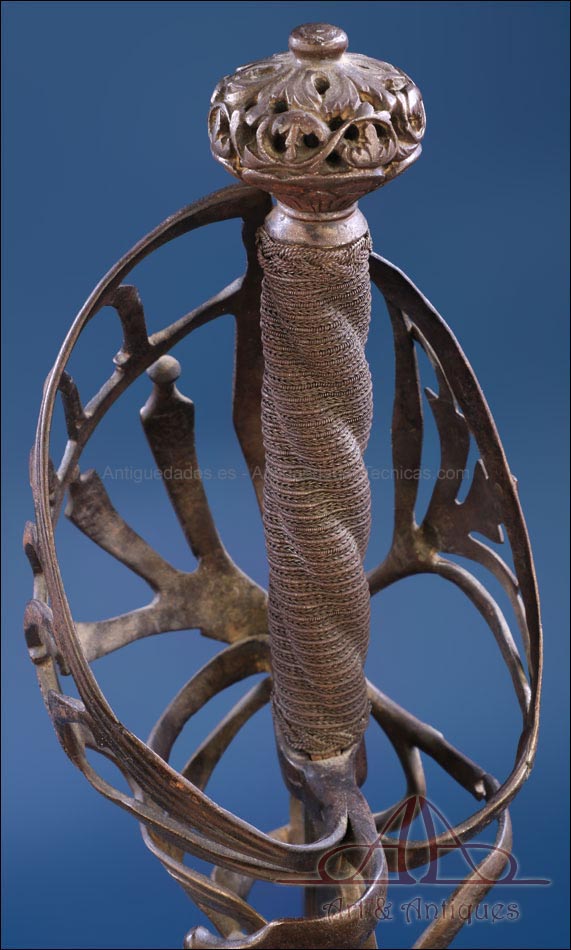 Antigua espada de lazo italiana (schiavona) fabricada en Italia circa 1800 y en excelentes condiciones. Estas espadas se fabricaban en Venecia; su nombre deriva de los Schiavoni, mercenarios procedentes de lo que hoy conocemos como Macedonia, Albania y Serbia-Montenegro que vendían sus servicios a la ciudad de Venecia, y a otras ciudades italianas (aunque en menor medida). La espada está fabricada íntegramente en acero y llama la atención por su bella empuñadura, cuyos gavilanes envolventes dan nombre al modelo (de lazo) y protegen la mano. Este tipo de espadas fueron las precursoras del florete. La que vemos en las imágenes muestra un estilizado diseño de hojas en el guardamano, con puño salomónico estriado y pomo en celosía. La hoja es larga y recta y lleva una hermosa decoración grabada, de inspiración medieval.