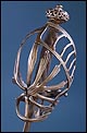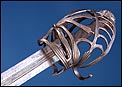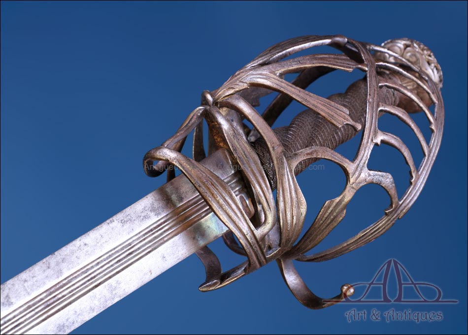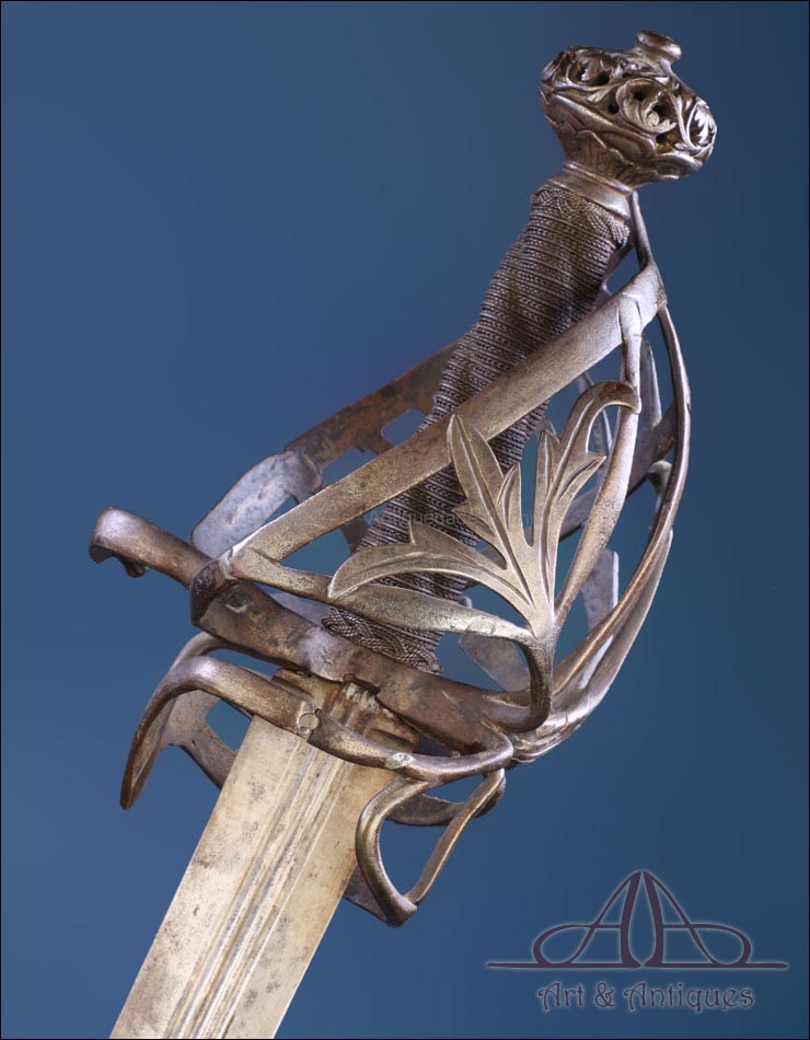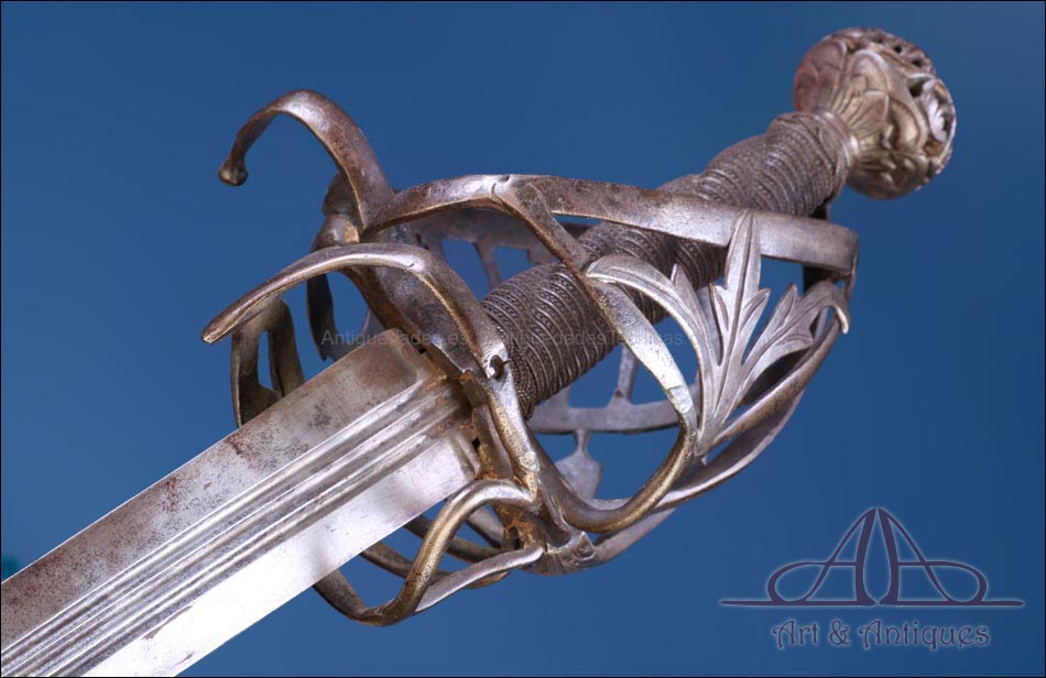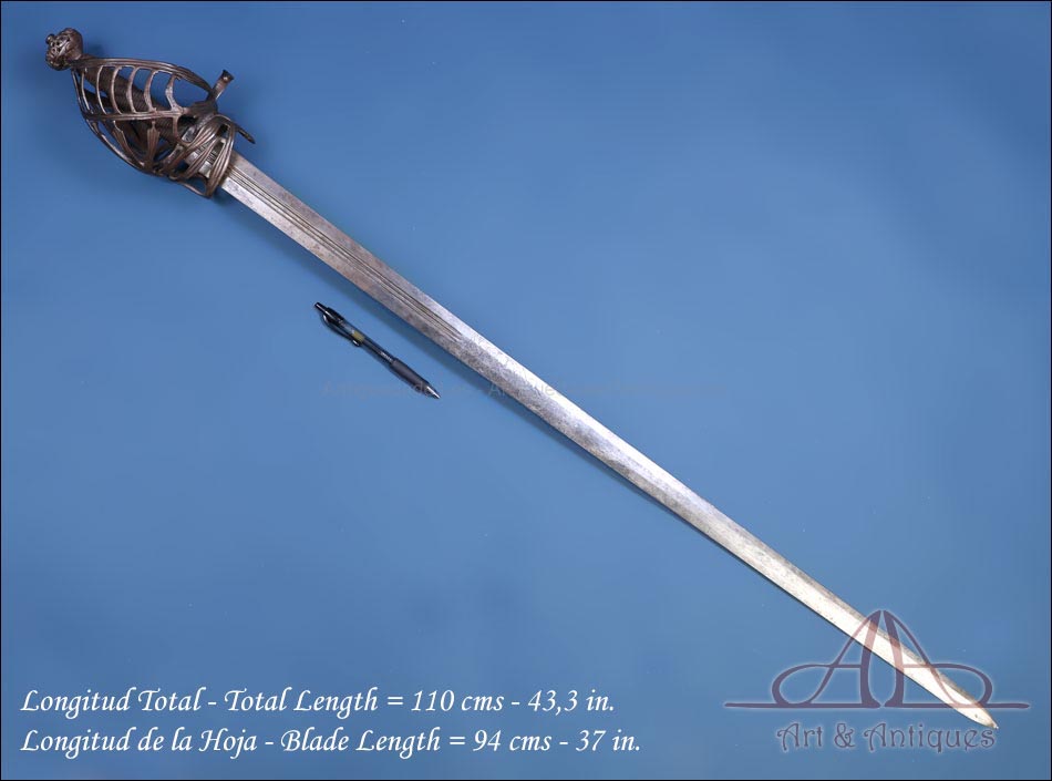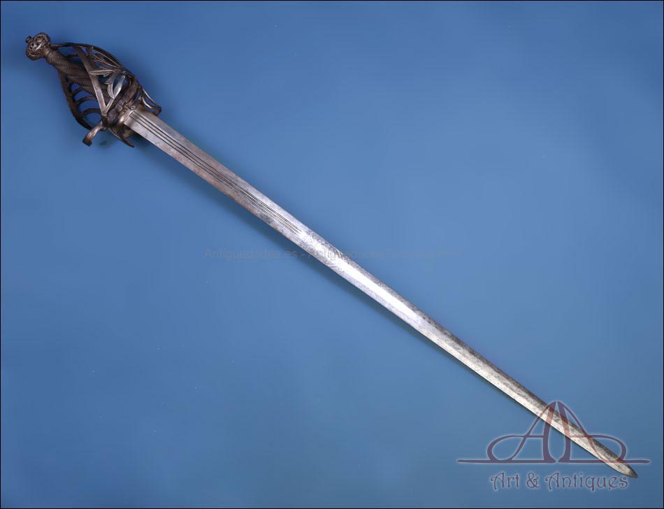 Antigua espada de lazo italiana (schiavona) fabricada en Italia circa 1800 y en excelentes condiciones. Estas espadas se fabricaban en Venecia; su nombre deriva de los Schiavoni, mercenarios procedentes de lo que hoy conocemos como Macedonia, Albania y Serbia-Montenegro que vendían sus servicios a la ciudad de Venecia, y a otras ciudades italianas (aunque en menor medida). La espada está fabricada íntegramente en acero y llama la atención por su bella empuñadura, cuyos gavilanes envolventes dan nombre al modelo (de lazo) y protegen la mano. Este tipo de espadas fueron las precursoras del florete. La que vemos en las imágenes muestra un estilizado diseño de hojas en el guardamano, con puño salomónico estriado y pomo en celosía. La hoja es larga y recta y lleva una hermosa decoración grabada, de inspiración medieval.