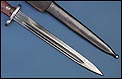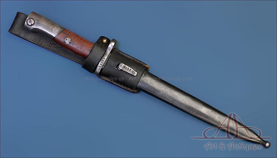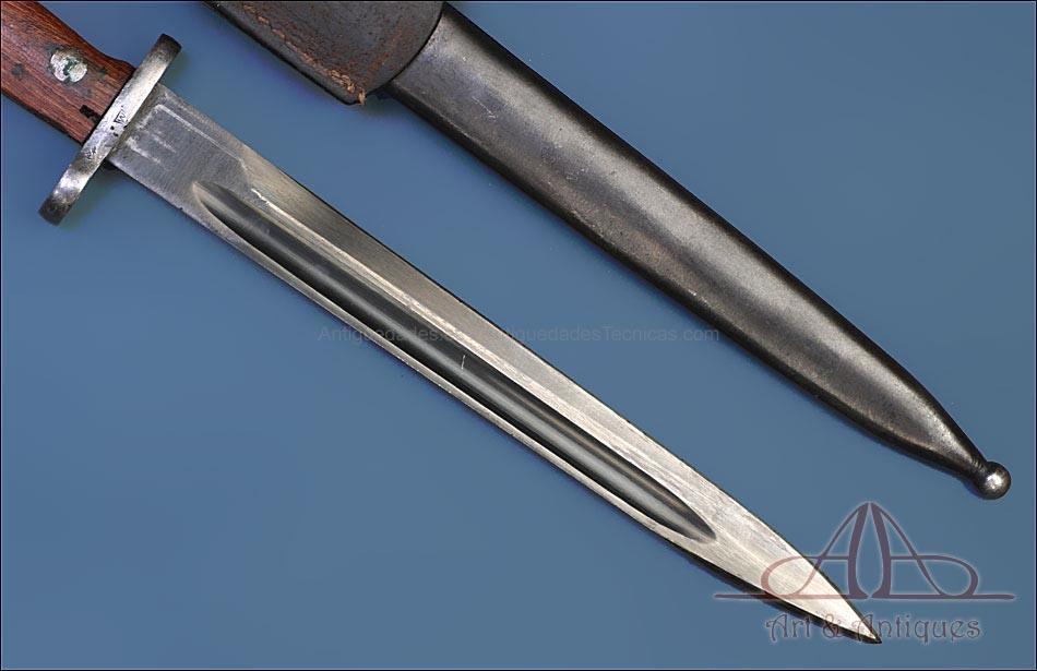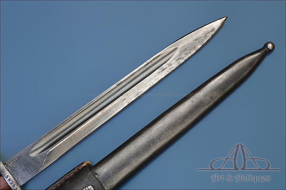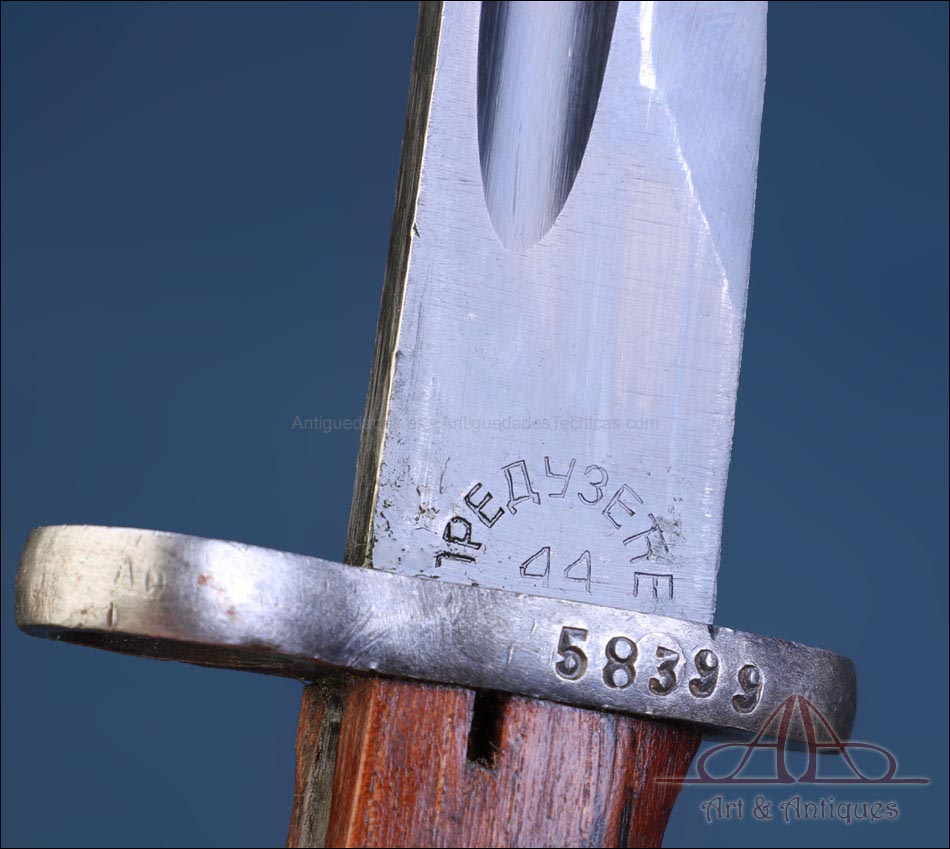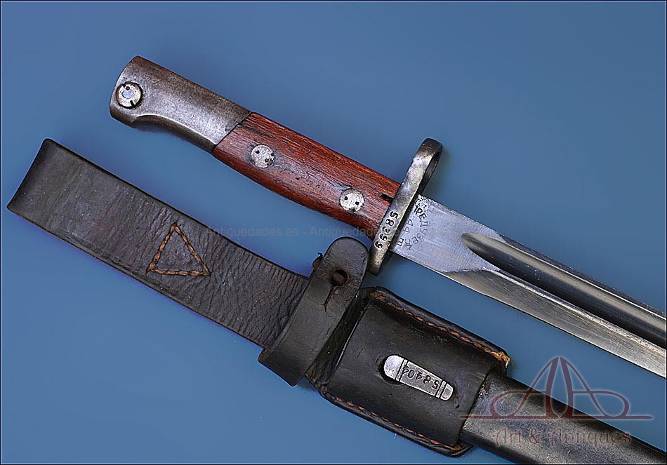 Antigua bayoneta yugoslava mod. 1924 fabricada a finales de los años 40. Se trata de una pieza de museo, completa y en muy buenas condiciones. La bayoneta se acompaña de una vaina original de la época, cada una con su correspondiente número de serie. Los números son casi coincidentes: la bayoneta está marcada con el 58339 en la cruz, mientras que la vaina lleva el 58404 en una pieza de metal fijada al brocal de cuero. La bayoneta conserva la hoja de acero en excelente estado, al igual que el puño con cachas de madera. En la parte donde la hoja se une a la empuñadura podemos ver una inscripción en letras cirílicas, dispuesta en semicírculo y acompañada del número 44 que indica que fue fabricada en la Fábrica Estatal númeo 44. Por su parte, la vaina es de metal negro y lleva una pieza de cuero unida al brocal para colgar la bayoneta del uniforme. El cuero está magníficamente conservado, con las costuras sólidas y regulares y la superficie uniforme.