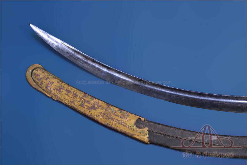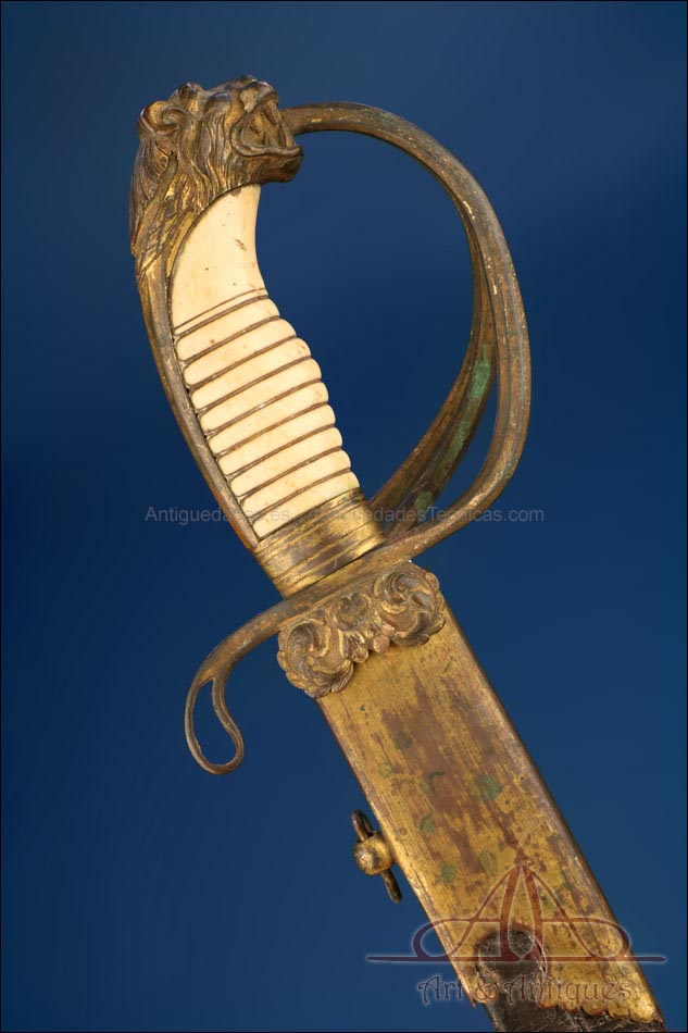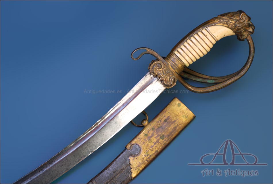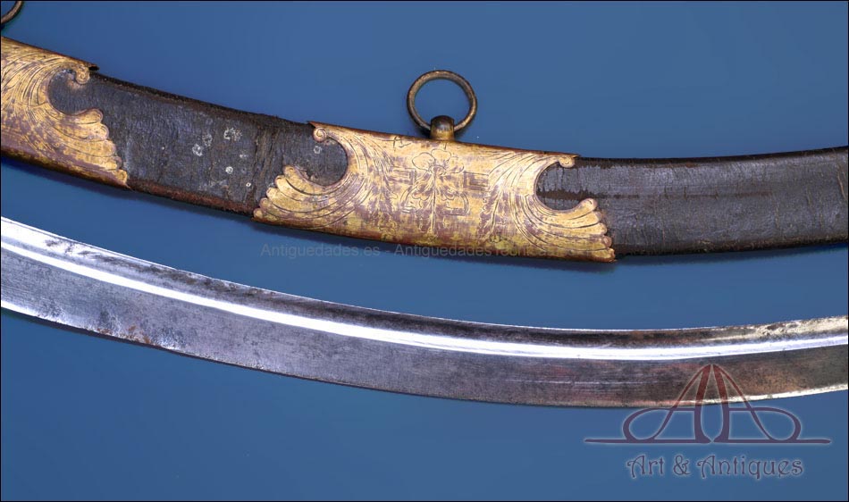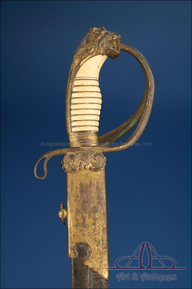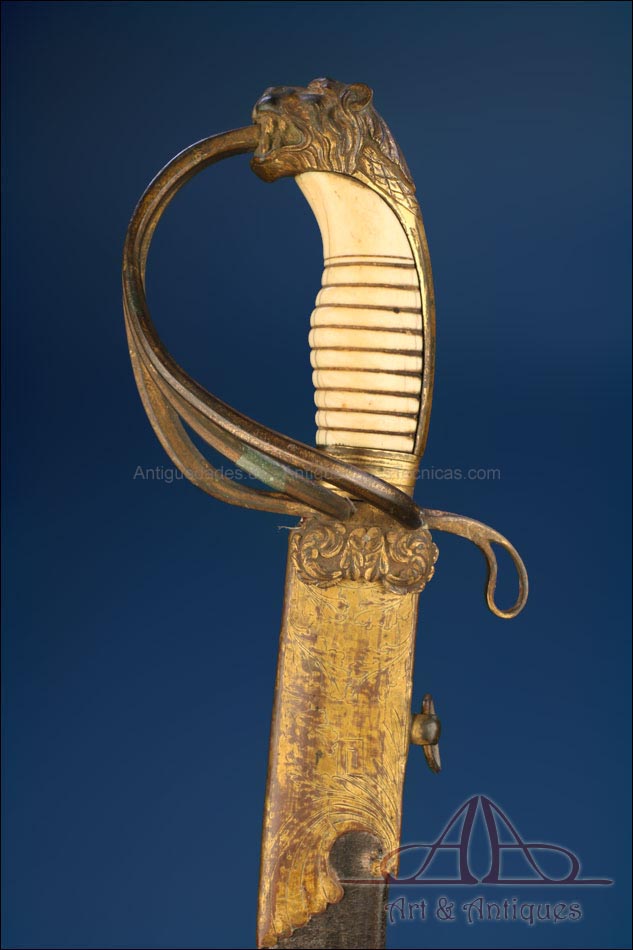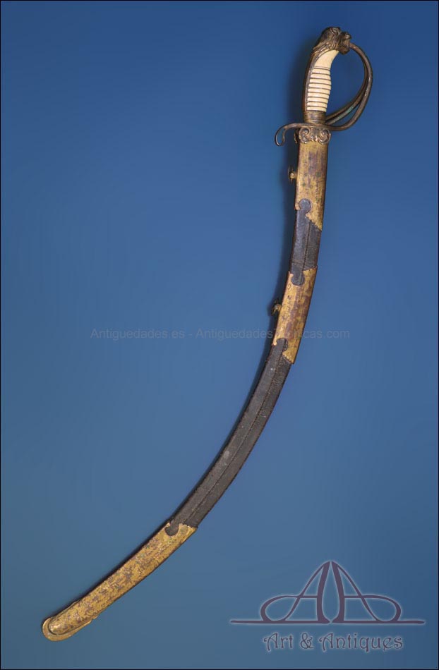 Se trata de un arma original y auténtica, de gran potencial decorativo por su belleza. La hoja está muy bien conservada y se muestra brillante, con una o dos ligeras muescas en el borde que nos hablan de su pasado en combate. La empuñadura es de metal dorado y tiene un precioso diseño curvado, con guardamano y cruz en una sola pieza dividida en ramales. El pomo tiene forma de cabeza de león y remata un puño de hueso con estrías grabadas para mejorar el agarre. La vaina que acompaña al sable es de cuero marrón oscuro y lleva contera, brocal y refuerzo central de metal dorado. Tanto en la empuñadura como en la vaina, el acabado dorado del metal está desvaído por el paso del tiempo: lejos de suponer un defecto, este detalle aporta una atractiva pátina de antigüedad al sable. La vaina lleva decoración incisa por la parte frontal.