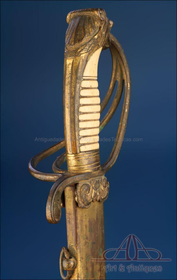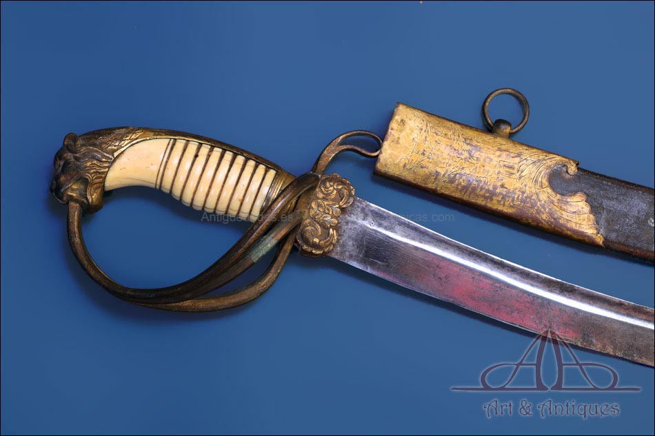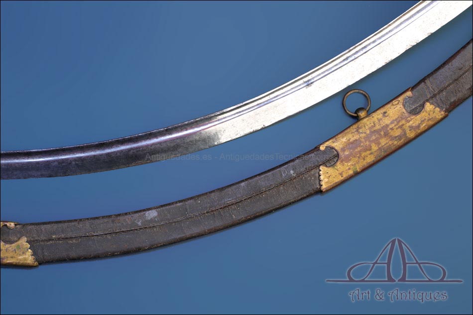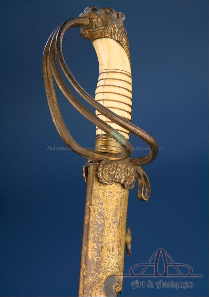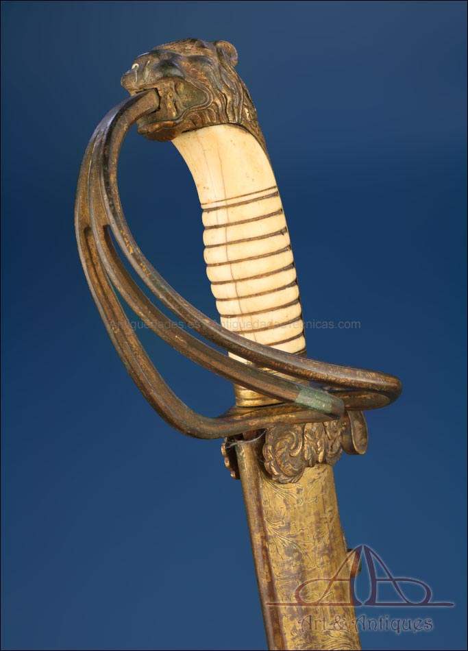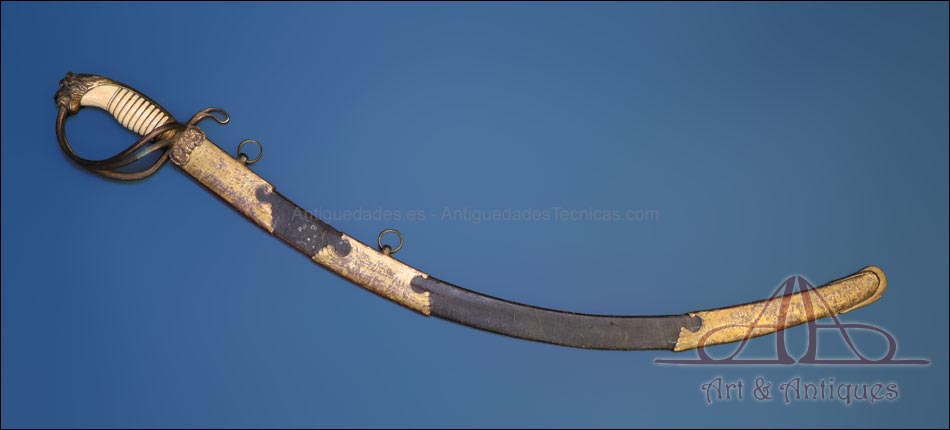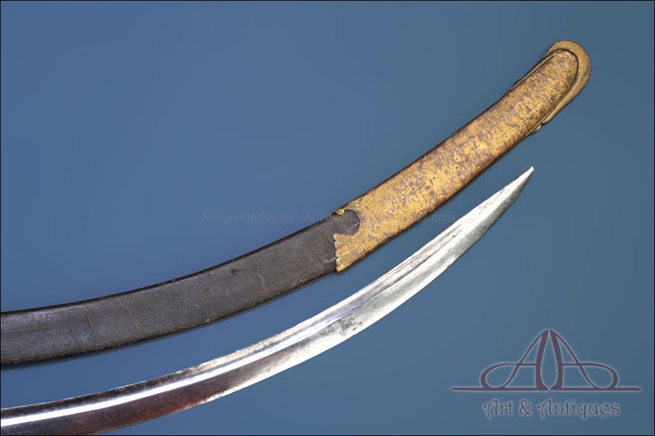 Se trata de un arma original y auténtica, de gran potencial decorativo por su belleza. La hoja está muy bien conservada y se muestra brillante, con una o dos ligeras muescas en el borde que nos hablan de su pasado en combate. La empuñadura es de metal dorado y tiene un precioso diseño curvado, con guardamano y cruz en una sola pieza dividida en ramales. El pomo tiene forma de cabeza de león y remata un puño de hueso con estrías grabadas para mejorar el agarre. La vaina que acompaña al sable es de cuero marrón oscuro y lleva contera, brocal y refuerzo central de metal dorado. Tanto en la empuñadura como en la vaina, el acabado dorado del metal está desvaído por el paso del tiempo: lejos de suponer un defecto, este detalle aporta una atractiva pátina de antigüedad al sable. La vaina lleva decoración incisa por la parte frontal.
