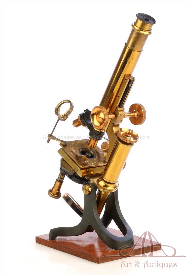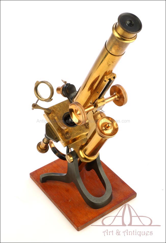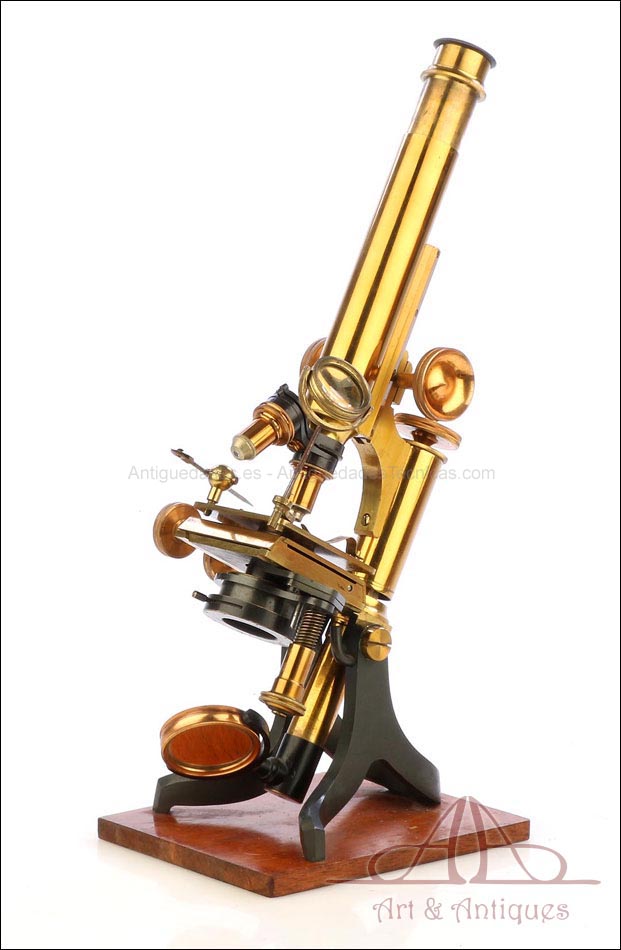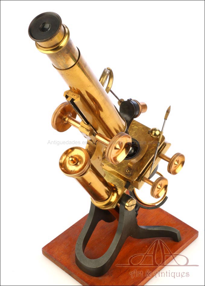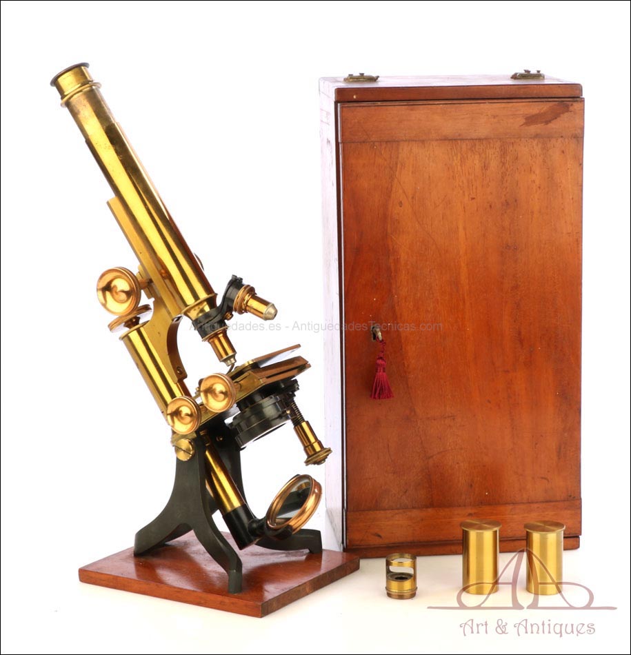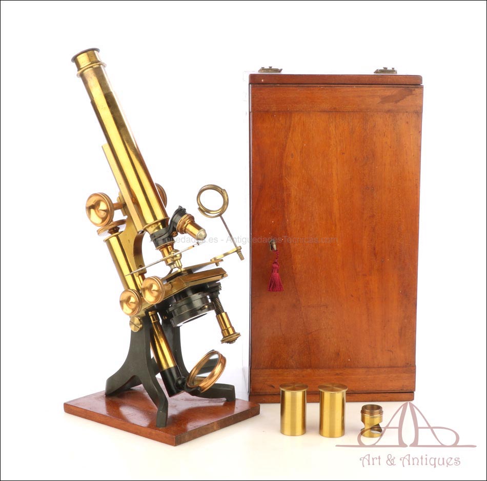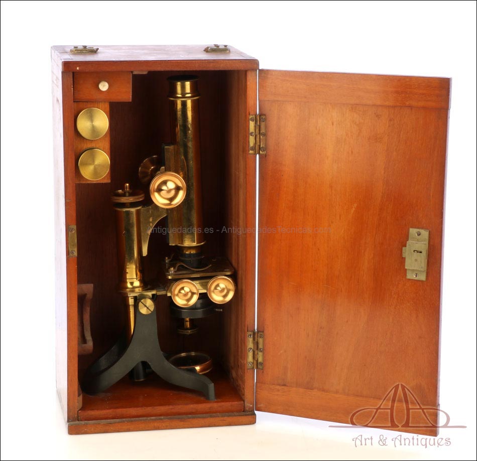 Antiguo microscopio compuesto inglés con pletina mecánica, fabricado en Inglaterra circa 1910 y en excelente estado de conservación. No está firmado pero es idéntico a algunos modelos de Henry Crouch. El microscopio se presenta en su estuche de guardado, donde también encontramos 1 ocular, 2 objetivos, una lupa de concentración de luz y una pinza para manipular muestras y especímenes. Lleva pie de metal esmaltado en negro y base de madera de caoba, a juego con el estuche. Las piezas y partes móviles son de latón y están en muy buenas condiciones, mostrando un funcionamiento fluido y suave. El latón conserva la laca transparente protectora, que ha logrado mantener su brillo a lo largo de las décadas y le aporta una pátina muy atractiva. La pletina mecánica permite desplazar las muestras con precisión milimétrica, sin tener que tocarlas con los dedos. El estuche de guardado es de caoba maciza, y aunque le falta el asa superior se encuentra en muy buen estado. La cerradura y la llave son originales y funcionan muy bien.