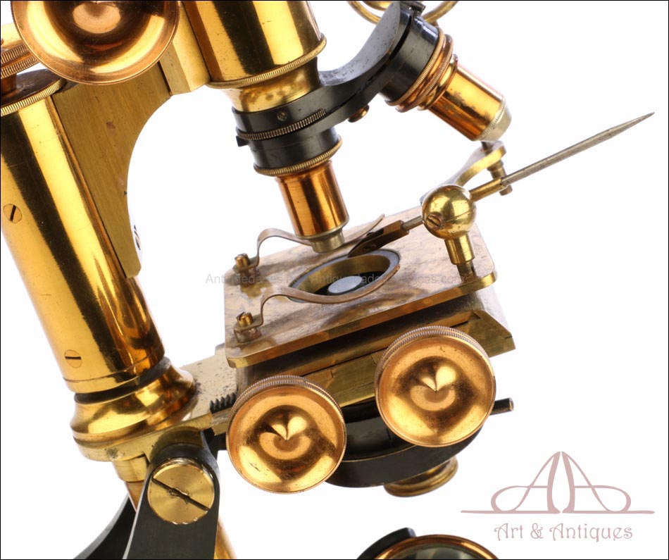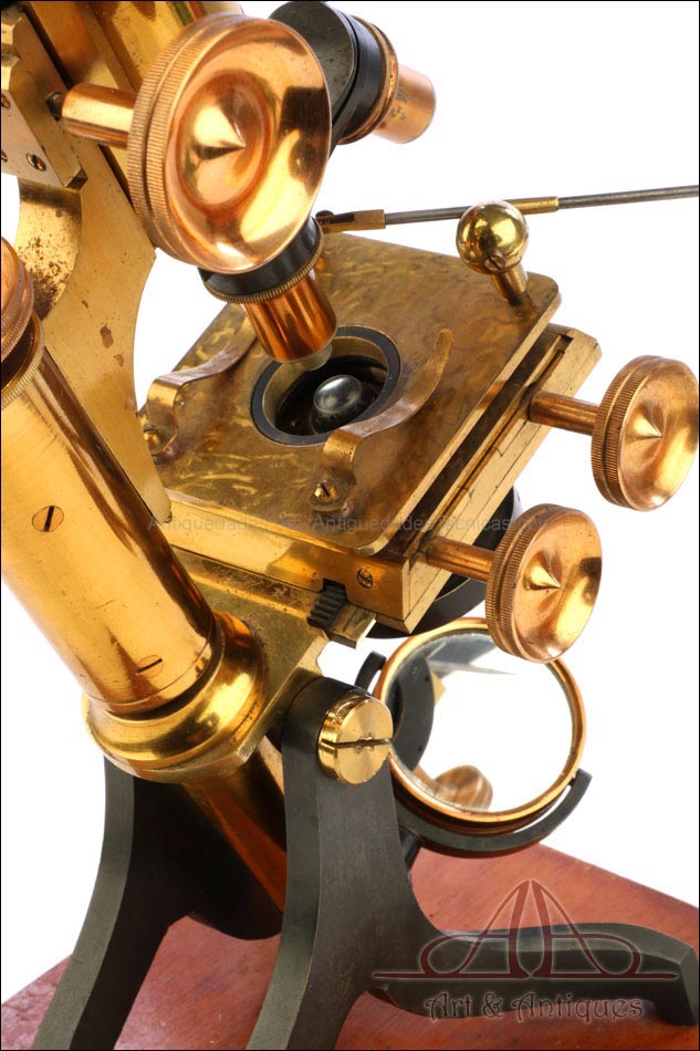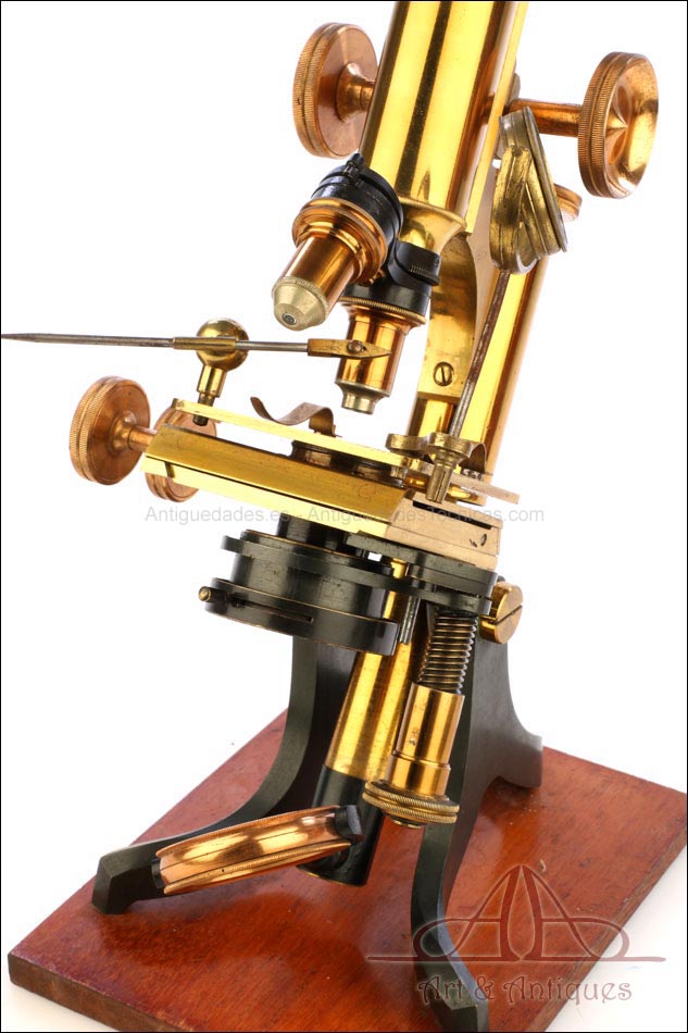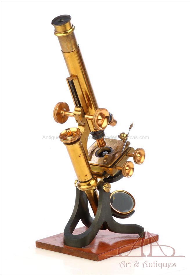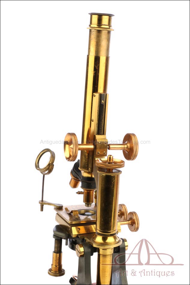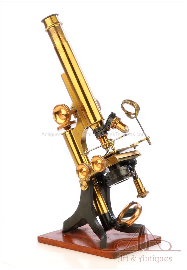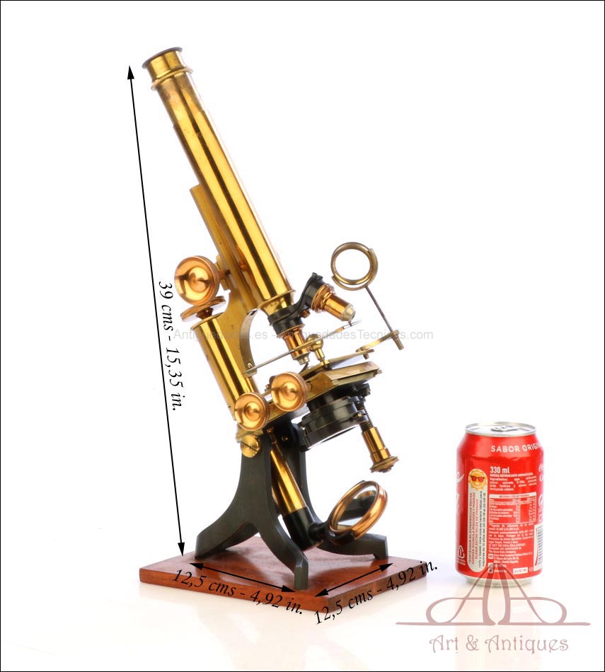 Antiguo microscopio compuesto inglés con pletina mecánica, fabricado en Inglaterra circa 1910 y en excelente estado de conservación. No está firmado pero es idéntico a algunos modelos de Henry Crouch. El microscopio se presenta en su estuche de guardado, donde también encontramos 1 ocular, 2 objetivos, una lupa de concentración de luz y una pinza para manipular muestras y especímenes. Lleva pie de metal esmaltado en negro y base de madera de caoba, a juego con el estuche. Las piezas y partes móviles son de latón y están en muy buenas condiciones, mostrando un funcionamiento fluido y suave. El latón conserva la laca transparente protectora, que ha logrado mantener su brillo a lo largo de las décadas y le aporta una pátina muy atractiva. La pletina mecánica permite desplazar las muestras con precisión milimétrica, sin tener que tocarlas con los dedos. El estuche de guardado es de caoba maciza, y aunque le falta el asa superior se encuentra en muy buen estado. La cerradura y la llave son originales y funcionan muy bien.