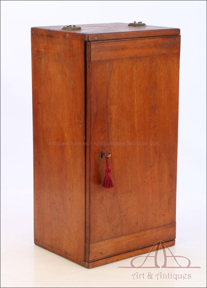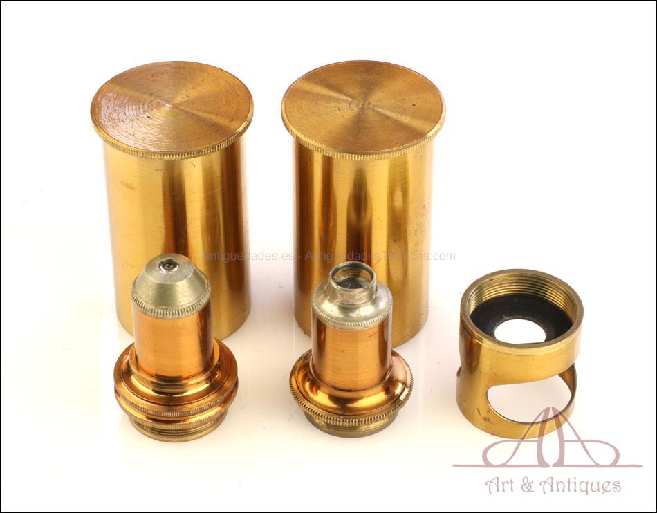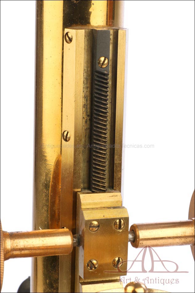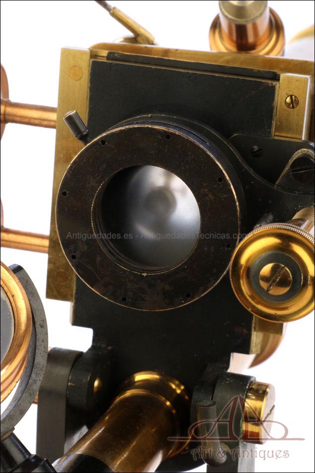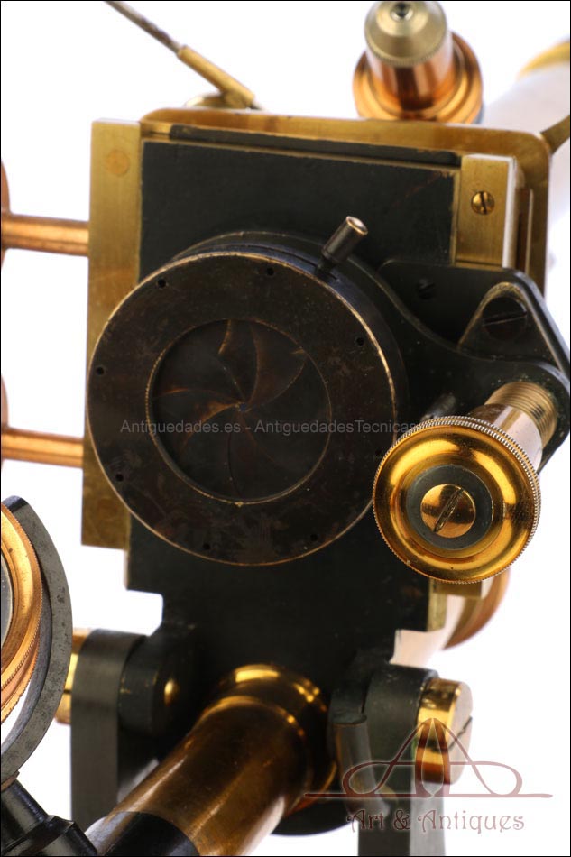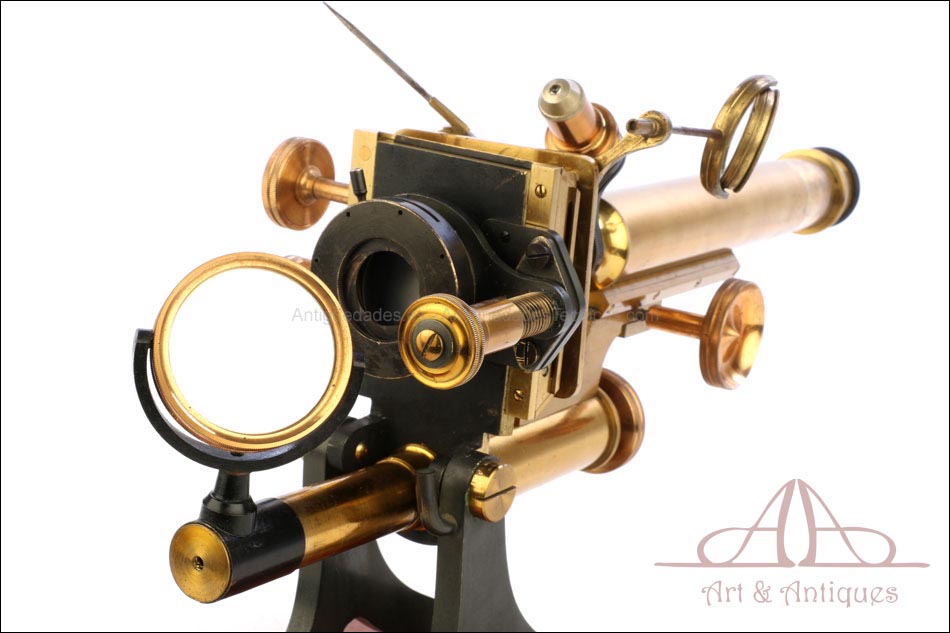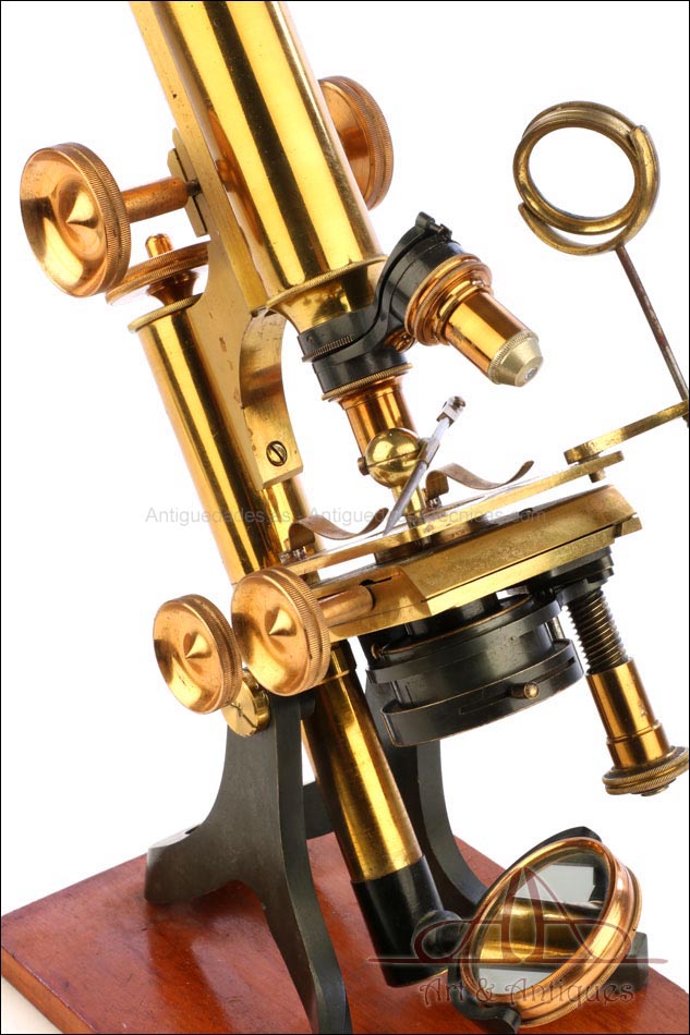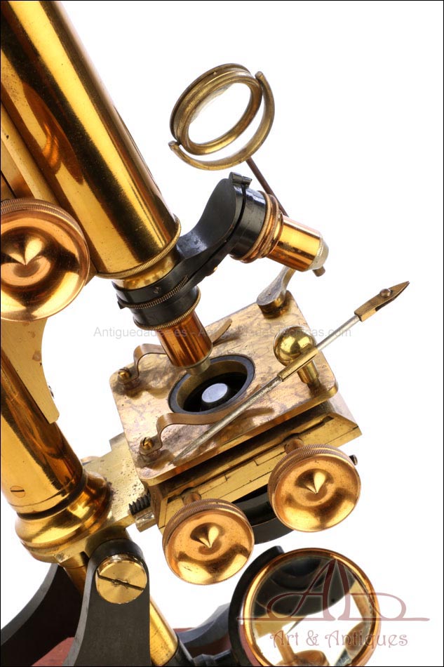 Antiguo microscopio compuesto inglés con pletina mecánica, fabricado en Inglaterra circa 1910 y en excelente estado de conservación. No está firmado pero es idéntico a algunos modelos de Henry Crouch. El microscopio se presenta en su estuche de guardado, donde también encontramos 1 ocular, 2 objetivos, una lupa de concentración de luz y una pinza para manipular muestras y especímenes. Lleva pie de metal esmaltado en negro y base de madera de caoba, a juego con el estuche. Las piezas y partes móviles son de latón y están en muy buenas condiciones, mostrando un funcionamiento fluido y suave. El latón conserva la laca transparente protectora, que ha logrado mantener su brillo a lo largo de las décadas y le aporta una pátina muy atractiva. La pletina mecánica permite desplazar las muestras con precisión milimétrica, sin tener que tocarlas con los dedos. El estuche de guardado es de caoba maciza, y aunque le falta el asa superior se encuentra en muy buen estado. La cerradura y la llave son originales y funcionan muy bien.