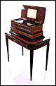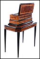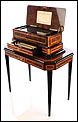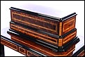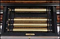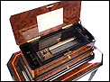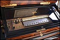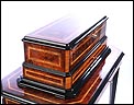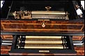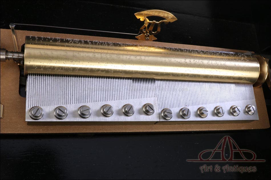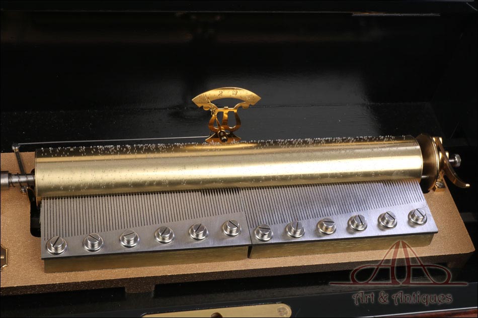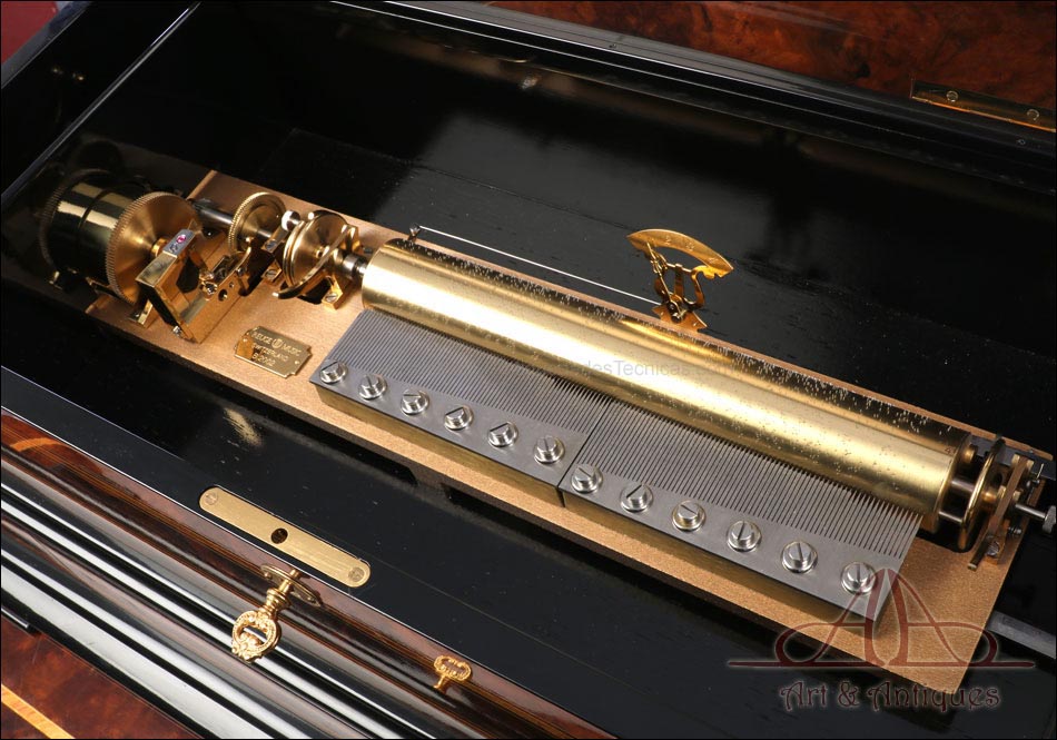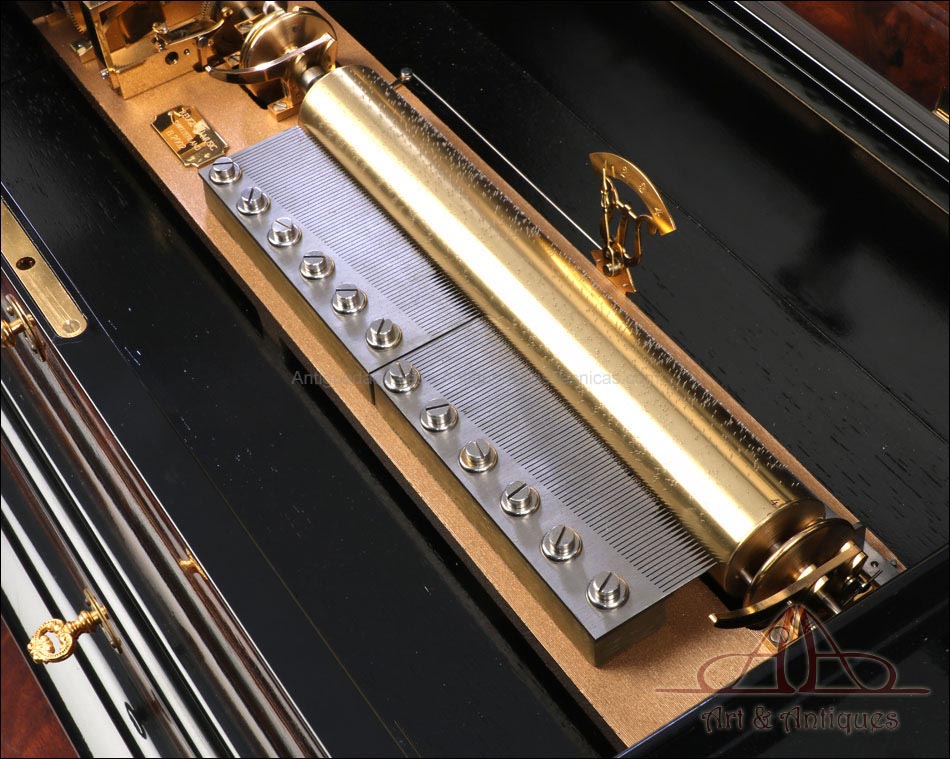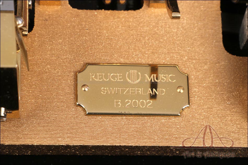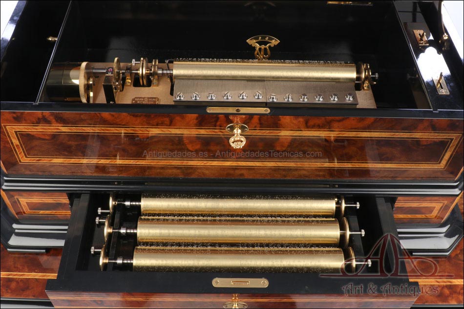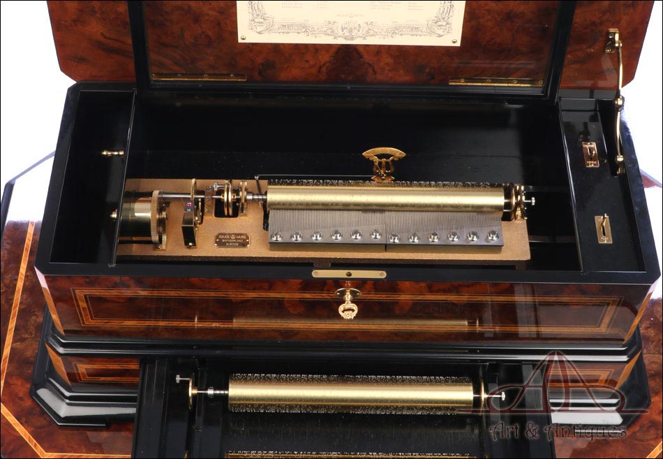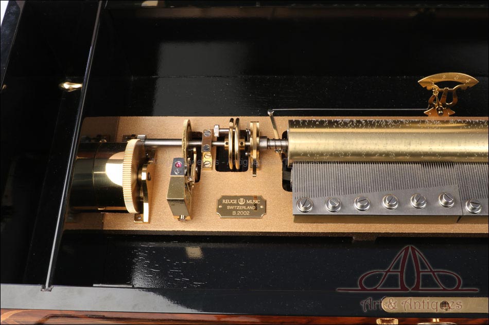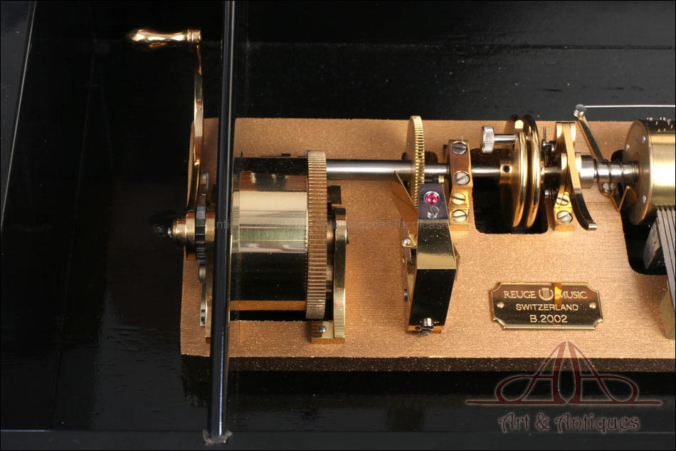 La caja en sí es una auténtica obra de arte, siendo el modelo más grande nunca fabricada por la casa Reuge. De hecho, su tamaño duplica el de modelo estándar con el mismo número de canciones (SH 3/144), algo que se nota sin duda en la calidad del sonido. El modelo incluye 5 cilindros, cada uno de ellos con 4 melodías (20 canciones en total). Los cilindros se guardan en el cajón situado justo bajo la caja, con cerradura y llave para garantizar su seguridad. La caja no solo reproduce la estética de los muebles dieciochescos, sino que su maquinaria también es idéntica: lleva un cilindro de tamaño grande, peine de dos piezas con controles a la derecha y función de cambio y repetición. Además de aportar un magnífico sonido, estéticamente es realmente una pieza excepcional y de una belleza fuera de lo común.