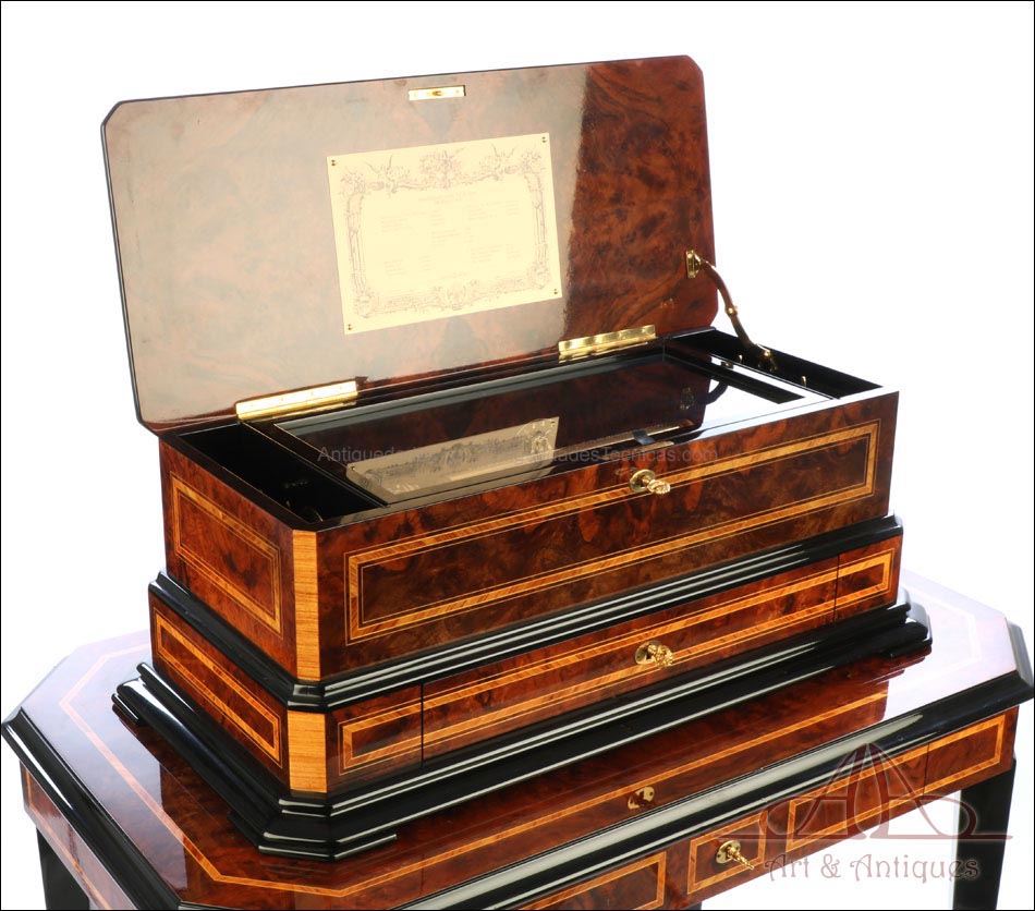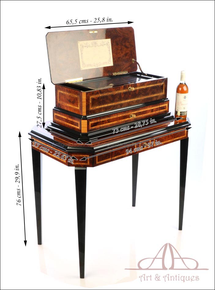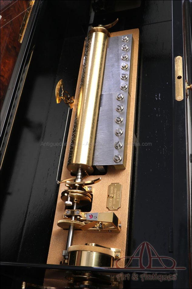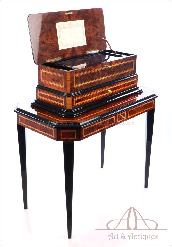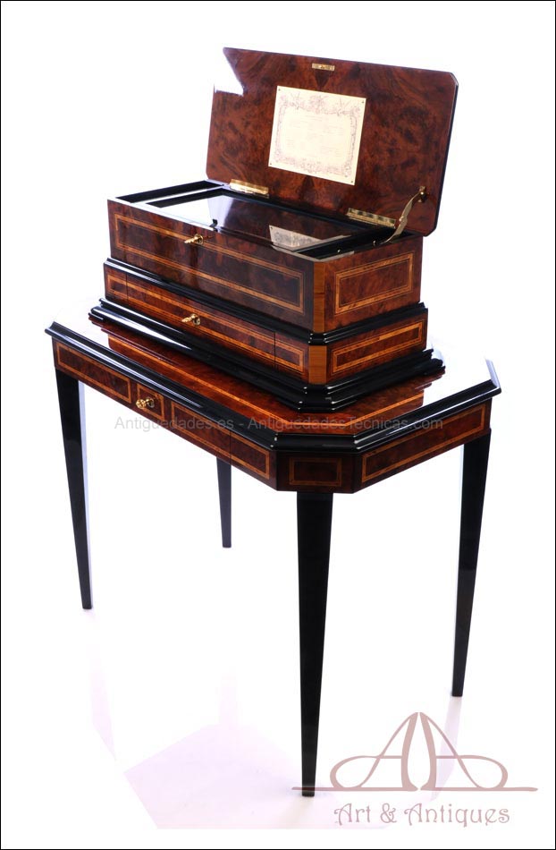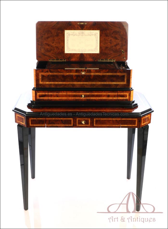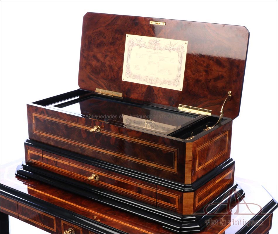 Espectacular Caja de Música Reuge Gran Cartel intercambiable de 144 notas, fabricada en Suiza y de impresionante estética. Se trata del modelo Grand Cartel SH 4/144 de la casa Reuge, el más grande de la casa: una increíble combinación de mueble de madera con taracea y caja de música que reproduce fielmente los diseños clásicos de principios del siglo XIX (circa 1800). La caja se asienta sobre una estilizada y elegante mesa, estando ambas fabricadas en madera de nogal y palisandro con marquetería de raíz de nogal y limoncillo. Está en muy buen estado aunque la tapa tiene un ligero arañazo y lo que parece una pequeña quemadura. Las patas, las molduras y el interior de la caja muestran un precioso acabado ebonizado, mientras que el resto de las piezas están barnizadas a muñequilla y muestran un intenso brillo que aumenta su belleza.