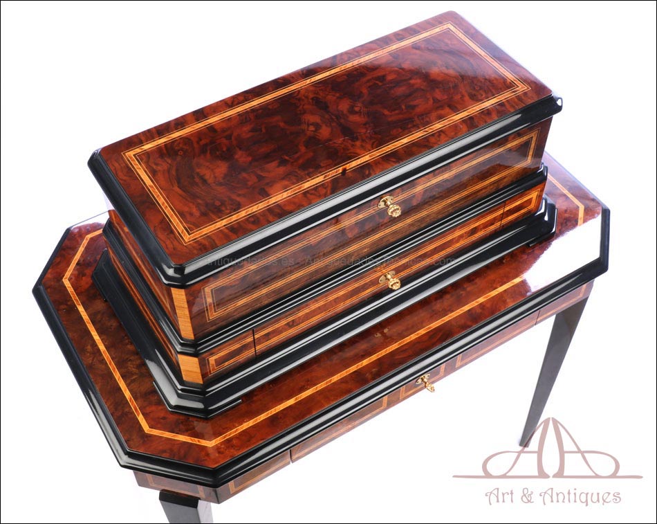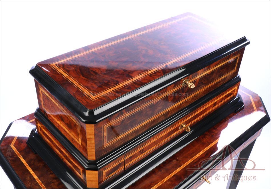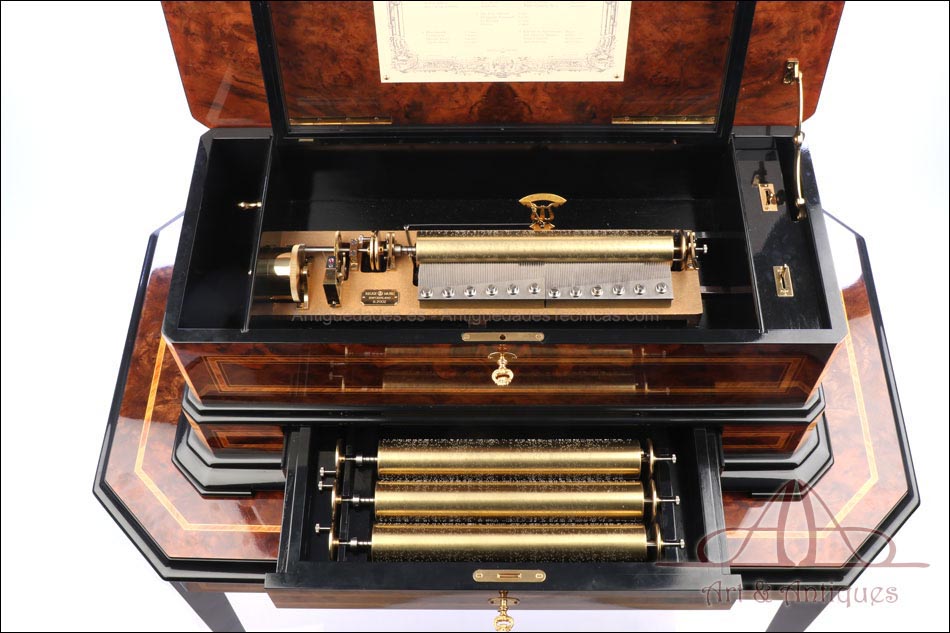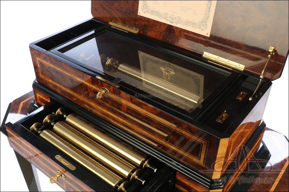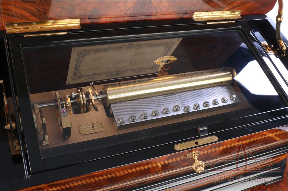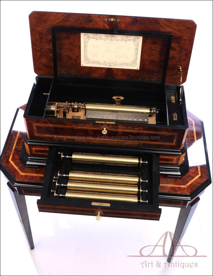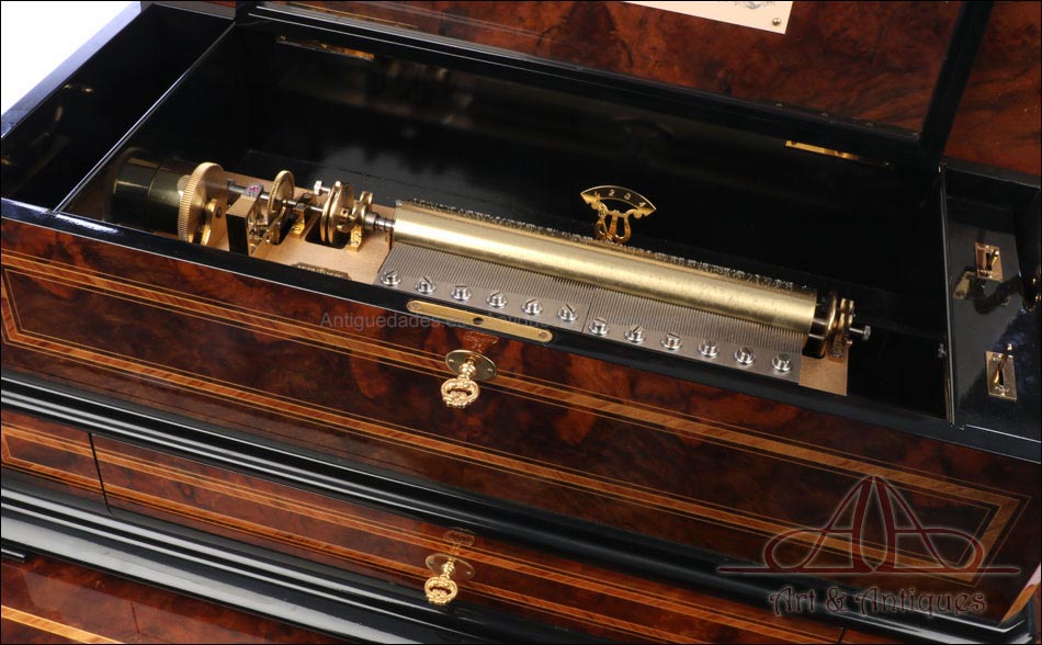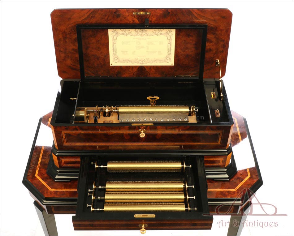 Espectacular Caja de Música Reuge Gran Cartel intercambiable de 144 notas, fabricada en Suiza y de impresionante estética. Se trata del modelo Grand Cartel SH 4/144 de la casa Reuge, el más grande de la casa: una increíble combinación de mueble de madera con taracea y caja de música que reproduce fielmente los diseños clásicos de principios del siglo XIX (circa 1800). La caja se asienta sobre una estilizada y elegante mesa, estando ambas fabricadas en madera de nogal y palisandro con marquetería de raíz de nogal y limoncillo. Está en muy buen estado aunque la tapa tiene un ligero arañazo y lo que parece una pequeña quemadura. Las patas, las molduras y el interior de la caja muestran un precioso acabado ebonizado, mientras que el resto de las piezas están barnizadas a muñequilla y muestran un intenso brillo que aumenta su belleza.
