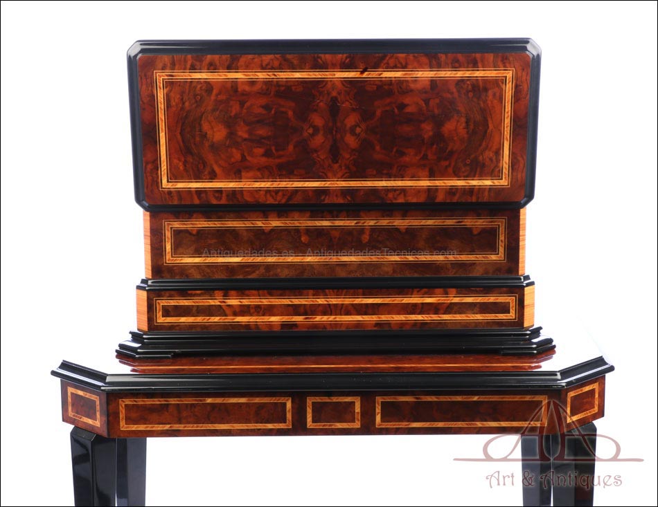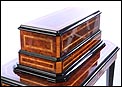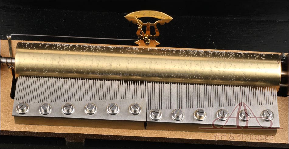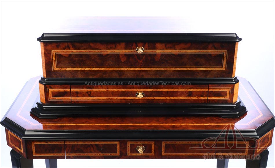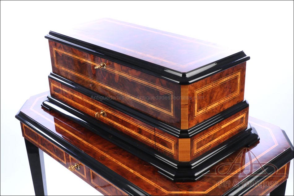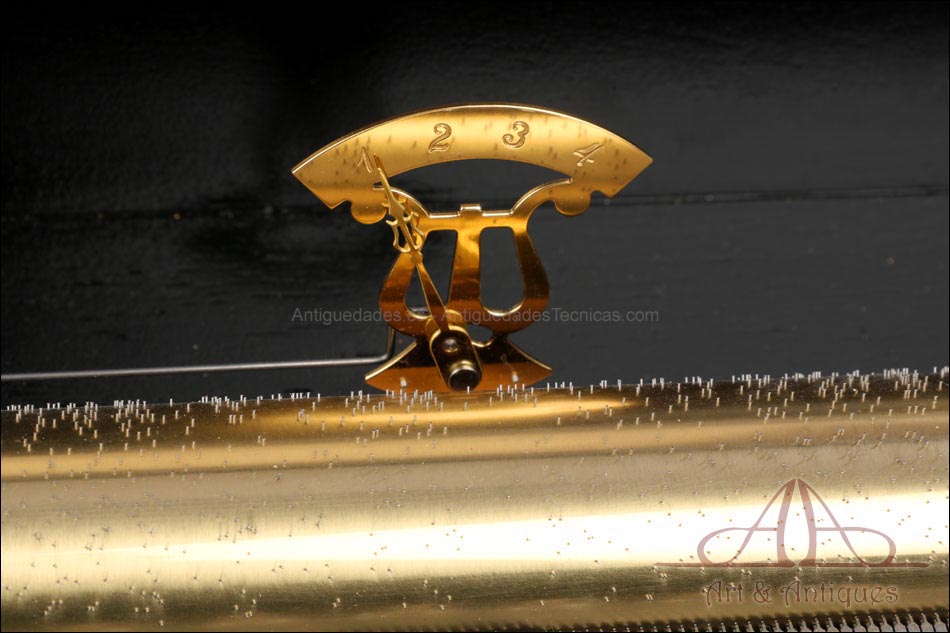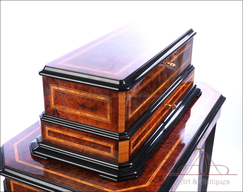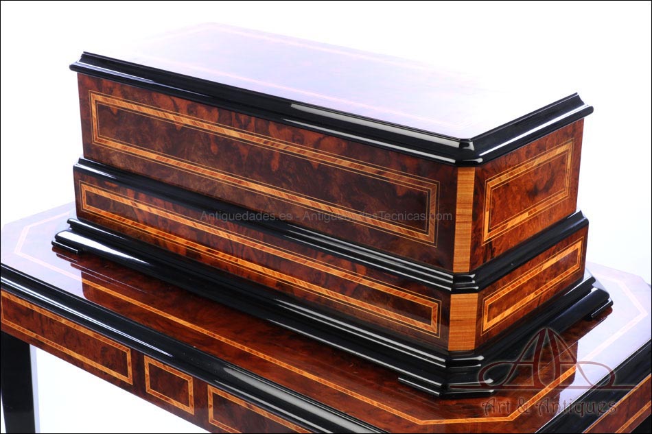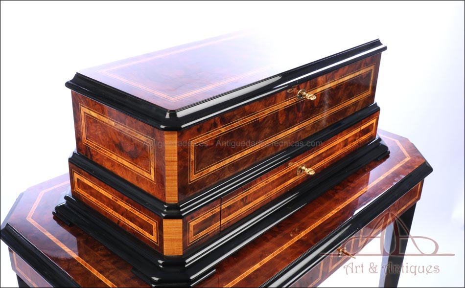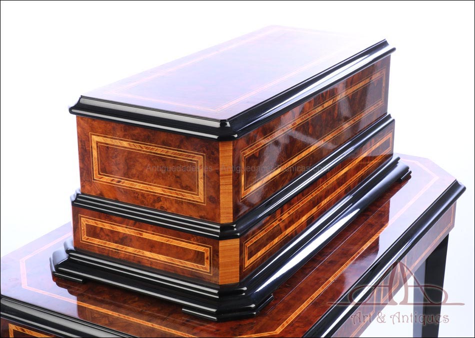 Espectacular Caja de Música Reuge Gran Cartel intercambiable de 144 notas, fabricada en Suiza y de impresionante estética. Se trata del modelo Grand Cartel SH 4/144 de la casa Reuge, el más grande de la casa: una increíble combinación de mueble de madera con taracea y caja de música que reproduce fielmente los diseños clásicos de principios del siglo XIX (circa 1800). La caja se asienta sobre una estilizada y elegante mesa, estando ambas fabricadas en madera de nogal y palisandro con marquetería de raíz de nogal y limoncillo. Está en muy buen estado aunque la tapa tiene un ligero arañazo y lo que parece una pequeña quemadura. Las patas, las molduras y el interior de la caja muestran un precioso acabado ebonizado, mientras que el resto de las piezas están barnizadas a muñequilla y muestran un intenso brillo que aumenta su belleza.