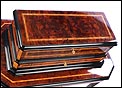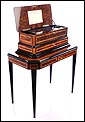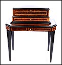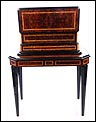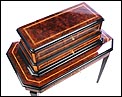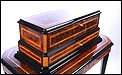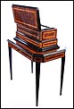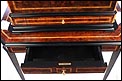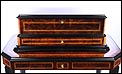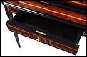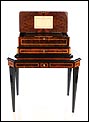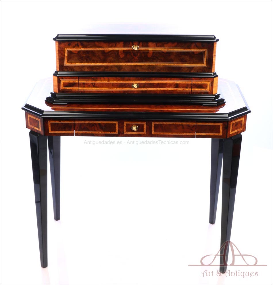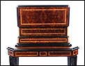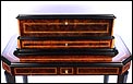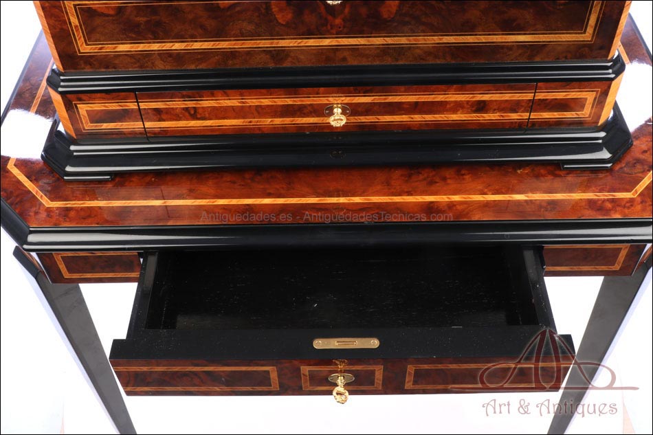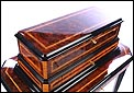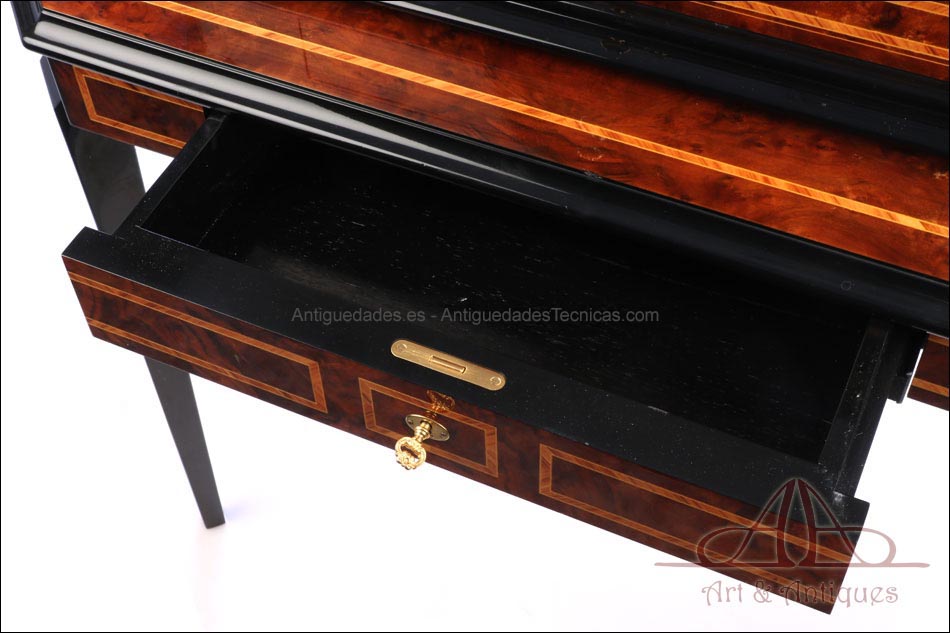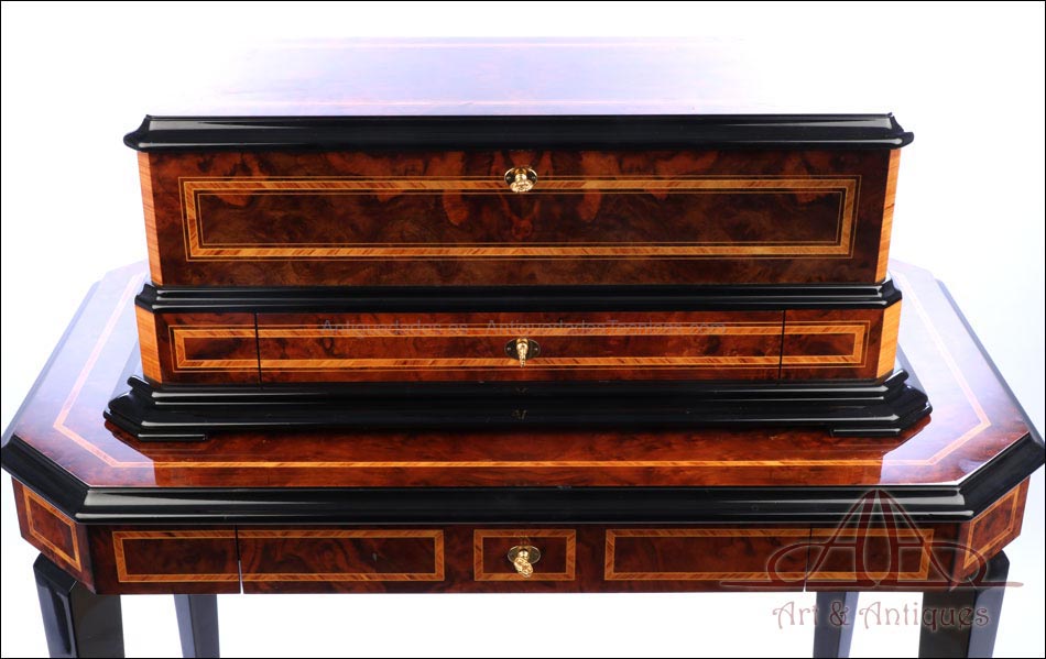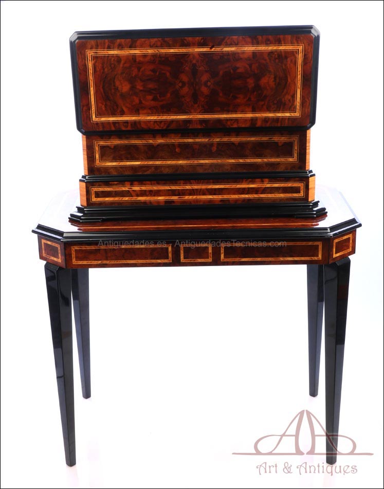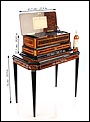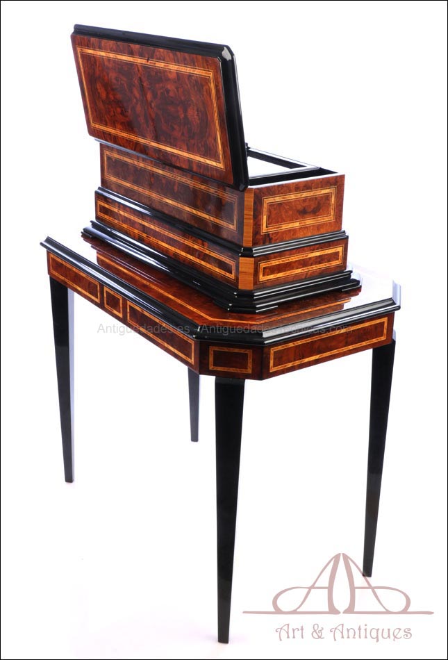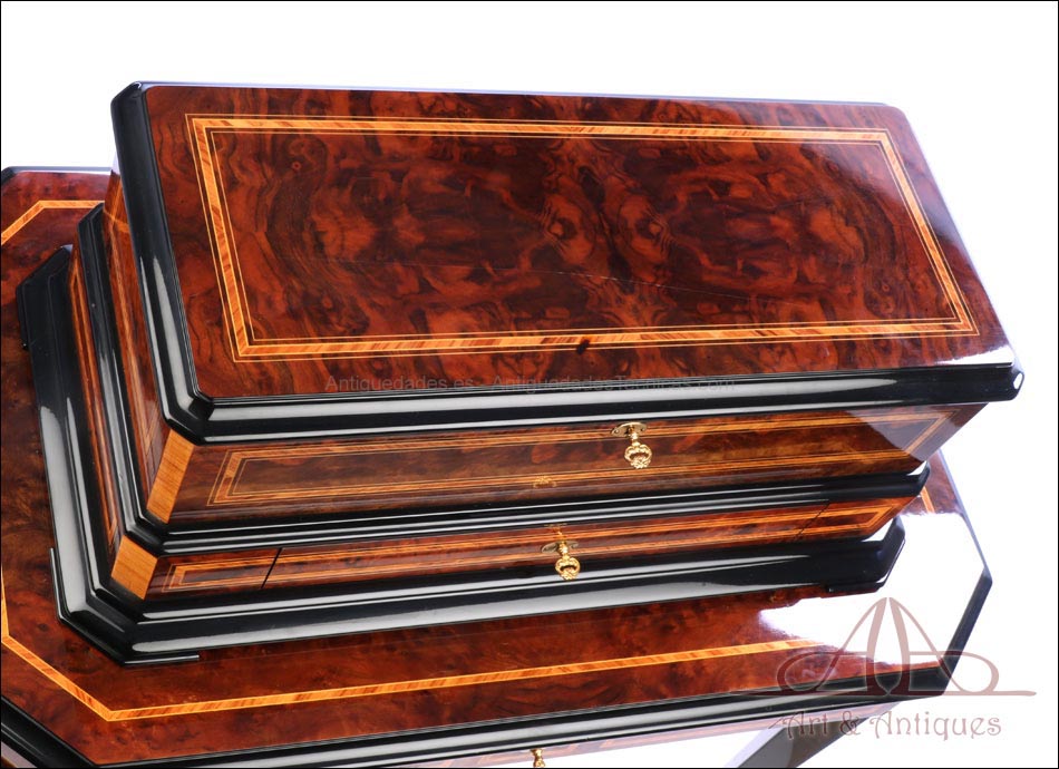 Espectacular Caja de Música Reuge Gran Cartel intercambiable de 144 notas, fabricada en Suiza y de impresionante estética. Se trata del modelo Grand Cartel SH 4/144 de la casa Reuge, el más grande de la casa: una increíble combinación de mueble de madera con taracea y caja de música que reproduce fielmente los diseños clásicos de principios del siglo XIX (circa 1800). La caja se asienta sobre una estilizada y elegante mesa, estando ambas fabricadas en madera de nogal y palisandro con marquetería de raíz de nogal y limoncillo. Está en muy buen estado aunque la tapa tiene un ligero arañazo y lo que parece una pequeña quemadura. Las patas, las molduras y el interior de la caja muestran un precioso acabado ebonizado, mientras que el resto de las piezas están barnizadas a muñequilla y muestran un intenso brillo que aumenta su belleza.