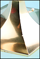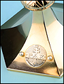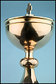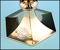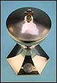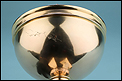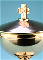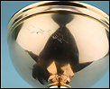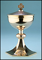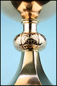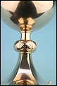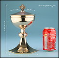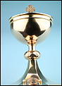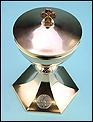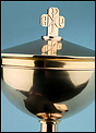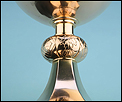 La copa, de gran capacidad, mantiene el diseño austero del conjunto, totalmente lisa y de forma perfecta. La tapa de plata cierra de forma precisa y lleva como remate una cruz que actúa como asa. Esta cruz, también en plata, está decorada con el Crismón en relieve, símbolo de Cristo, y está flanqueada por las letras griegas Α, Alfa, y Ω, Omega, representación del principio y fin. Un símbolo clásico, pero interpretado con una estética contenida y sobria, muy en sintonía con el espíritu litúrgico del período.