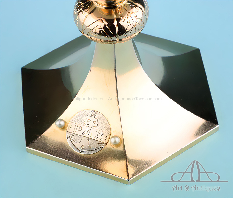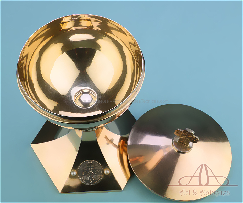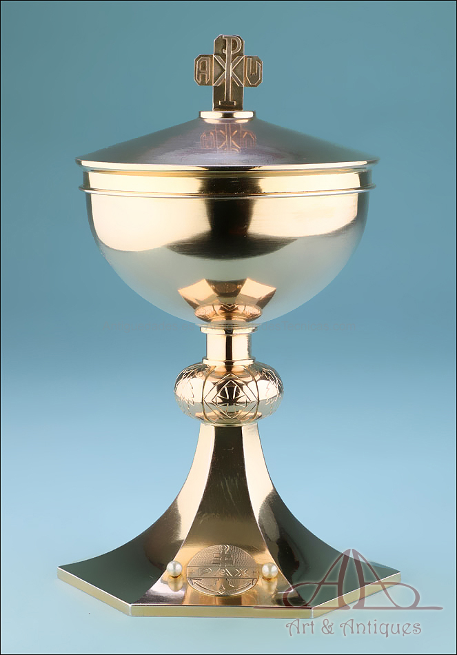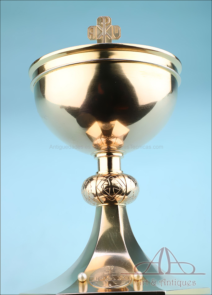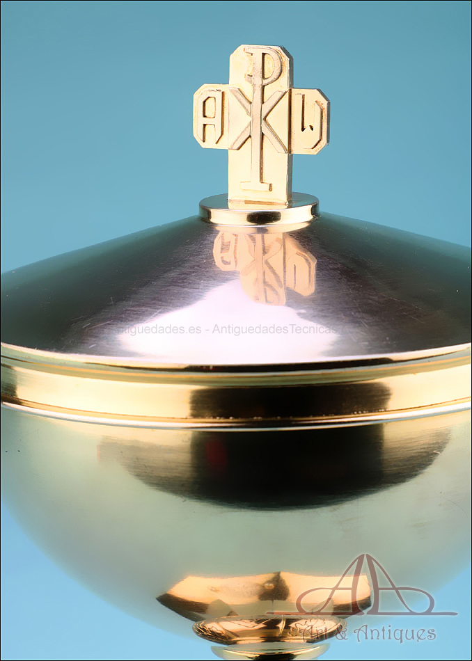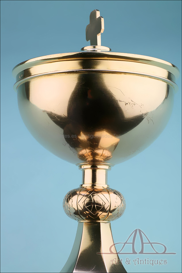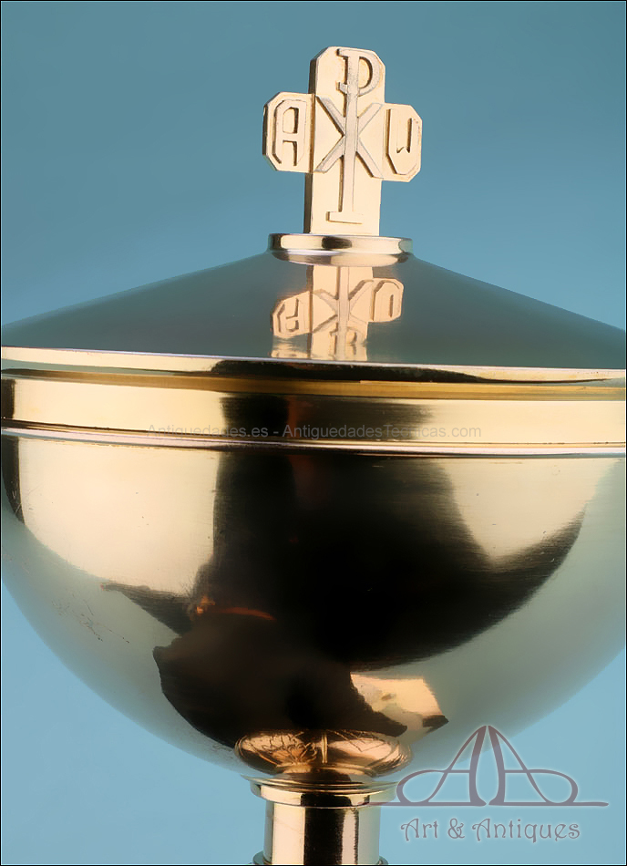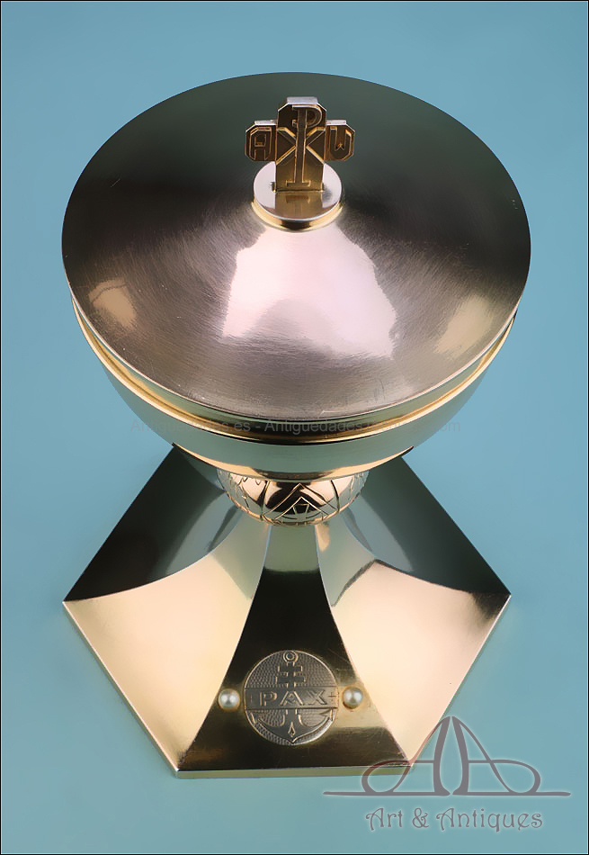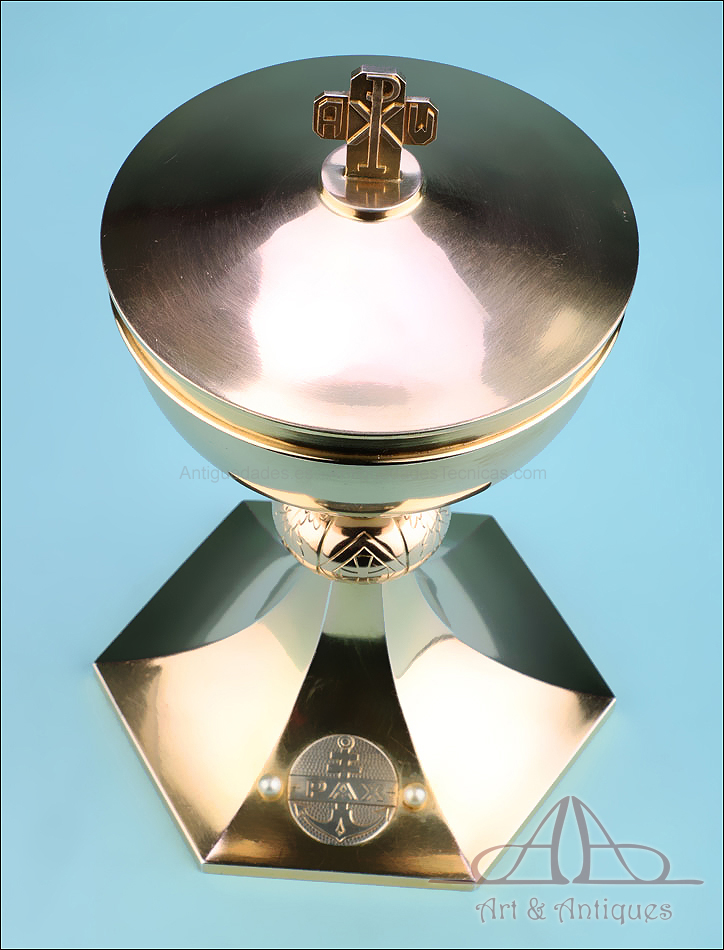 El periodo entre guerras, entre 1918 y 1939, se caracterizó por un estilo más austero y funcional en la producción de objetos sagrados, en parte como respuesta a los cambios sociales y económicos de la época. Los copones de este tiempo, como el que presentamos aquí, suelen evitar la ornamentación excesiva y muestran líneas depuradas, formas geométricas bien definidas y símbolos sobrios. Estas piezas no solo tenían un uso estrictamente litúrgico, también eran regalos habituales a jóvenes sacerdotes recién ordenados, lo que ha permitido que muchas de ellas lleguen hasta nuestros días en buen estado, al ser celosamente conservadas en sacristías o colecciones privadas.