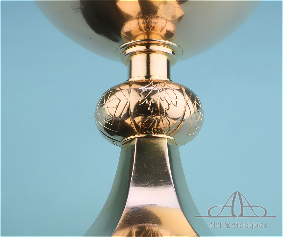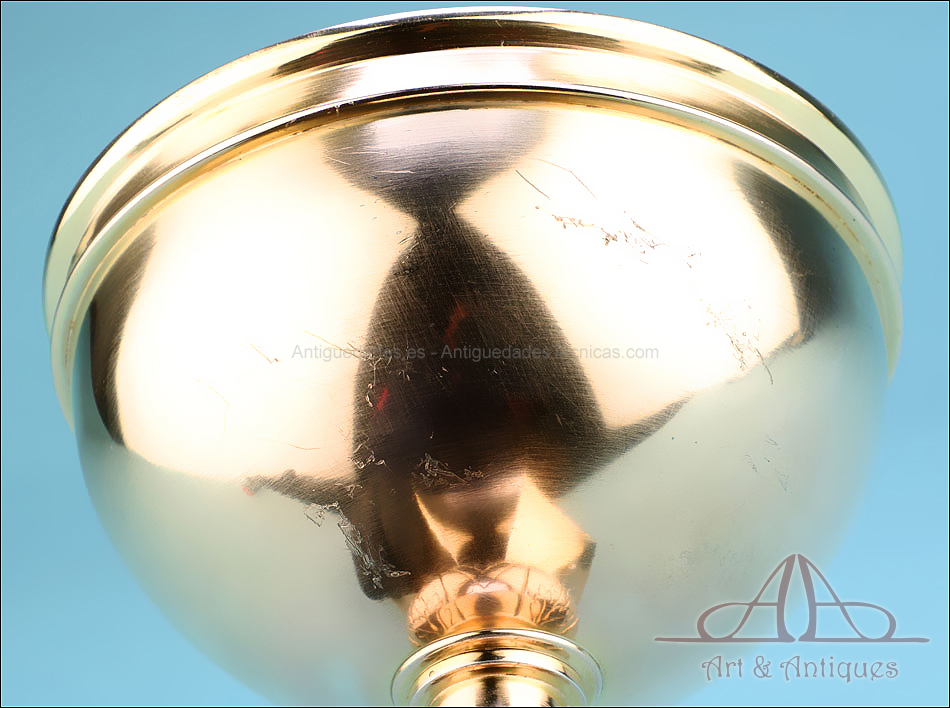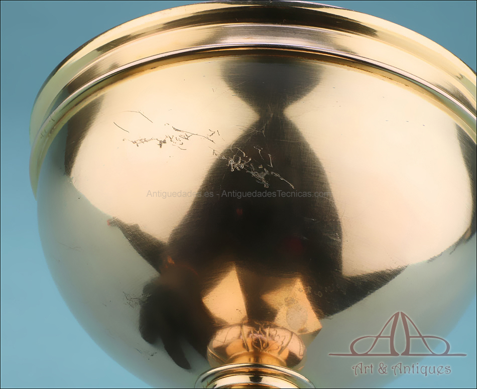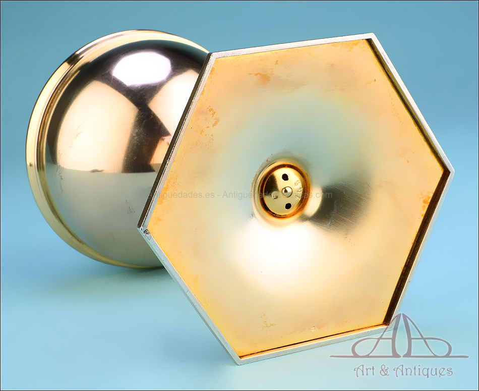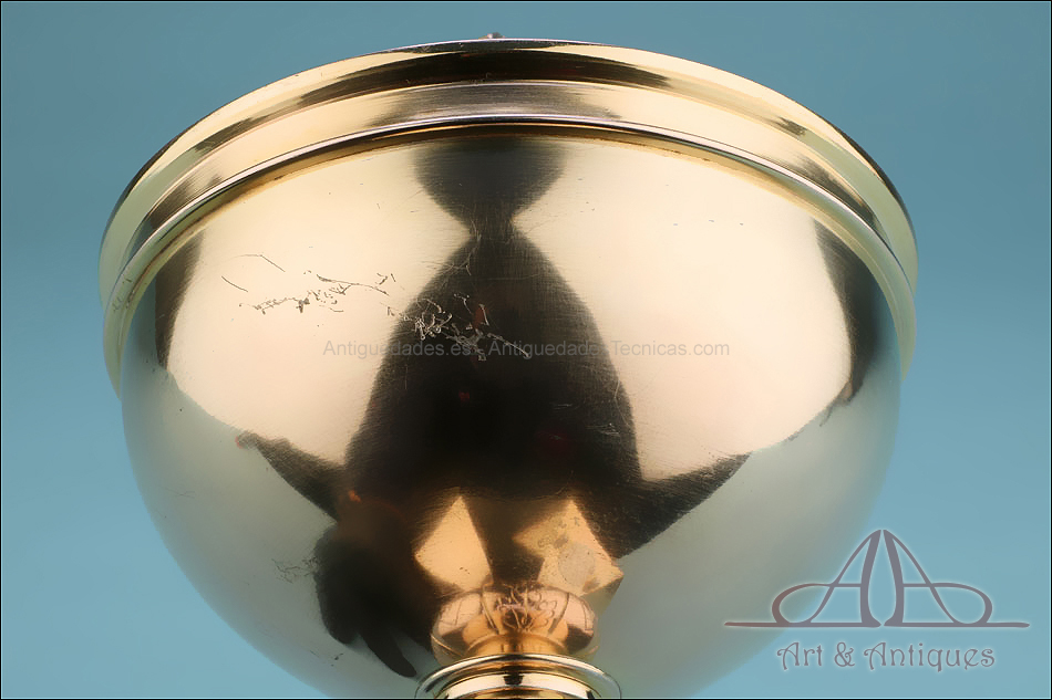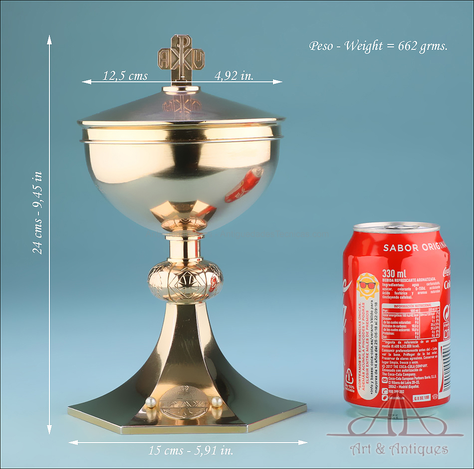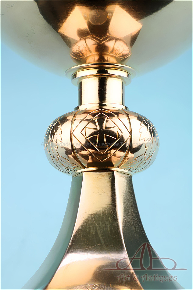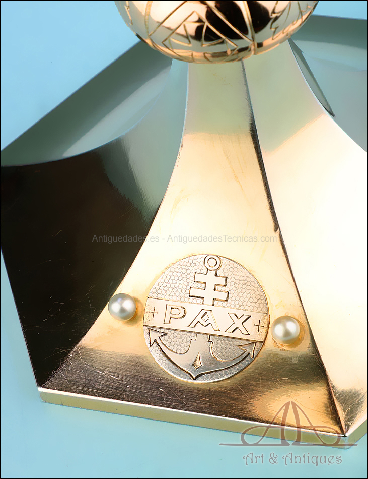 El periodo entre guerras, entre 1918 y 1939, se caracterizó por un estilo más austero y funcional en la producción de objetos sagrados, en parte como respuesta a los cambios sociales y económicos de la época. Los copones de este tiempo, como el que presentamos aquí, suelen evitar la ornamentación excesiva y muestran líneas depuradas, formas geométricas bien definidas y símbolos sobrios. Estas piezas no solo tenían un uso estrictamente litúrgico, también eran regalos habituales a jóvenes sacerdotes recién ordenados, lo que ha permitido que muchas de ellas lleguen hasta nuestros días en buen estado, al ser celosamente conservadas en sacristías o colecciones privadas.