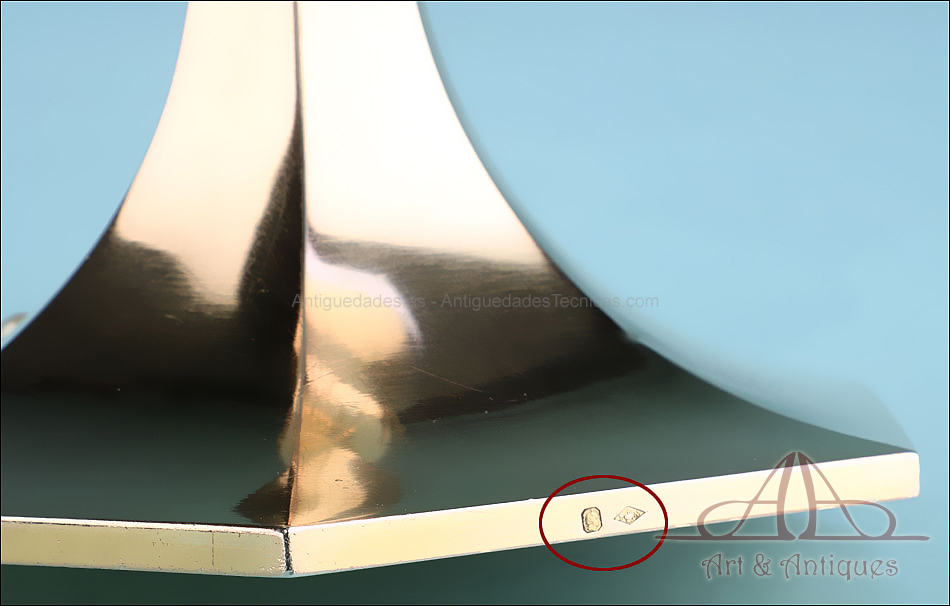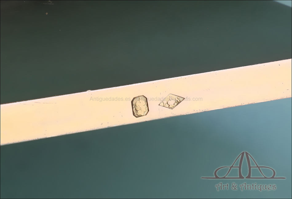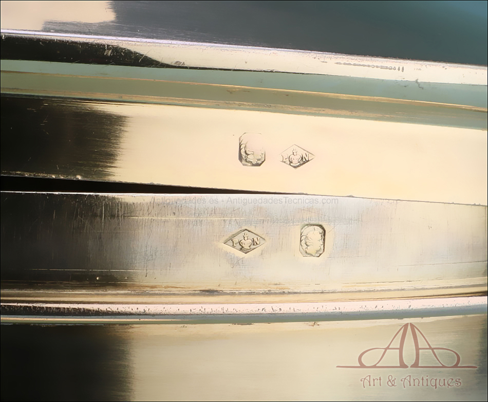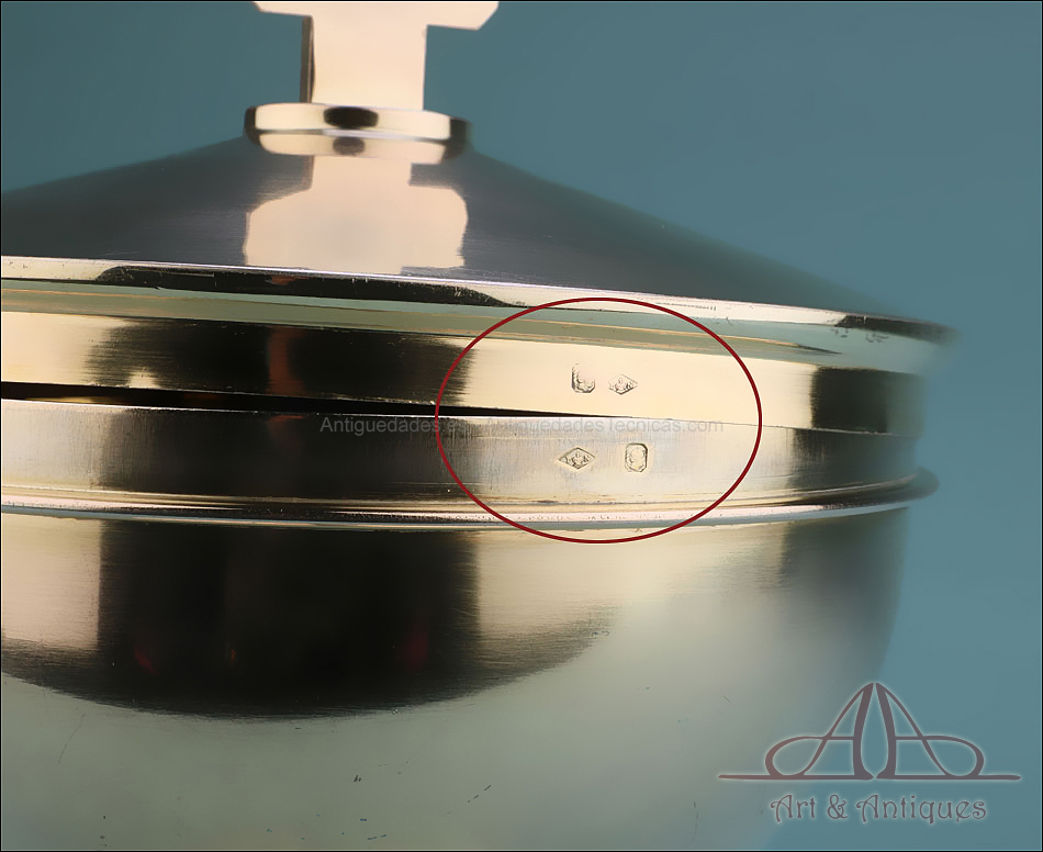 El uso de contrastes y punzones fue regulado desde el siglo XIX por la legislación francesa, que exigía la marca de la cabeza de Minerva en las piezas de plata superior al 800‰. Esta regulación garantiza la autenticidad de los objetos de culto y facilita su identificación por parte de coleccionistas e instituciones. Este copón conserva en distintos puntos, base, copa y tapa, contrastes franceses antiguos bien definidos, incluyendo el clásico punzón con cabeza de Minerva que certifica su plata maciza, y la marca del platero con las iniciales PN, todo ello claramente legible en el metal.