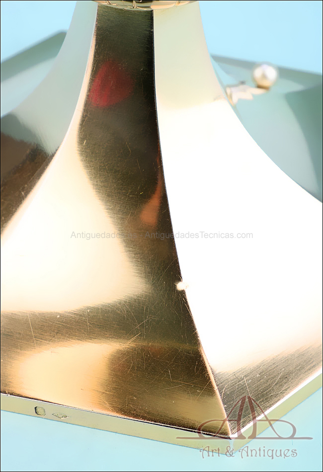 Este magnífico copón antiguo, elaborado en Francia alrededor del año 1925, es una pieza única de platería religiosa que conjuga sobriedad, modernidad y simbolismo litúrgico. Fabricado en plata maciza al 100%, su diseño limpio y estructurado refleja claramente las líneas artísticas que marcaron la primera mitad del siglo XX. Se trata de una obra que destaca por su equilibrio visual y por la pureza de sus formas, rasgos que la convierten en un ejemplo representativo del estilo eclesiástico moderno francés.