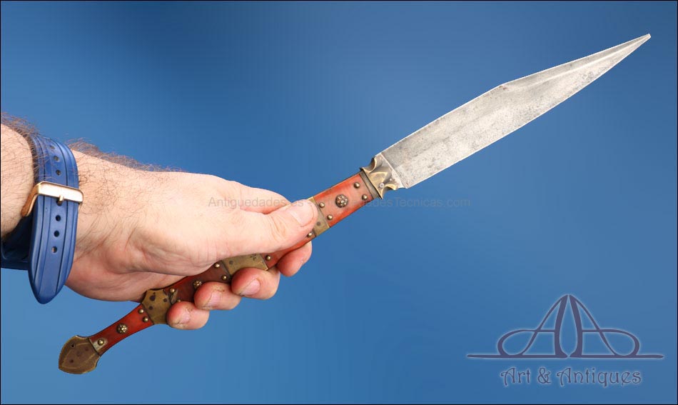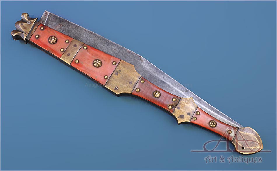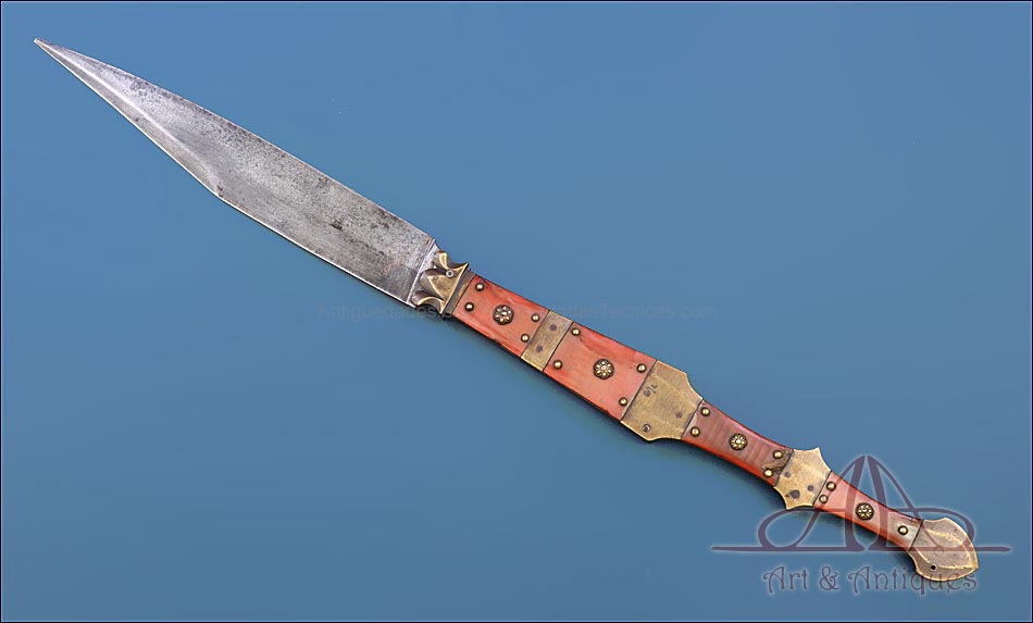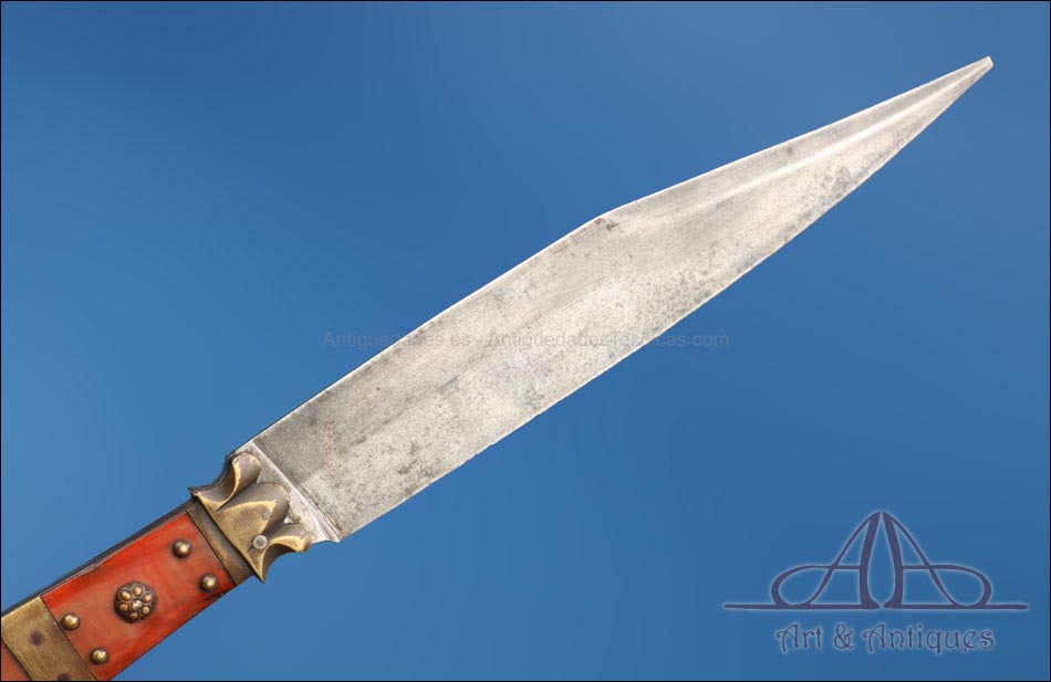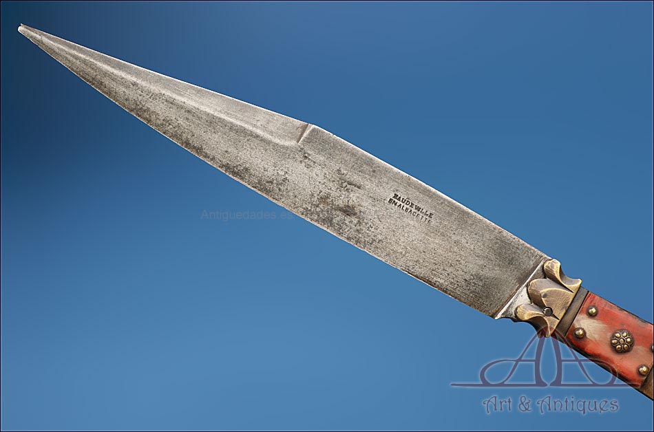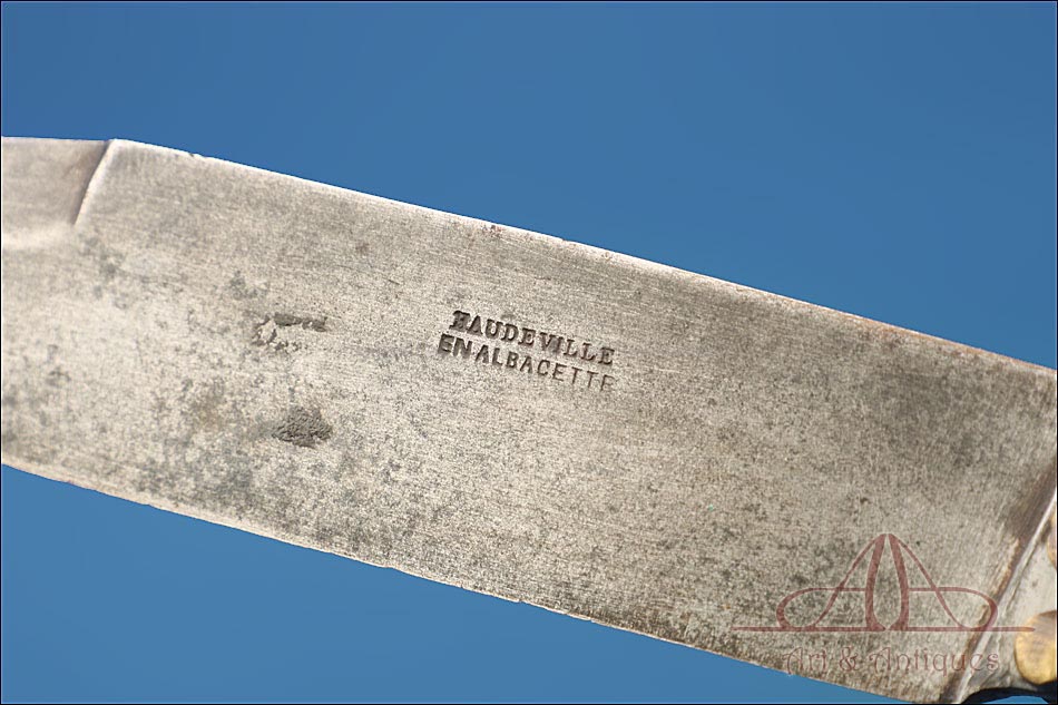 Fantástica y antigua navaja francesa antigua, marcada Haudeville en Albacette, fabricada en Thiers, Francia, en el siglo XIX para el mercado español. Llama la atención el hermoso diseño y el buen estado de esta navaja: el muelle está fuerte y cierra con seguridad, y las piezas que la forman están en excelentes condiciones. En la hoja podemos ver la marca ‘HAUDEVILLE EN ALBACETTE’; este tipo de navajas se fabricaban en Thiers , Francia para luego venderlas en Francia y en España. Se cree que el fabricante poseía además una tienda en Albacete, donde vendía la producción de navajas marcadas como Haudeville en Albacette. La empuñadura de la navaja tiene una bonita forma recortada y simétrica, con cachas de latón y asta fijadas con remaches. Está en buenas condiciones, sin pérdidas de material ni roturas.