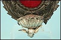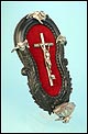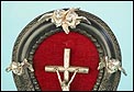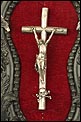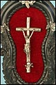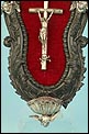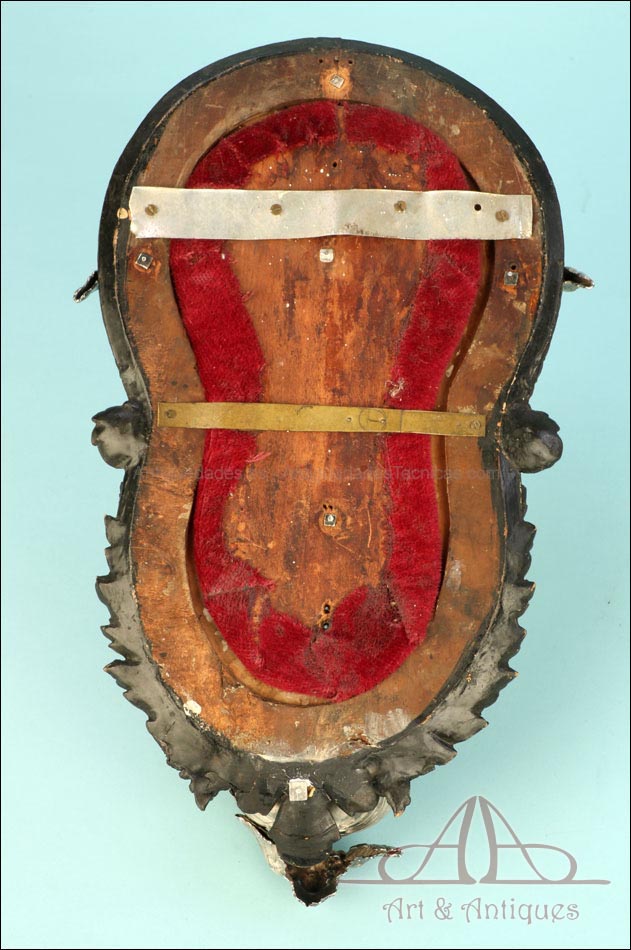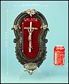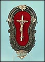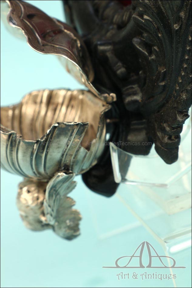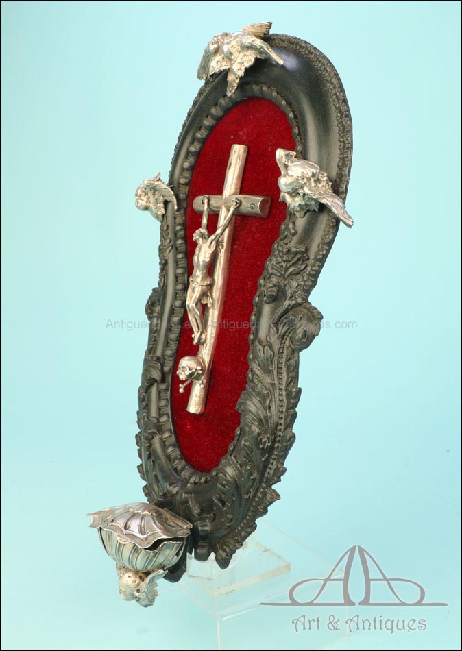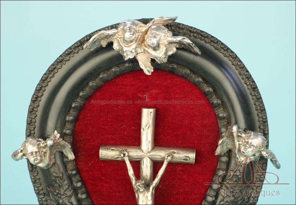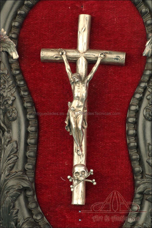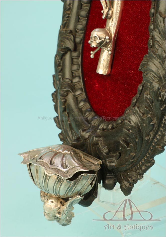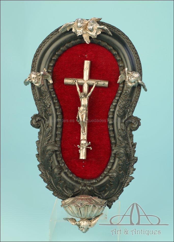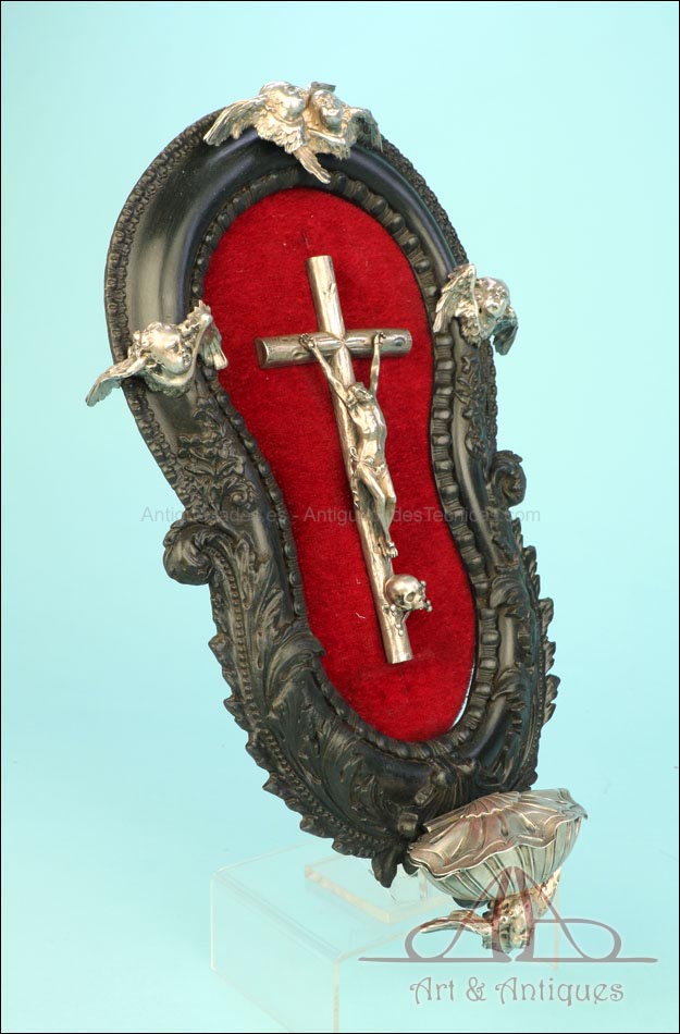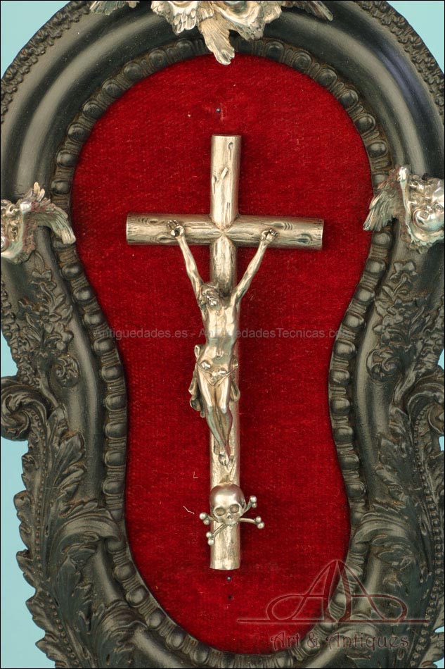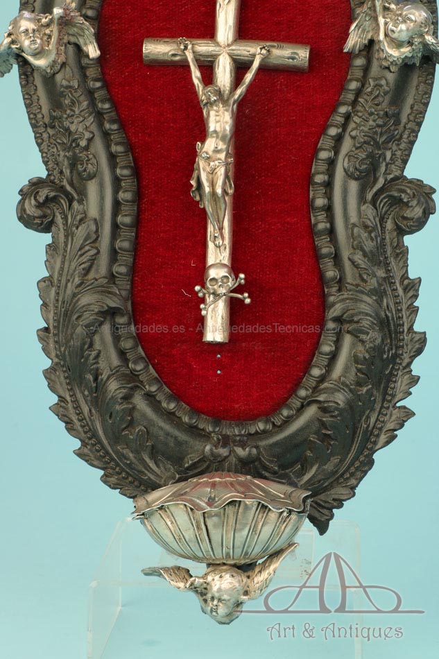En la parte superior del crucifijo falta el tradicional pergamino con la inscripción INRI. A cambio, encontramos un símbolo aún más evocador, la calavera con tibias cruzadas. Este motivo hace referencia al monte Gólgota, el lugar de la calavera donde fue crucificado Jesucristo. En el marco se despliegan tres cabezas de querubines en plata, ubicadas en la parte superior y laterales. Estas figuras aportan luminosidad y movimiento a la escena central. En la parte inferior, se sitúa la vieira de agua bendita, también realizada en plata y ricamente moldeada. Esta pieza pudo haber estado colocada originalmente más cerca del crucifijo, aunque actualmente se halla fijada a la base del marco. La tapa abatible aún se conserva, si bien la vieira presenta una grieta y algunas abolladuras debidas al uso. Estos detalles, lejos de restar valor, realzan su autenticidad y carácter.