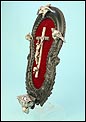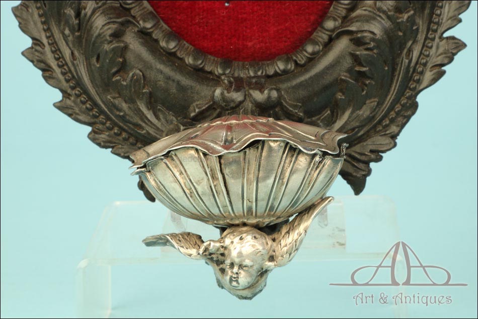Este raro y hermoso benditero francés del siglo XIX es una auténtica joya devocional. Destaca tanto por su excelente manufactura como por el exquisito gusto con el que ha sido elaborado. Se trata de una pieza de gran tamaño, cuidadosamente decorada con plata maciza sobre una estructura de madera tallada a mano y forrada en terciopelo rojo. El conjunto rezuma solemnidad y belleza, lo que lo convierte en una pieza absolutamente única. El marco, ebonizado y tallado con volutas de estilo barroco, contiene un delicado crucifijo realizado completamente en plata. Su diseño está inspirado en el estilo gótico y presenta una gran precisión anatómica. Cristo aparece clavado a una cruz que imita ramas de árbol, detalle típico de la orfebrería religiosa decimonónica.
