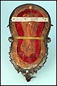 El fondo de terciopelo rojo original conserva su textura y viveza cromática, enmarcando las figuras en plata con fuerza escénica y solemnidad. El reverso del benditero muestra el respaldo de madera con herrajes antiguos, prueba de su autenticidad.