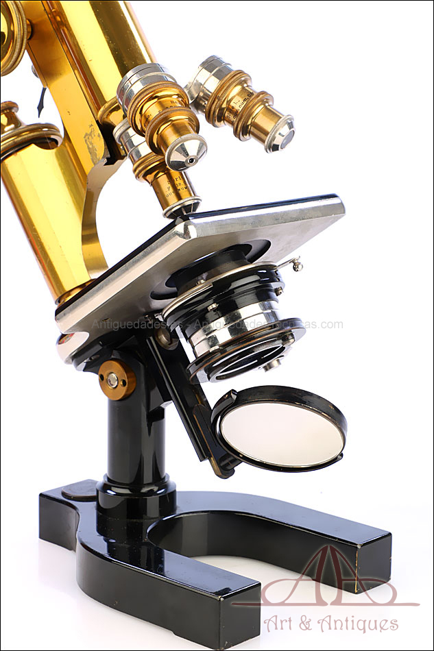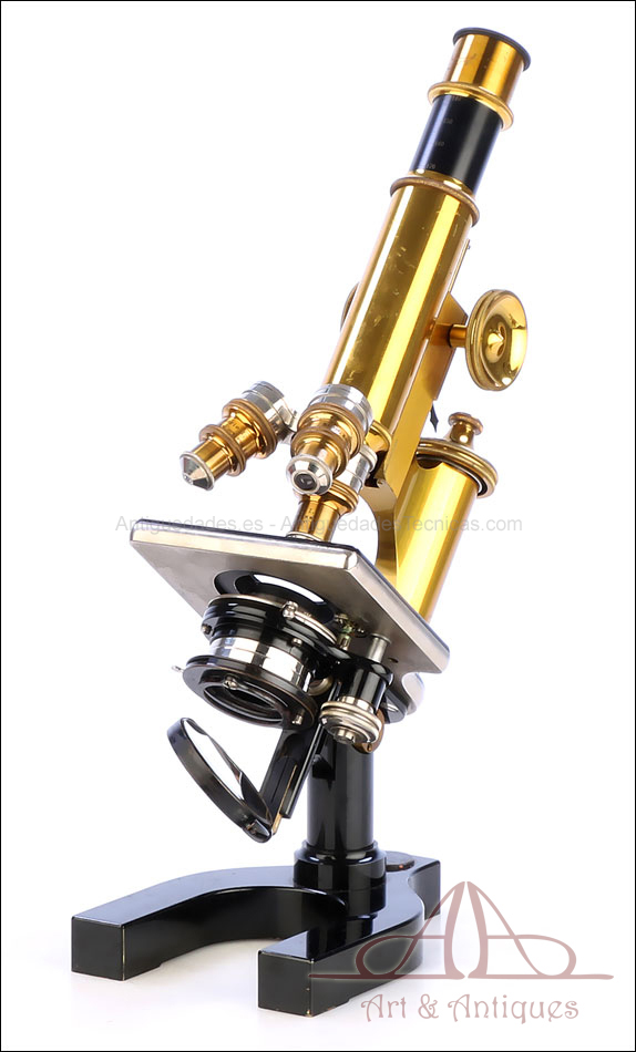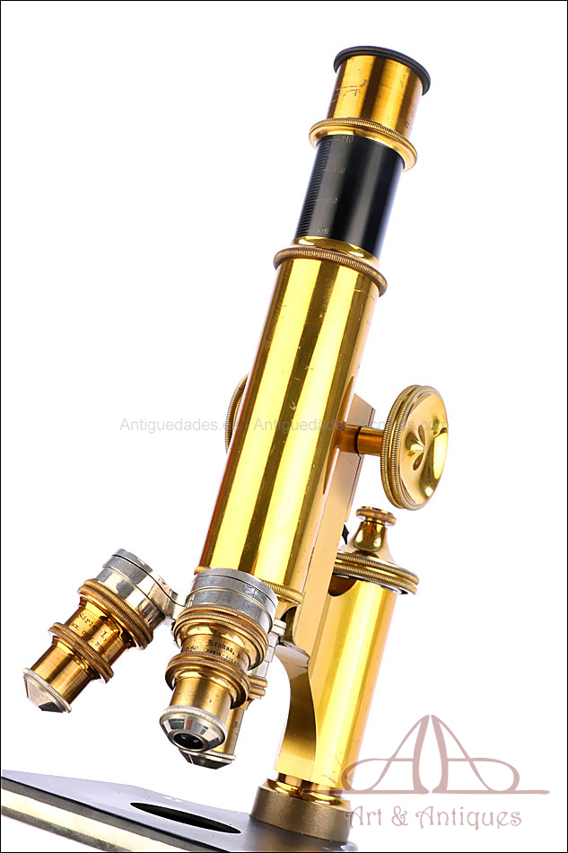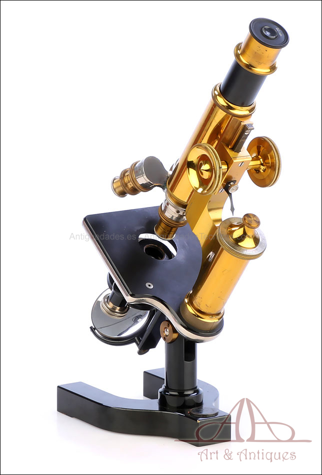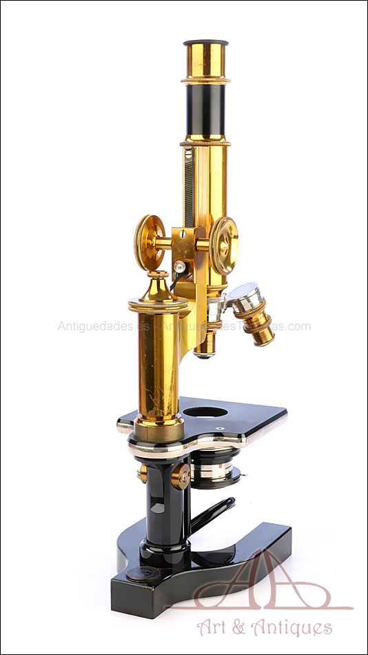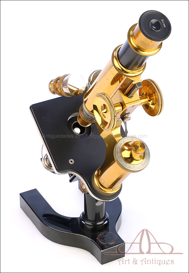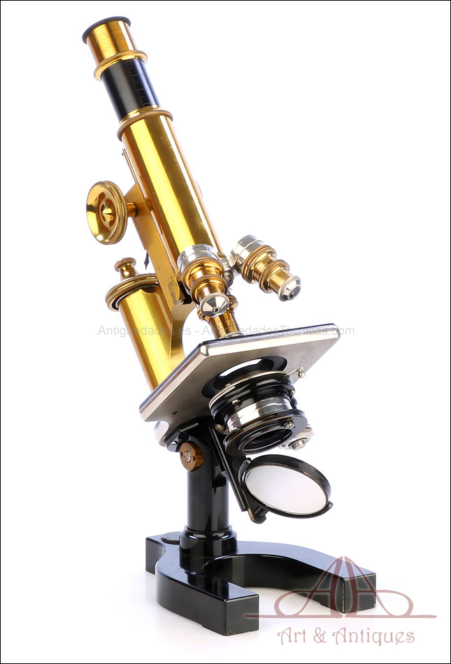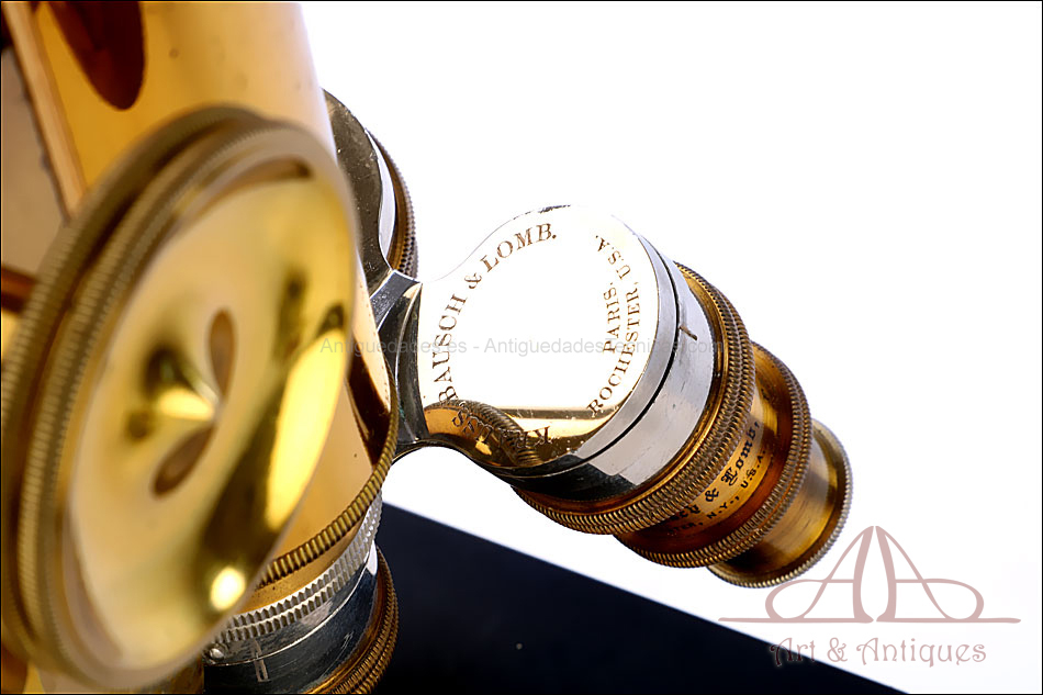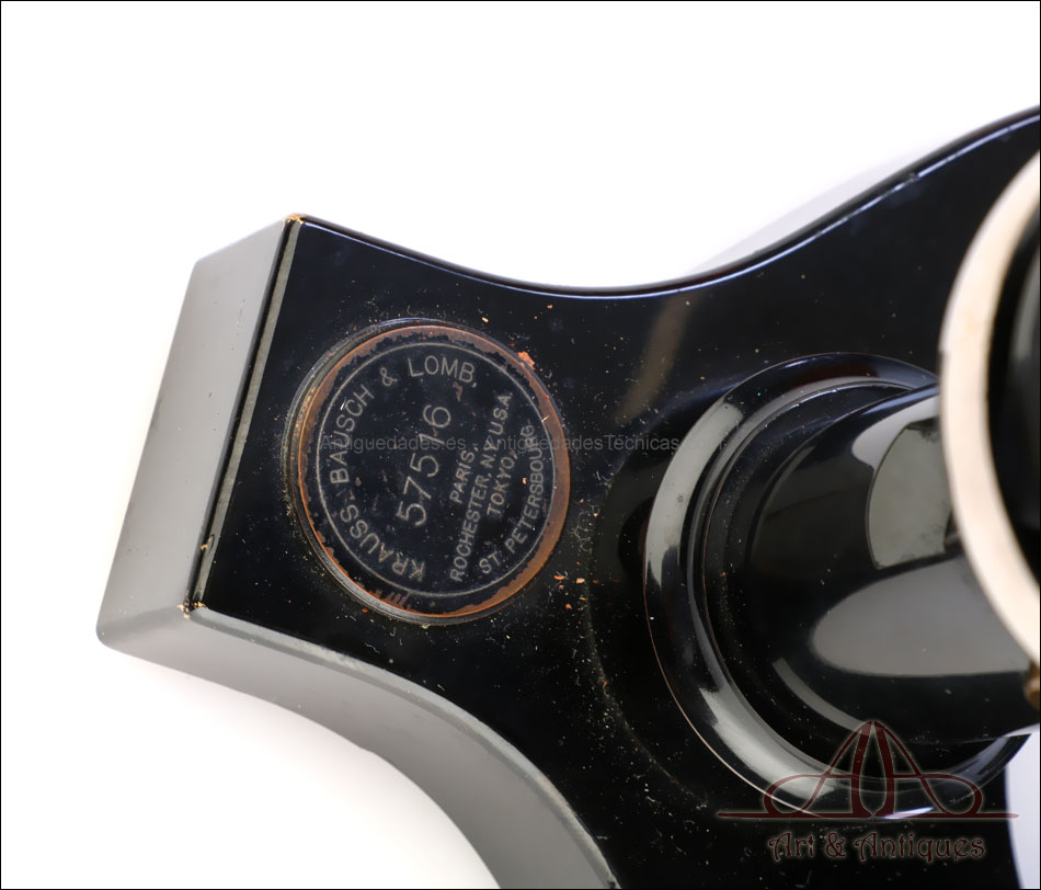 Bello y antiguo microscopio Krauss, Bausch & Lomb fabricado en Nueva York, USA, circa 1910, con juego de lentes y oculares y en su estuche original. Llama la atención el magnífico estado de conservación que muestra este instrumento: la parte superior de latón está lisa y brillante, con el barniz protector transparente original en buenas condiciones y sin rastros de óxido o desgaste. La parte inferior, formada por la pletina para muestras y el pie de herradura, es de metal esmaltado en negro; el acabado está en excelentes condiciones, casi como nuevo. Todas las partes del microscopio son originales y se mueven con suavidad, encontrándose en perfecto estado de funcionamiento; la cremallera es un buen ejemplo de ello.