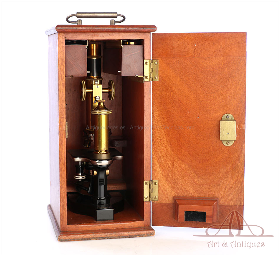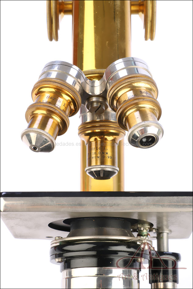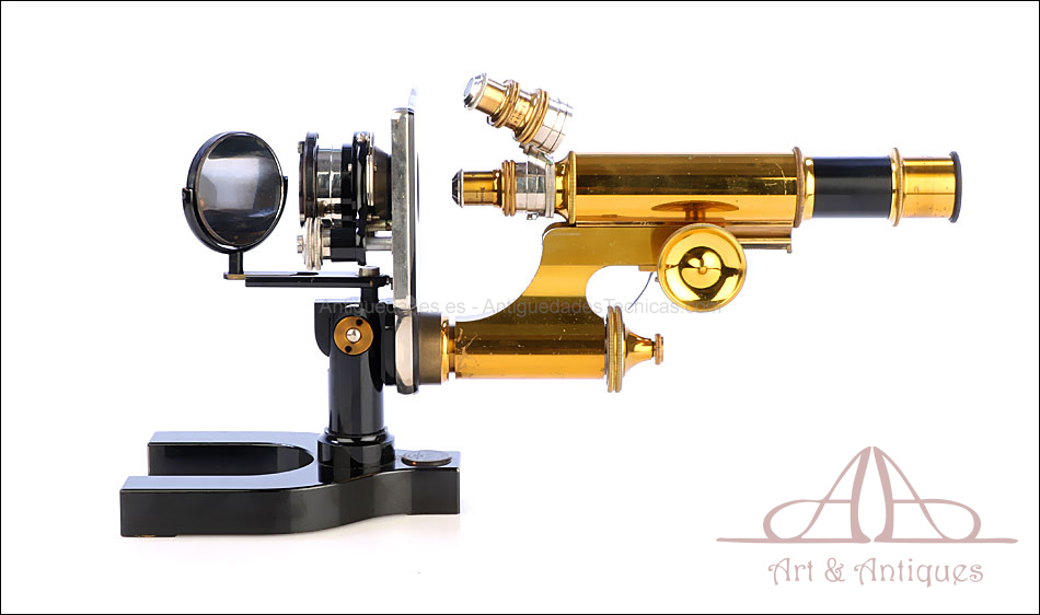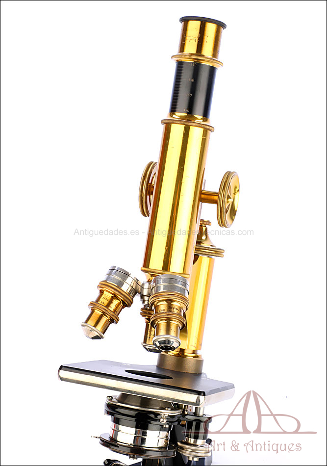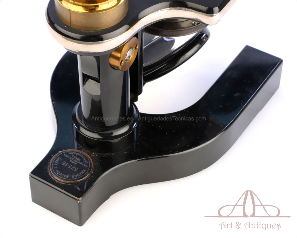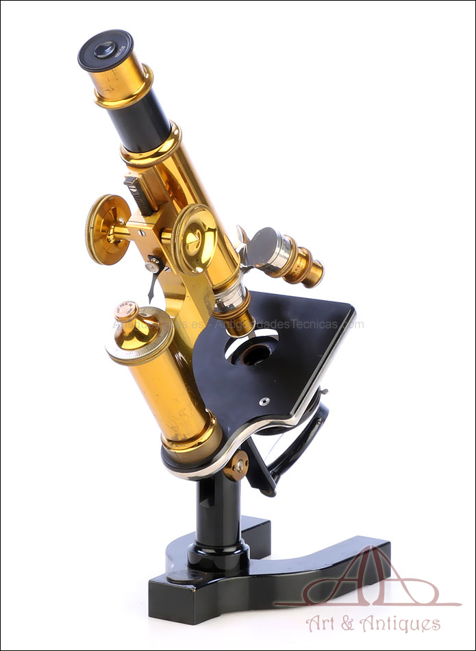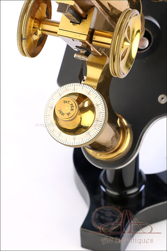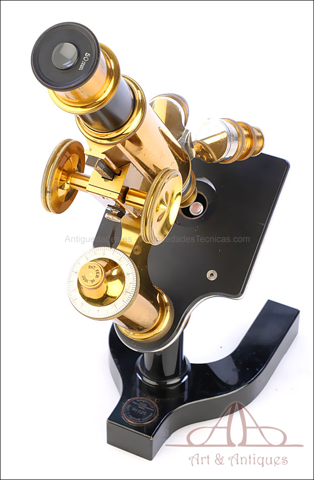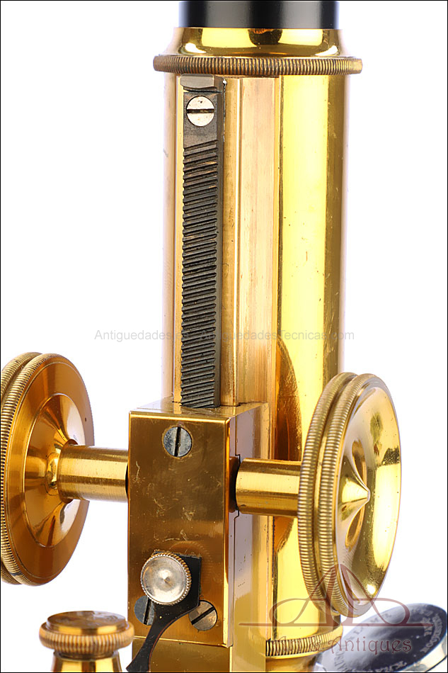 Bello y antiguo microscopio Krauss, Bausch & Lomb fabricado en Nueva York, USA, circa 1910, con juego de lentes y oculares y en su estuche original. Llama la atención el magnífico estado de conservación que muestra este instrumento: la parte superior de latón está lisa y brillante, con el barniz protector transparente original en buenas condiciones y sin rastros de óxido o desgaste. La parte inferior, formada por la pletina para muestras y el pie de herradura, es de metal esmaltado en negro; el acabado está en excelentes condiciones, casi como nuevo. Todas las partes del microscopio son originales y se mueven con suavidad, encontrándose en perfecto estado de funcionamiento; la cremallera es un buen ejemplo de ello.