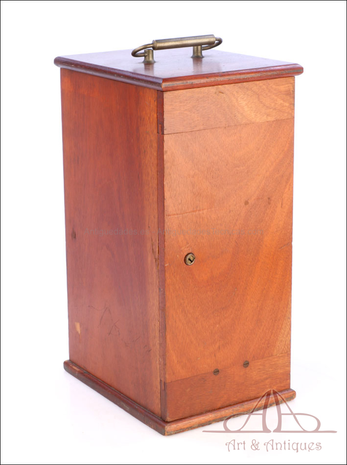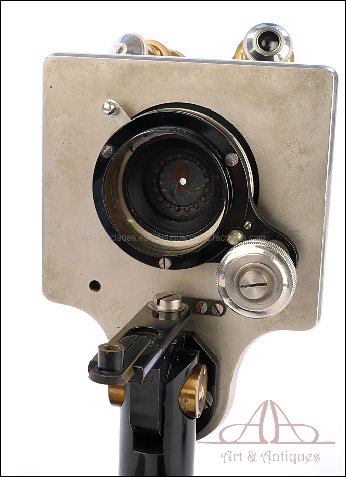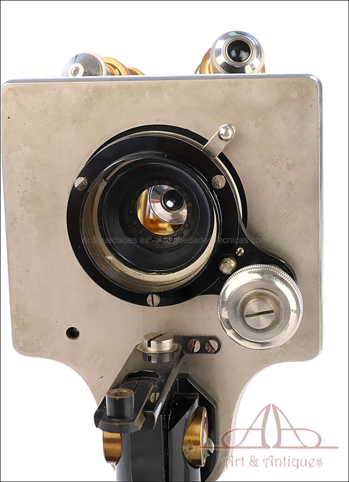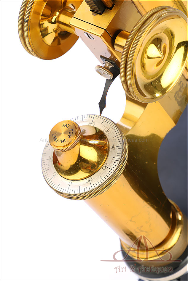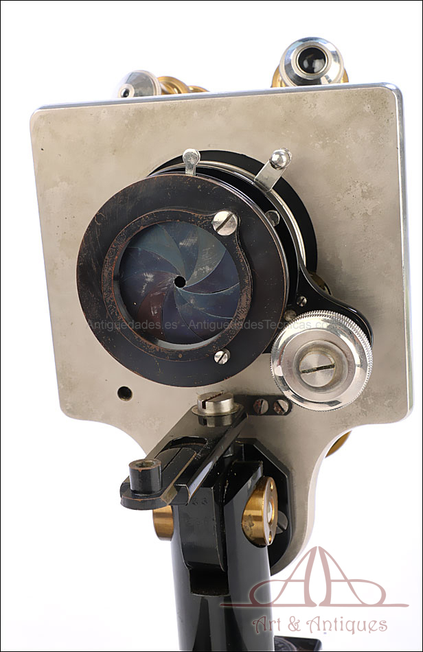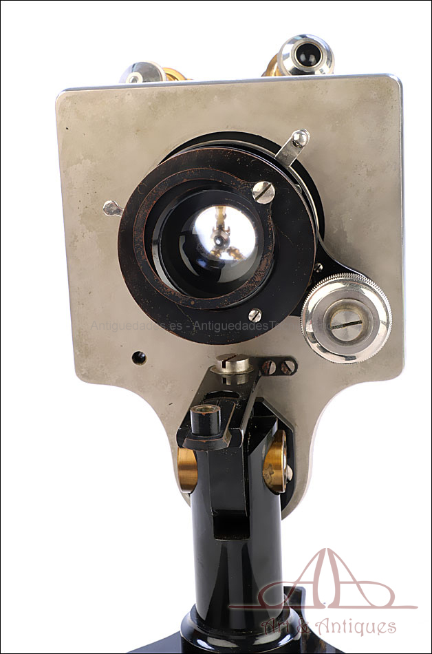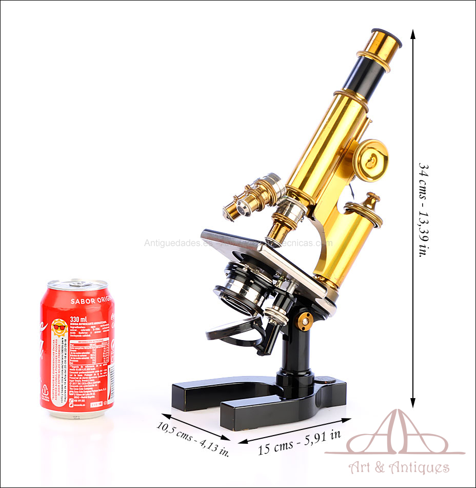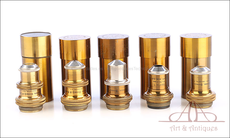Bello y antiguo microscopio Krauss, Bausch & Lomb fabricado en Nueva York, USA, circa 1910, con juego de lentes y oculares y en su estuche original. Llama la atención el magnífico estado de conservación que muestra este instrumento: la parte superior de latón está lisa y brillante, con el barniz protector transparente original en buenas condiciones y sin rastros de óxido o desgaste. La parte inferior, formada por la pletina para muestras y el pie de herradura, es de metal esmaltado en negro; el acabado está en excelentes condiciones, casi como nuevo. Todas las partes del microscopio son originales y se mueven con suavidad, encontrándose en perfecto estado de funcionamiento; la cremallera es un buen ejemplo de ello.