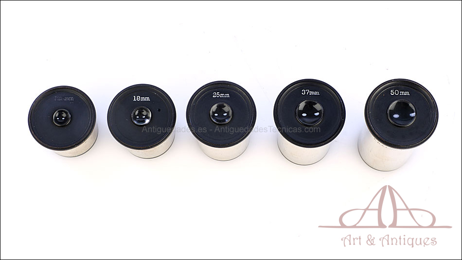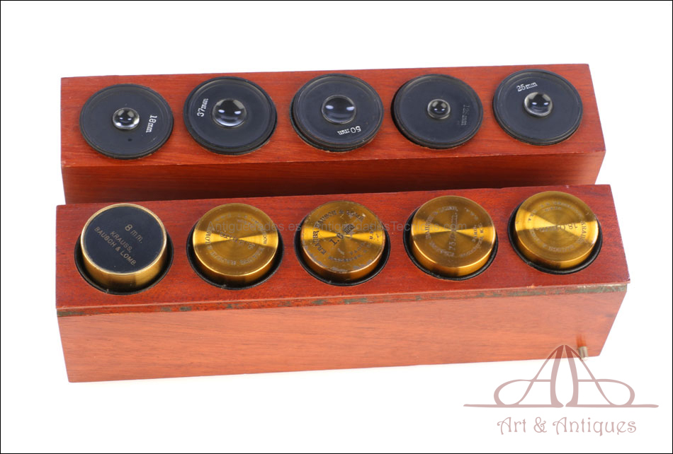 En el estuche de guardado, original de época, encontramos un juego de 5 objetivos y 5 oculares firmados por la marca. Uno de los objetivos no se puede utilizar, ya que le falta una lente; el resto se encuentran en buen estado de uso. En la parte trasera de la base hay una placa circular de color negro con el nombre de los fabricantes y el número de serie: KRAUSS, BAUSCH & LOMB – 57516 – PARIS, ROCHESTER, NY, USA, TOKYO, ST. PETERSBURG. El estuche de guardado es una hermosa caja de madera de caoba maciza en magnífico estado, perfecta para conservar el microscopio y transportarlo.