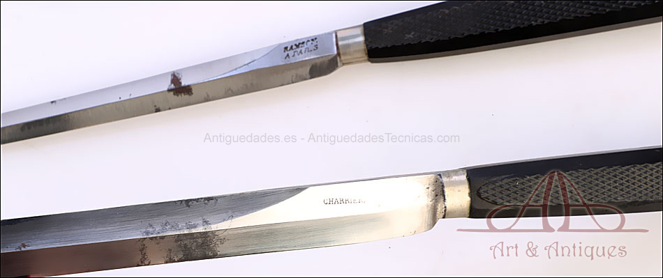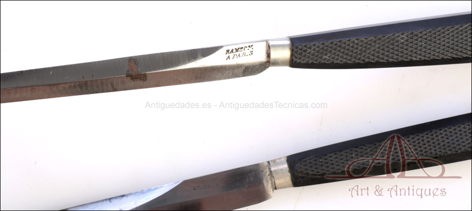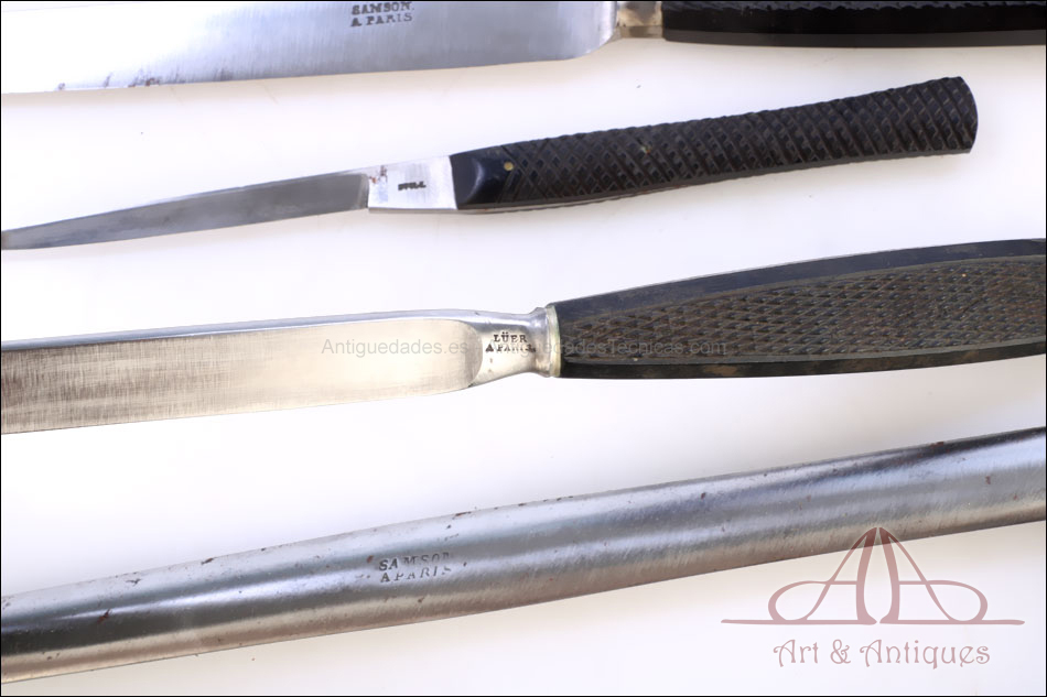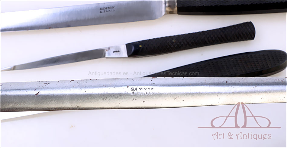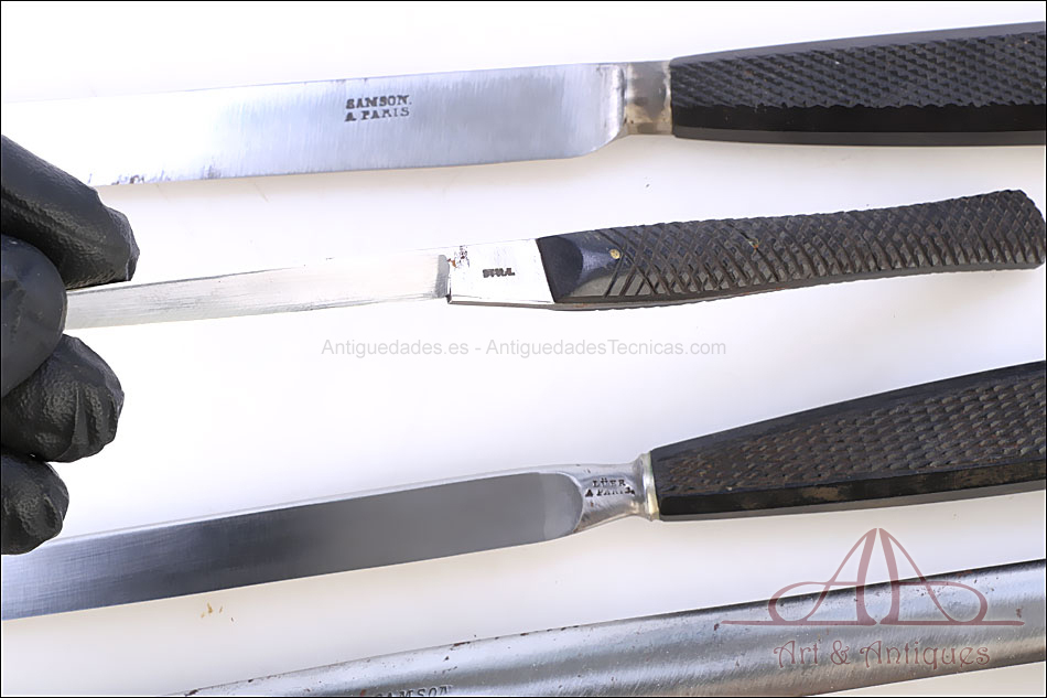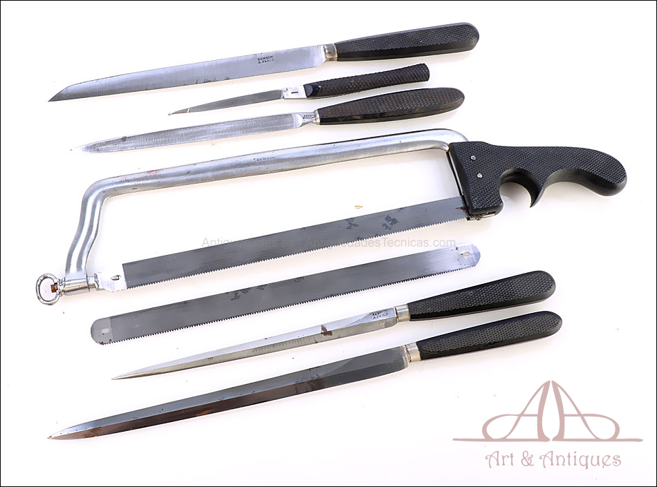 Estuche de cirujano antiguo fabricado circa 1850, con herramientas originales de época. El instrumental está firmado por distintas marcas: distinguimos el sello de SAMSON A PARIS, LÜER, CHARRIERE y un cuarto fabricante cuyo nombre no es posible identificar. El instrumental no está completo, pero aun así integra una interesante colección de útiles empleados para hacer amputaciones y operaciones de emergencia. En concreto, está formado por una sierra de arco con una hoja extra, varios cuchillos y una espátula. Todas las piezas están en muy buenas condiciones, con las empuñaduras negras en excelente estado y las hojas de acero con pocos signos de uso o desgaste. El estuche en sí es de gran tamaño, con un ancho de más de 50 cm. Se trata de una caja de madera de forma alargada, revestida por el exterior en piel negra y por el interior de fieltro color verde oliva. Lleva una bandeja extraíble y compartimentos para guardar las distintas herramientas.