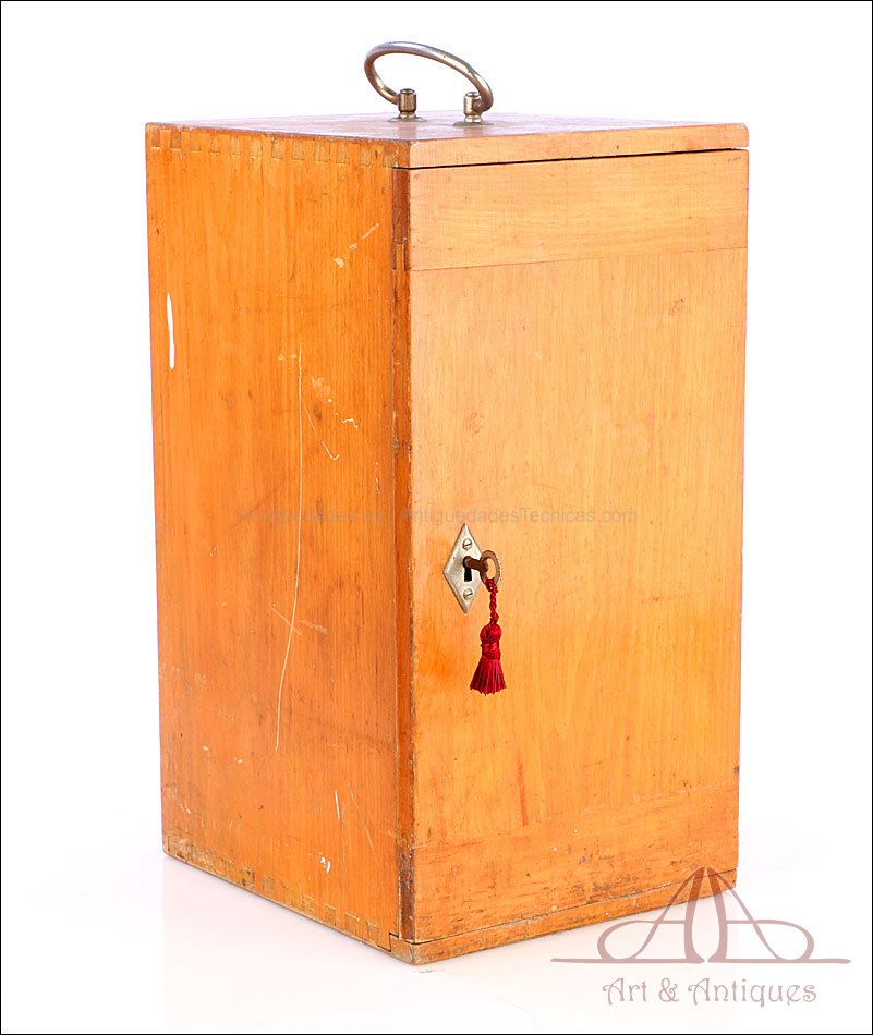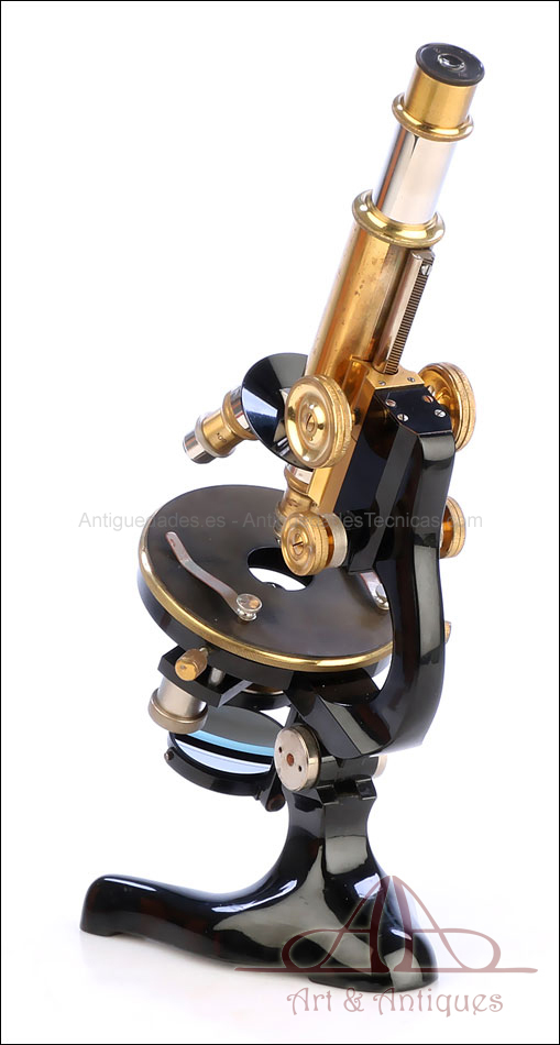 Antiguo microscopio Otto Teichgräber fabricado en Alemania circa 1920, con juego de lentes y objetivos y estuche de guardado. El microscopio está en muy buen estado y conserva todas sus piezas y componentes originales. Funciona muy bien: la cremallera se mueve con suavidad, al igual que el resto de los tornillos y engranajes, permitiendo emplear el instrumento para visualizar muestras con claridad. Lleva revólver de tres lentes y parte superior de latón y metal cromado, con el latón protegido por la laca transparente original que le aporta la inconfundible pátina de los aparatos científicos de principios de siglo. El microscopio va montado sobre una base de herradura esmaltada en negro; el esmalte se encuentra en magnífico estado, liso y brillante como el primer día. En la torre podemos ver grabado el nombre del fabricante y el número de serie: Otto Teichgräber – Berlin – 4568. El estuche es el original del microscopio, fabricado en madera de haya maciza y en óptimas condiciones. Lleva una placa con el nombre y conserva la cerradura y la llave en estado de funcionamiento.