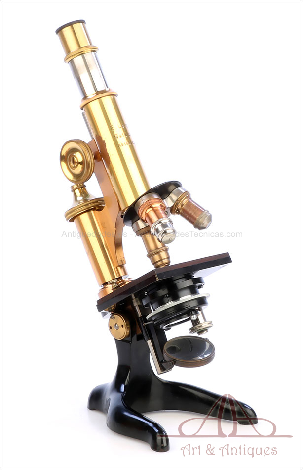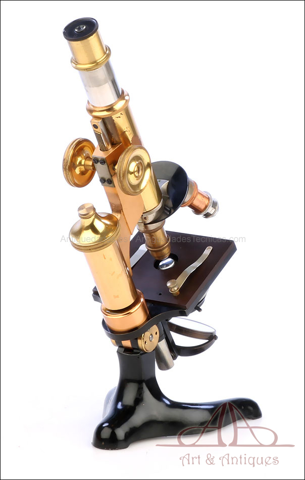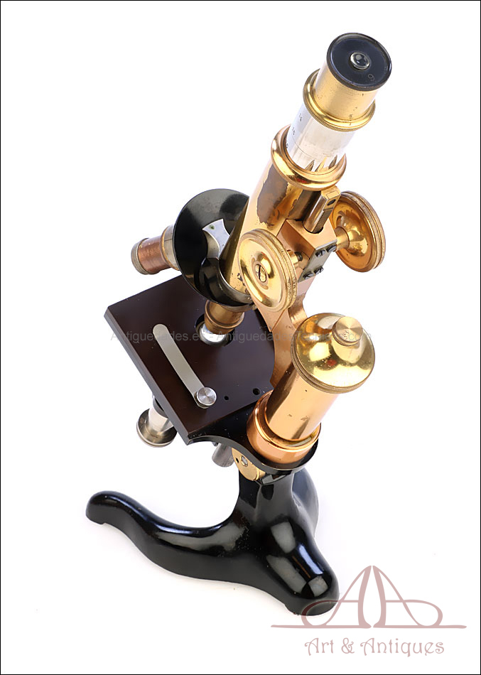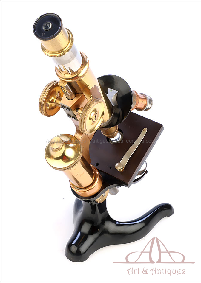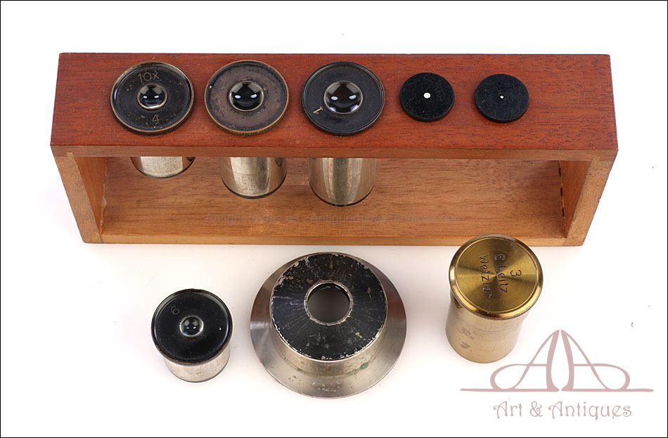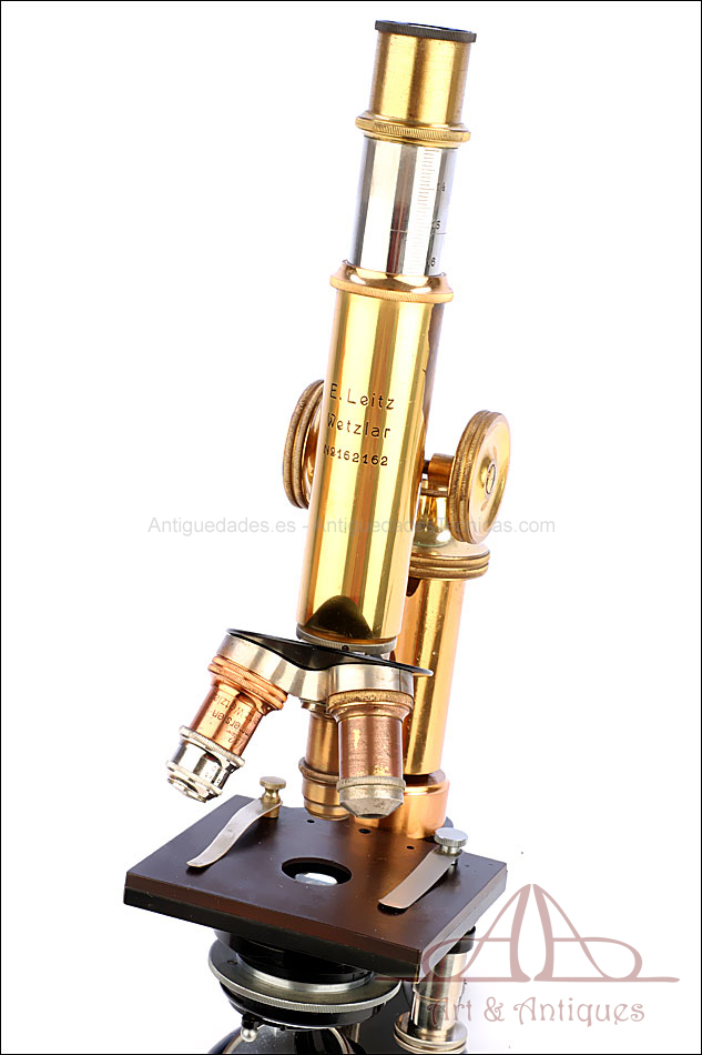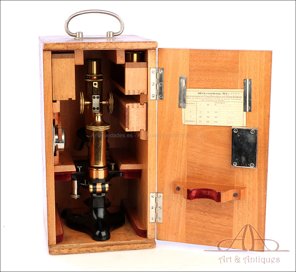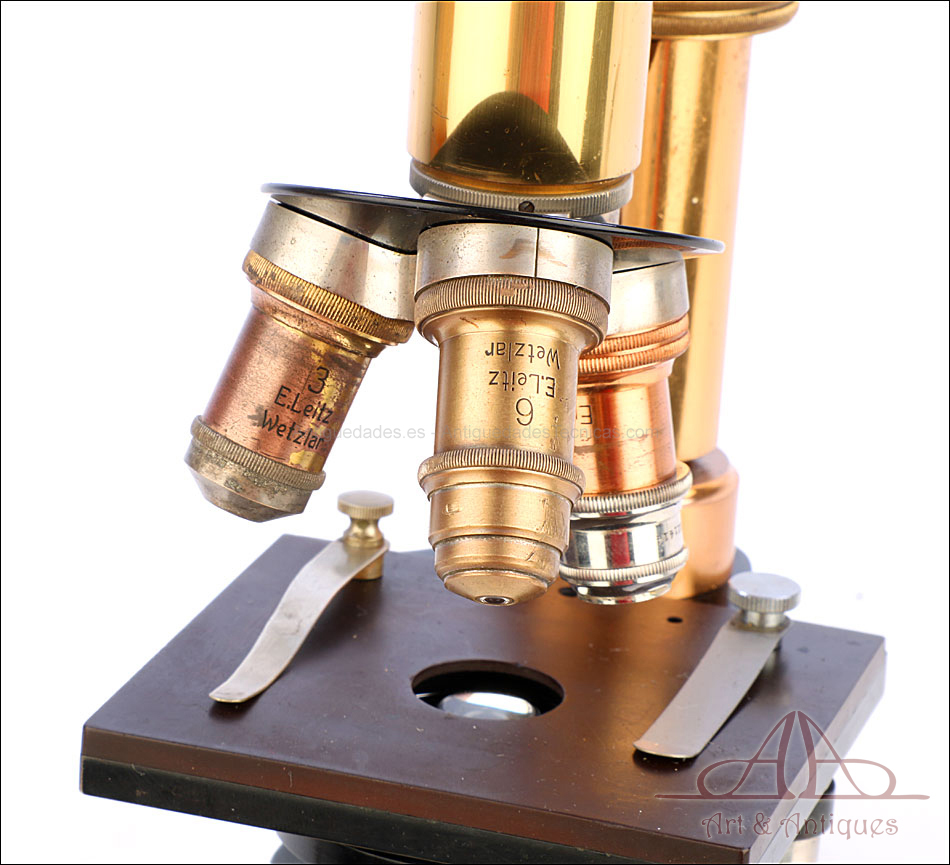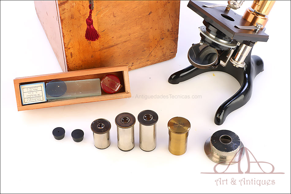 Antiguo microscopio Ernst Leitz Wetlzar fabricado en Alemania en 1913, en su estuche original y con juego de oculares y objetivos. El microscopio es totalmente original y funciona bien, permitiendo visualizar muestras y preparados. Lleva revólver de tres lentes y pie de herradura de metal esmaltado en negro, encontrándose todas las partes en muy buen estado de conservación. La parte superior es de latón y mantiene el acabado protector original de época, que aporta al metal una preciosa y cálida pátina. La torre lleva grabada la inscripción E. Leitz Wezlar y el número de serie Nº 162162, que coincide con el que aparece escrito a mano en la etiqueta del interior del estuche y marcado en el borde de la puerta de madera. Los objetivos también llevan grabado el nombre del fabricante; solo uno de ellos conserva la funda de guardado. La cremallera que permite deslizar la torre para enfocar las muestras está en excelente estado y se desliza con suavidad. En cuanto al estuche, está en muy buenas condiciones y conserva la cerradura y la llave en funcionamiento.