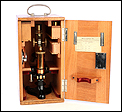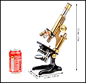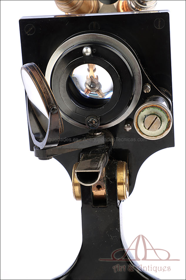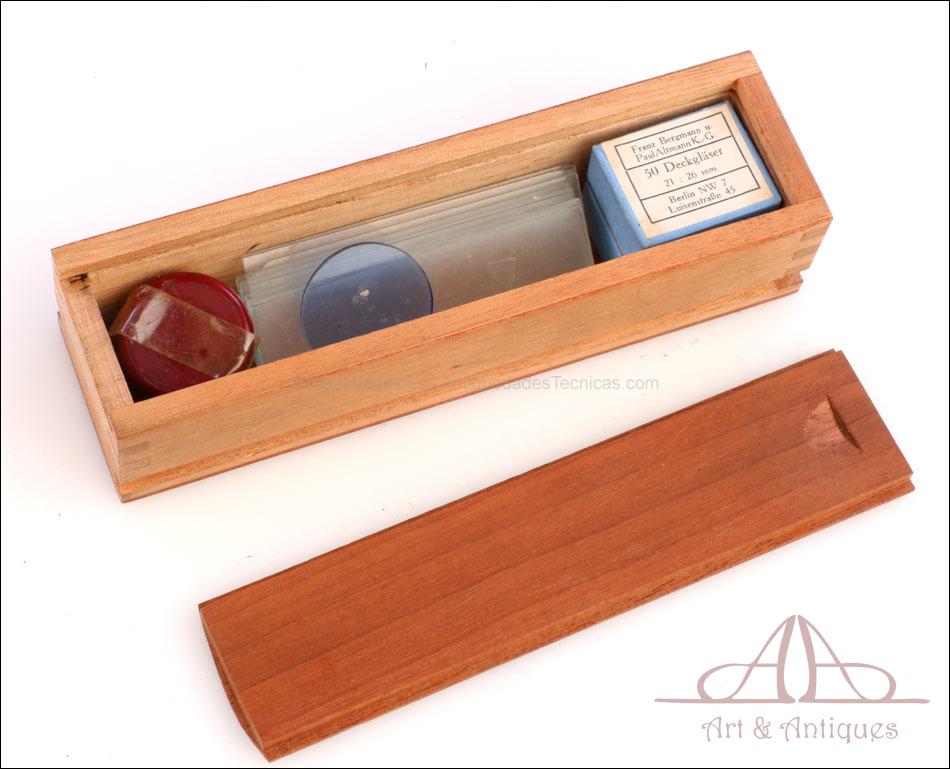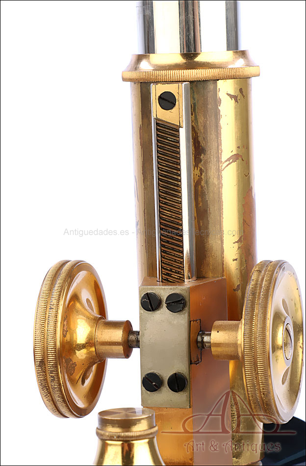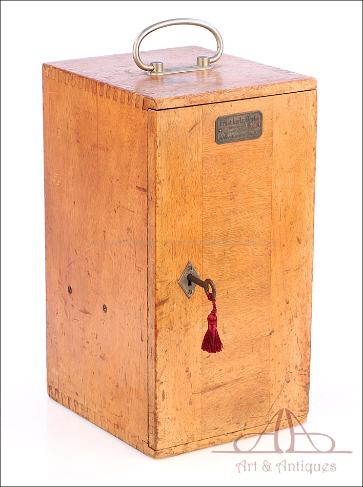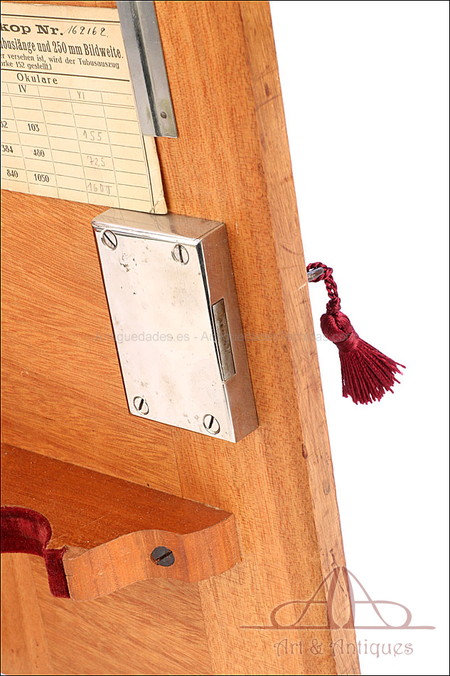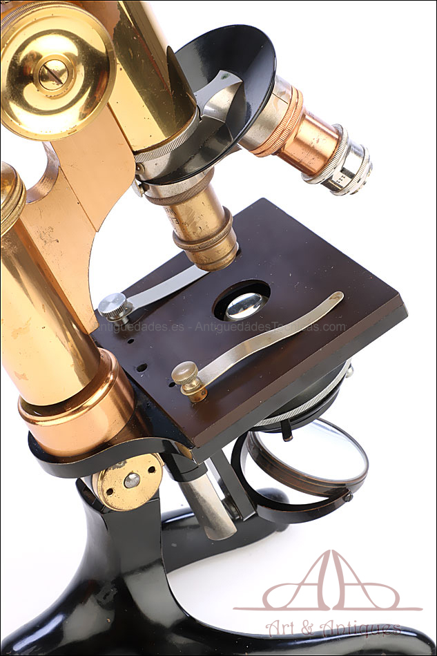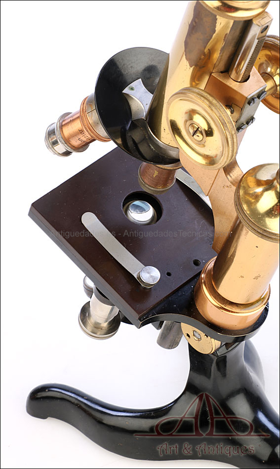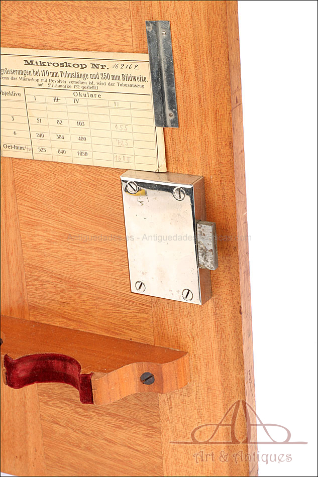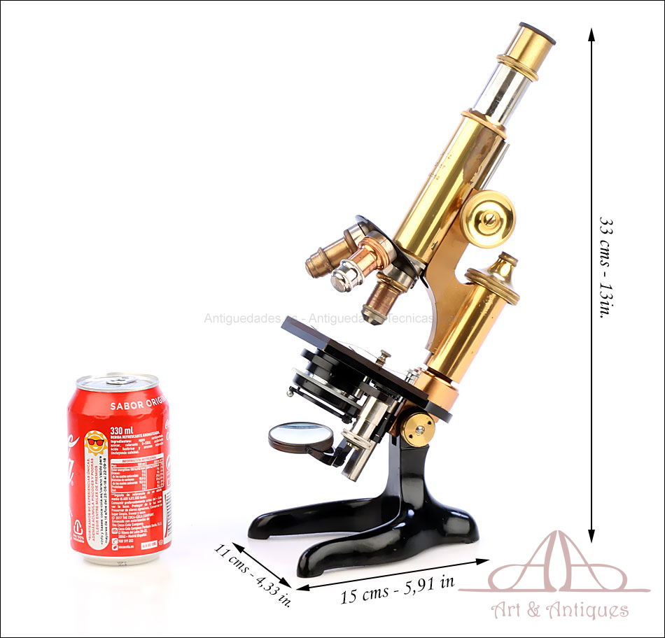 Antiguo microscopio Ernst Leitz Wetlzar fabricado en Alemania en 1913, en su estuche original y con juego de oculares y objetivos. El microscopio es totalmente original y funciona bien, permitiendo visualizar muestras y preparados. Lleva revólver de tres lentes y pie de herradura de metal esmaltado en negro, encontrándose todas las partes en muy buen estado de conservación. La parte superior es de latón y mantiene el acabado protector original de época, que aporta al metal una preciosa y cálida pátina. La torre lleva grabada la inscripción E. Leitz Wezlar y el número de serie Nº 162162, que coincide con el que aparece escrito a mano en la etiqueta del interior del estuche y marcado en el borde de la puerta de madera. Los objetivos también llevan grabado el nombre del fabricante; solo uno de ellos conserva la funda de guardado. La cremallera que permite deslizar la torre para enfocar las muestras está en excelente estado y se desliza con suavidad. En cuanto al estuche, está en muy buenas condiciones y conserva la cerradura y la llave en funcionamiento.