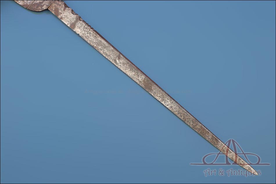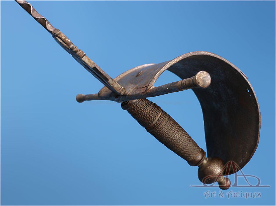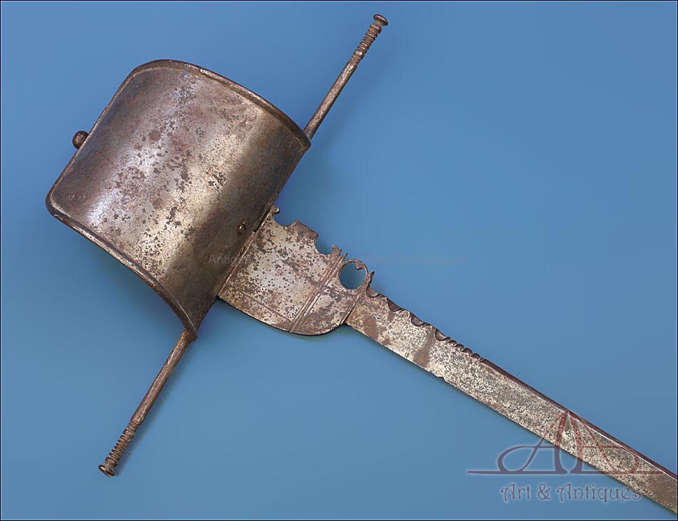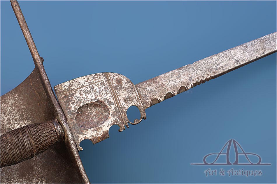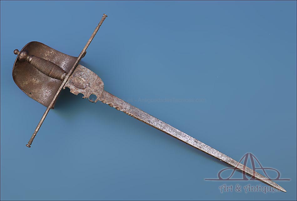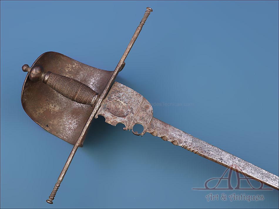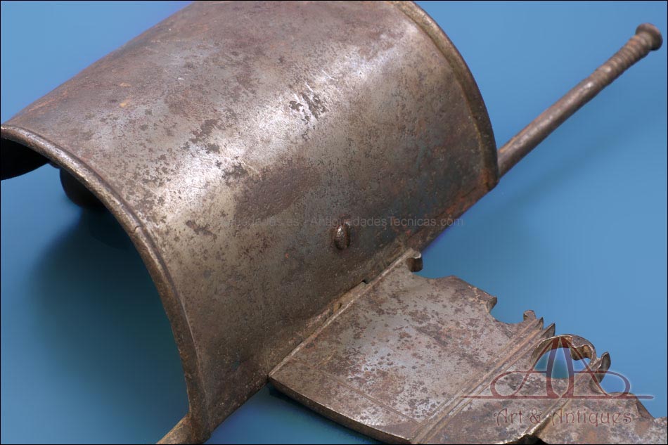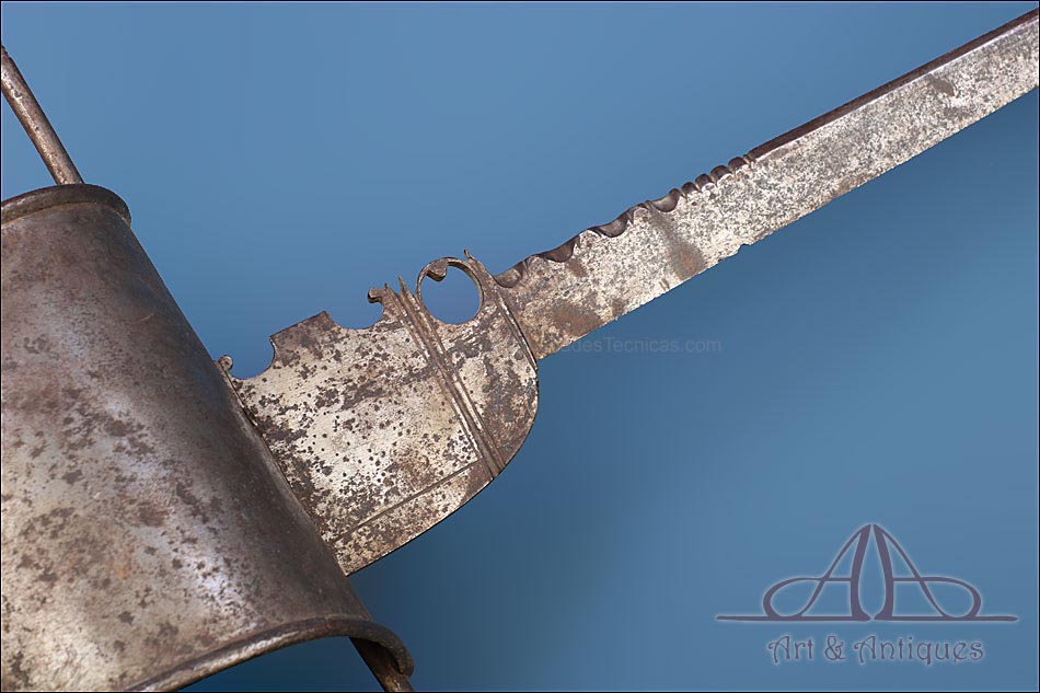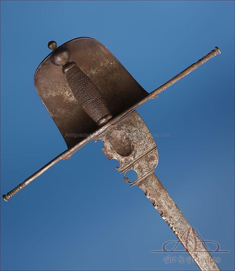 Magnífica y antigua daga de mano izquierda, fabricada posiblemente en España en el siglo XVII (circa 1650). Se trata de una pieza cien por cien original de la época, con más de 350 años de antigüedad y bien conservada. La daga conserva la pátina creada por el paso de los siglos, lo que le aporta aún más interés y autenticidad. Su diseño es elegante y atractivo: la hoja lleva muescas semicirculares que ayudan al portador de la daga a atrapar la espada del contrincante durante el combate. La empuñadura lleva cruz con gavilantes rectos, largos y cilíndricos, y guardamano de tipo vela. La vela de la guarda se mueve, pero no parece un desperfecto o que se haya soltado de algún punto, sino que el modelo es así y el tiempo le dado holgura. El puño está alambrado con el torzal original de metal. La parte superior de la hoja, más ancha y con un orificio circular, está decorada con líneas perpendiculares grabadas a mano.