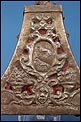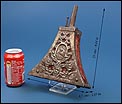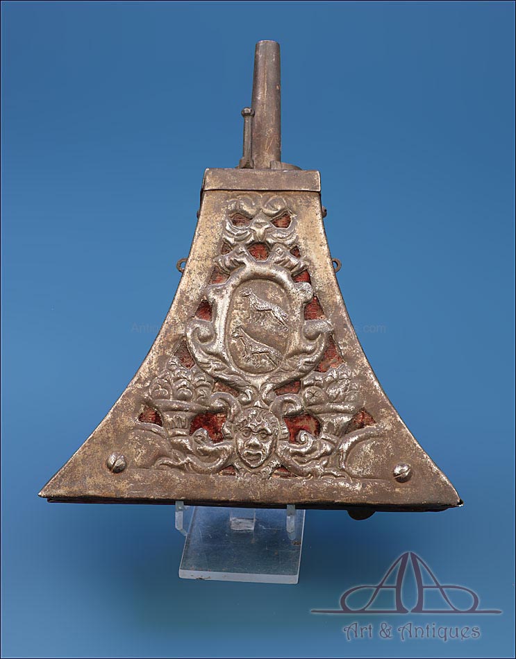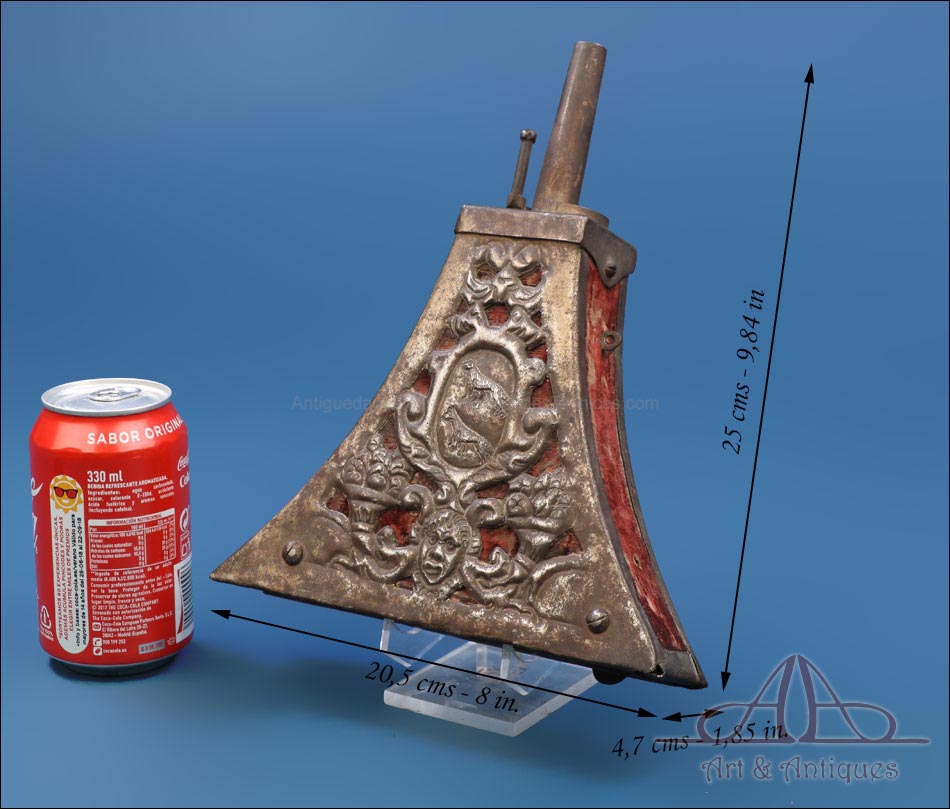 Confeccionada en metal finamente trabajado con calados en celosía, la pieza presenta una elaborada decoración frontal de carácter nobiliario. En el centro, un escudo heráldico ovalado ostenta con orgullo dos lobos rampantes mirando hacia la izquierda, símbolo inequívoco de la familia Ayala. Esta poderosa familia, vinculada directamente al rey, armó y financió una tropa de élite compuesta por arcabuceros, lo cual dota a esta polvorera de un contexto histórico tan interesante como exclusivo. Cada soldado de este ejército llevaba una pieza como esta, lo que la convierte en un testimonio tangible de una época en la que el honor, la nobleza y la pólvora iban de la mano.