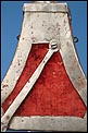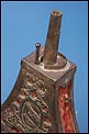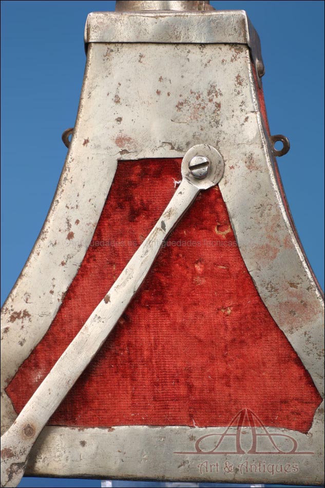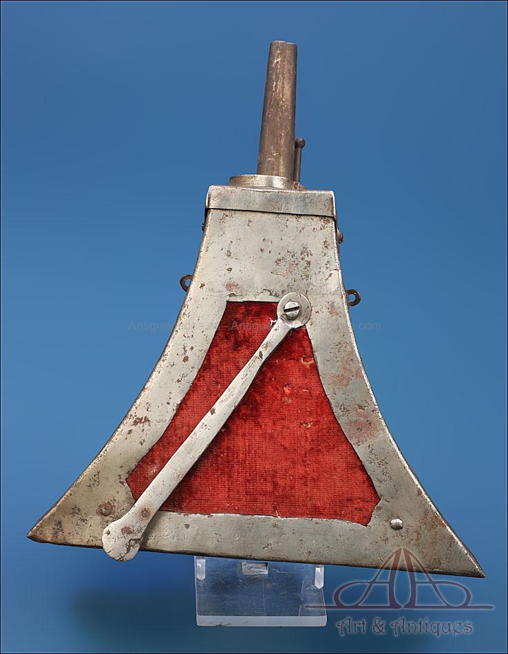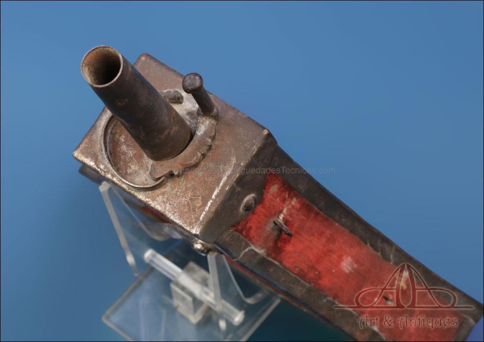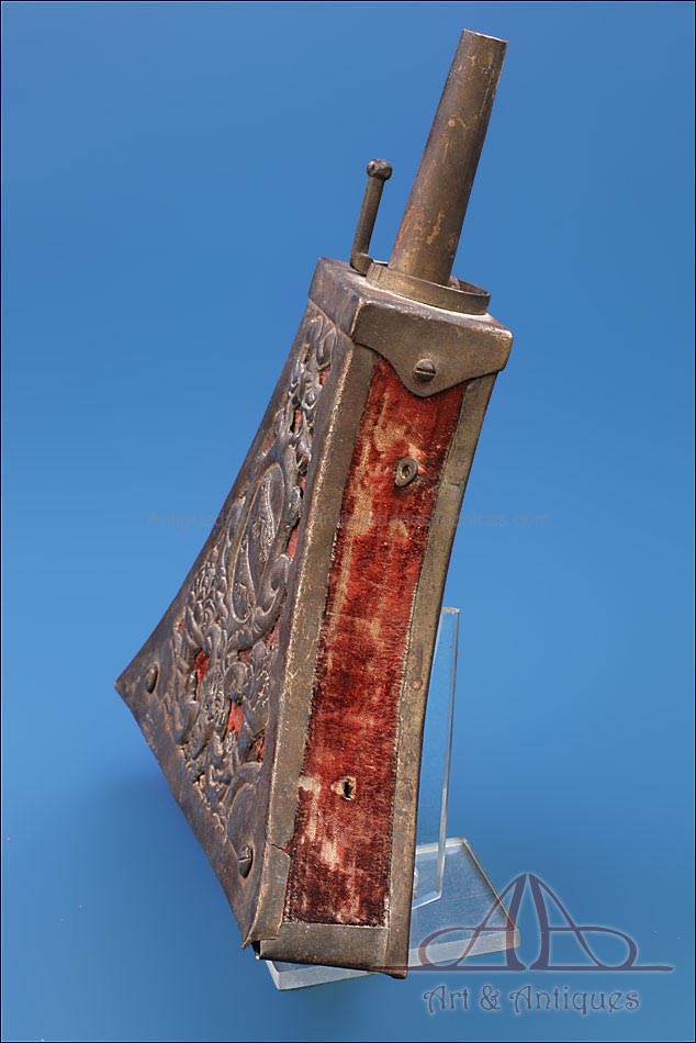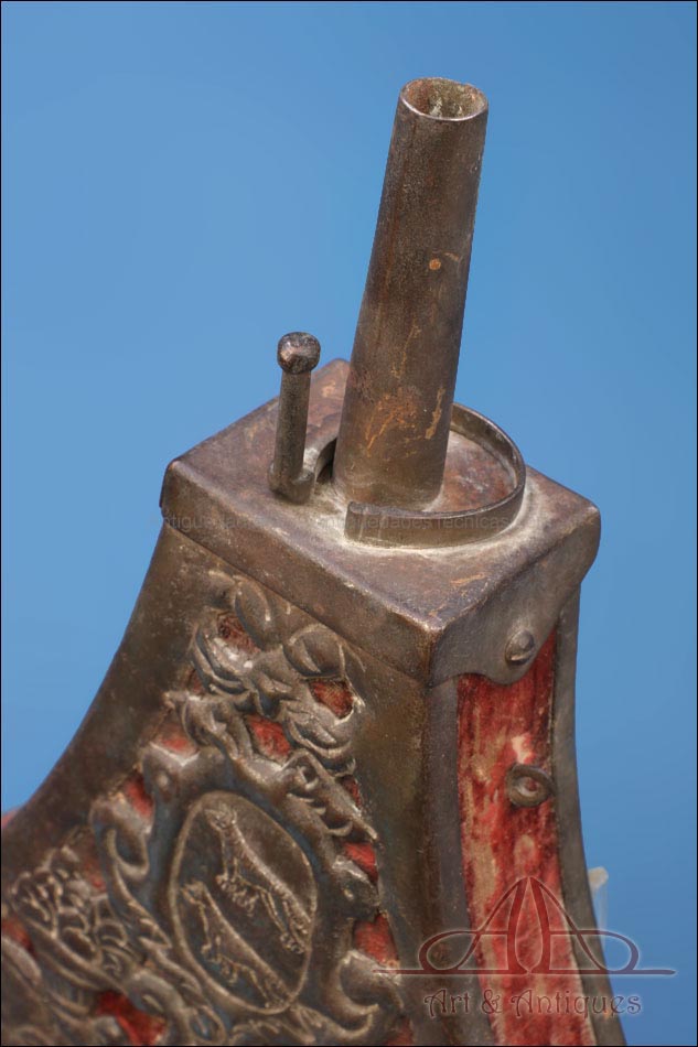 El interior conserva su recubrimiento original de terciopelo rojo, notable tanto por su color como por su integridad, teniendo en cuenta el paso del tiempo. En la parte superior se alza una boquilla cónica de metal, equipada con un sistema de cierre mecánico en perfecto estado de funcionamiento. Este mecanismo permitía al arcabucero cargar con seguridad y precisión durante el combate, algo fundamental en las formaciones militares del Siglo de Oro español. En la parte trasera, la polvorera conserva su pletina de sujeción, diseñada para engancharse al cinturón del uniforme. Ambas estructuras, boquilla y pletina, se encuentran en excelente estado, confirmando la alta calidad de su fabricación original.