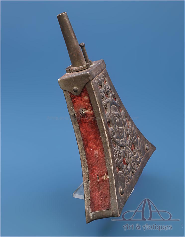 Antigua, histórica y con un origen noble, esta imponente polvorera para arcabucero español del siglo XVI, circa 1580, es una joya de la historia militar europea. Procedente de España y en muy buen estado de conservación para sus más de cuatro siglos de existencia, esta pieza no solo destaca por su función utilitaria sino también por su fuerte carga simbólica y heráldica. Se trata de una polvorera auténtica, utilizada por uno de los cuatrocientos hombres que conformaban el ejército privado de la influyente familia Ayala, al servicio del monarca Felipe II.