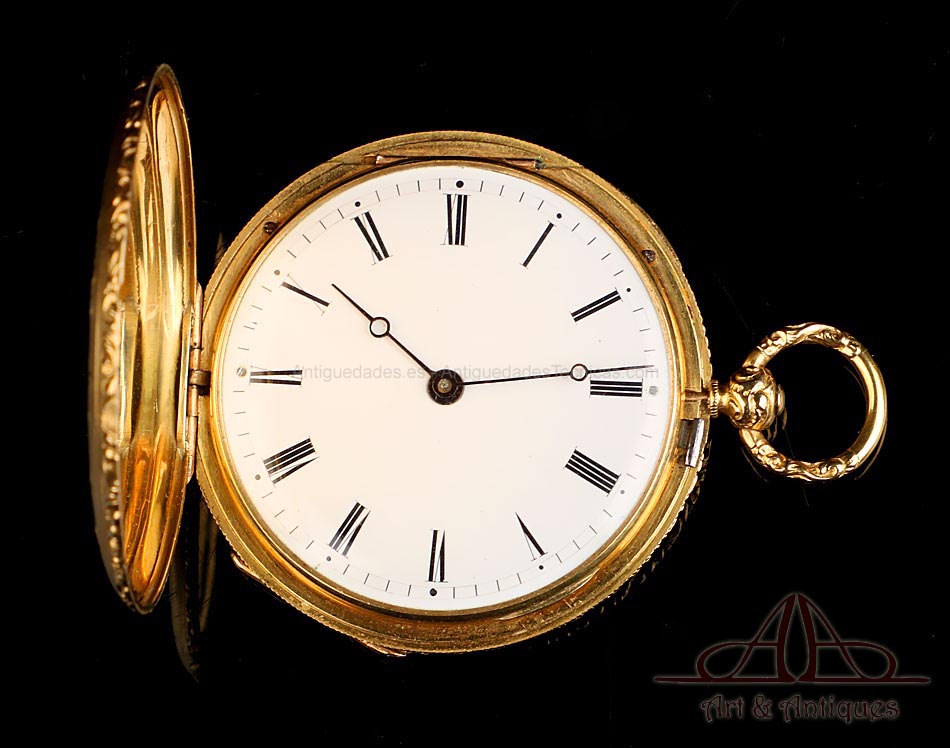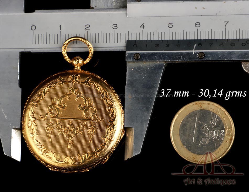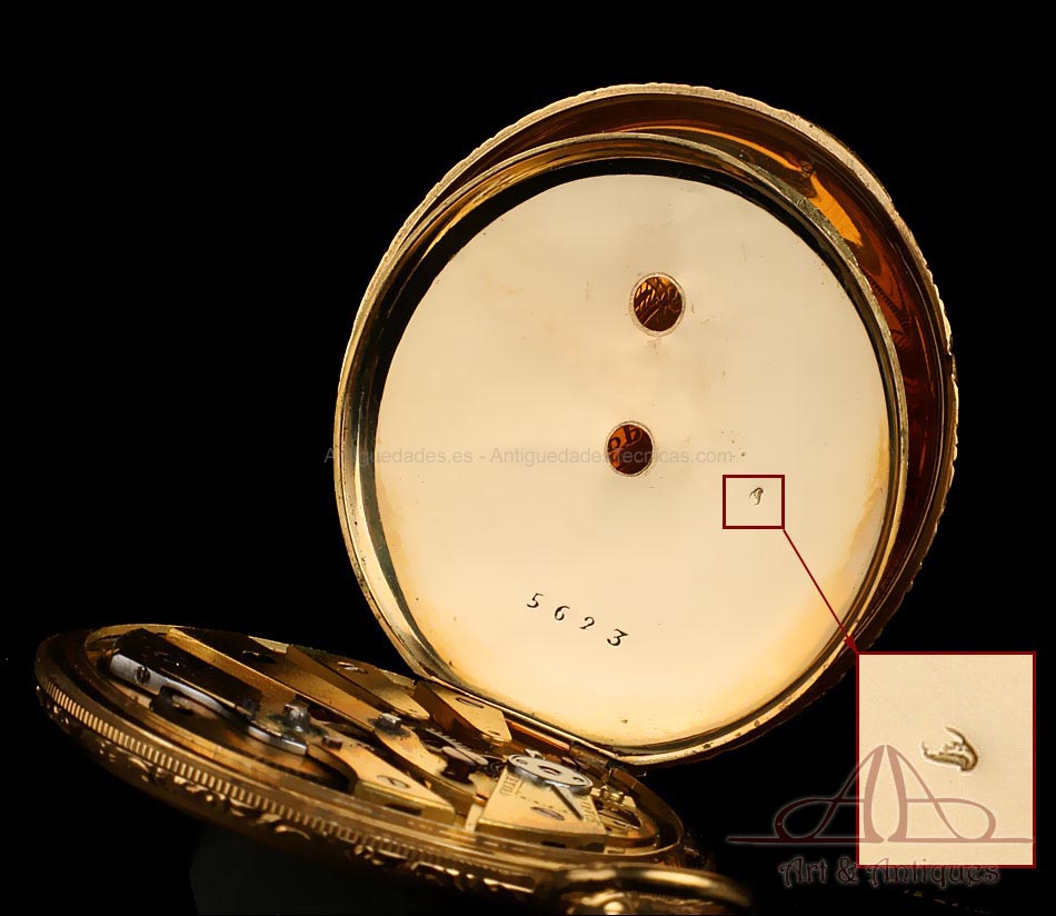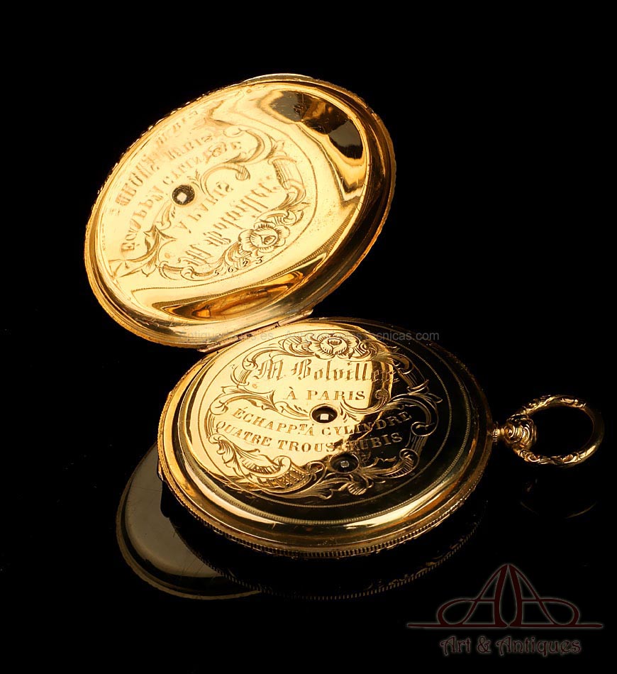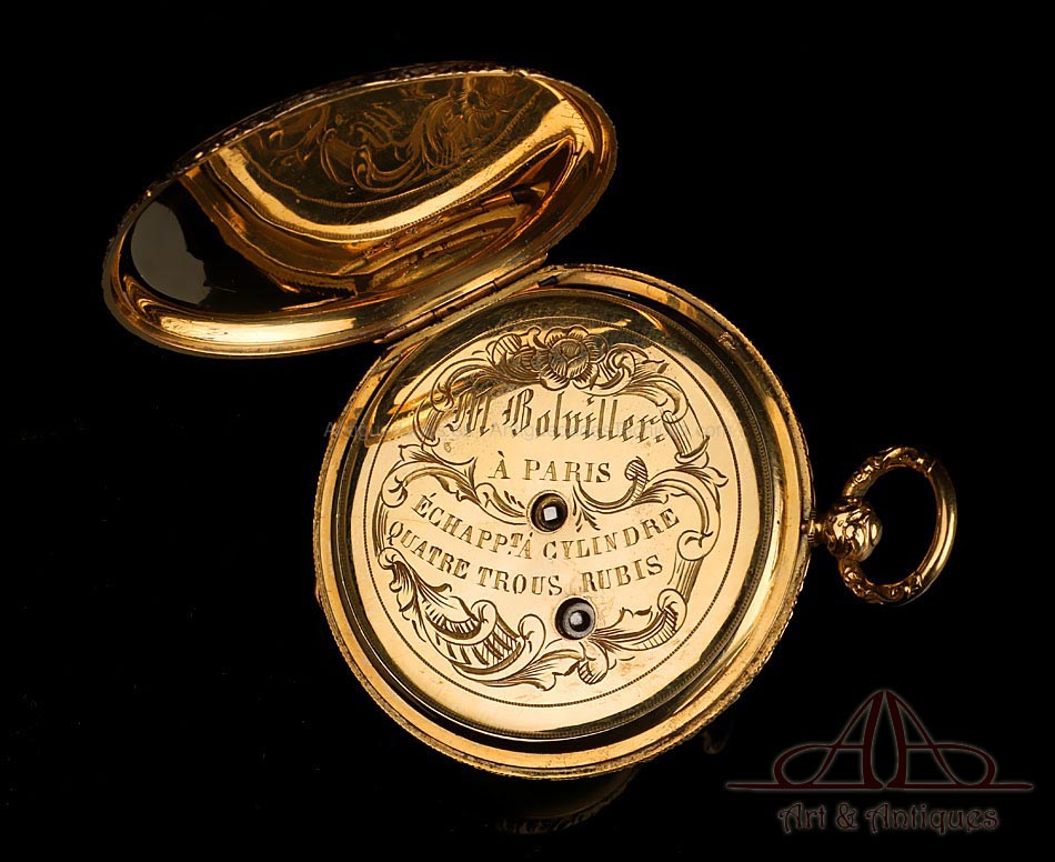 Fantástico reloj de bolsillo antiguo para señora en oro de 18K, firmado por M. Bolviller y fabricado en Francia circa 1860. Este reloj es de pequeño tamaño, diseñado para ser llevado a modo de broche o como colgante para el cuello, y funcionando bien. Lleva tres tapas de oro macizo de 18K, todas ellas con varios contrastes. Entre las marcas podemos ver una cabeza de águila, un sello empleado entonces para distinguir el oro de 18K en Francia. Las tapas están decoradas con preciosos grabados de estilo clásico, plenos de volutas simétricas y motivos florales. La esfera es blanca, con números romanos negros y agujas Breguet. La tapa guardapolvo lleva grabado el nombre de Moïse Bolviller (1800-1874), relojero francés que vivió y trabajó en París, acompañado de hermosas volutas grabadas a mano. En el interior de las tapas también podemos ver el número de serie 5623.