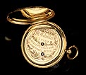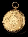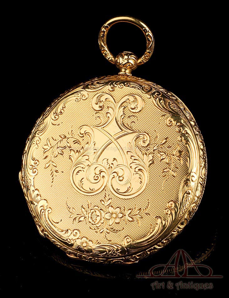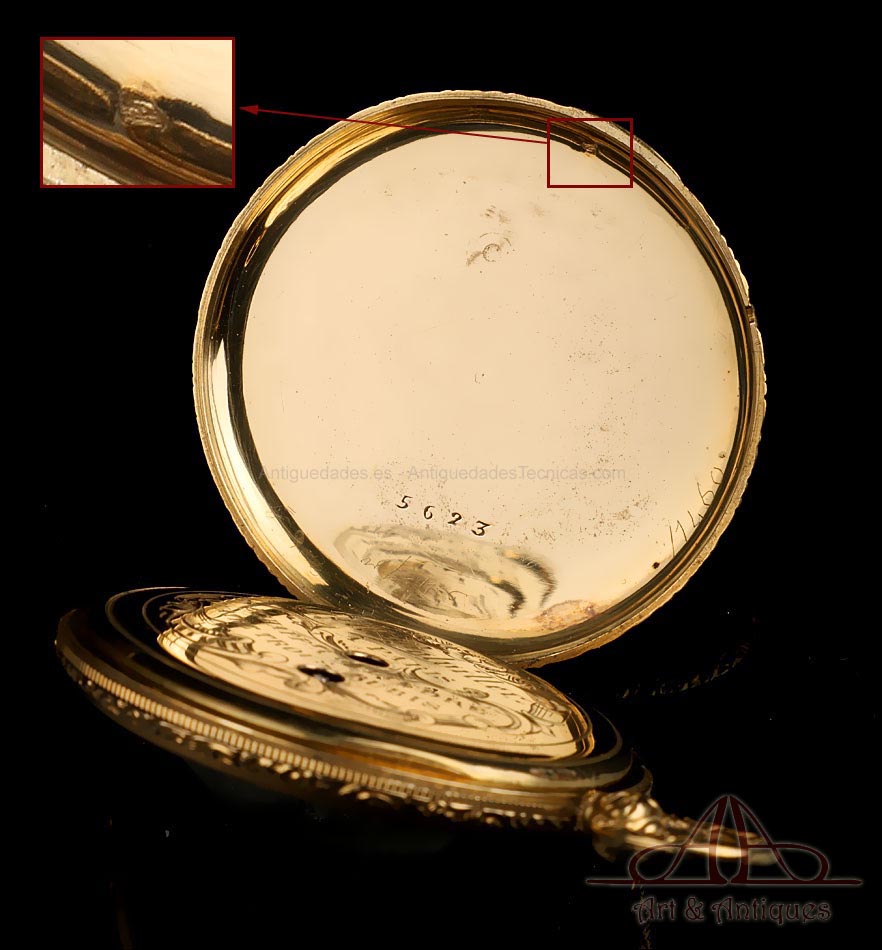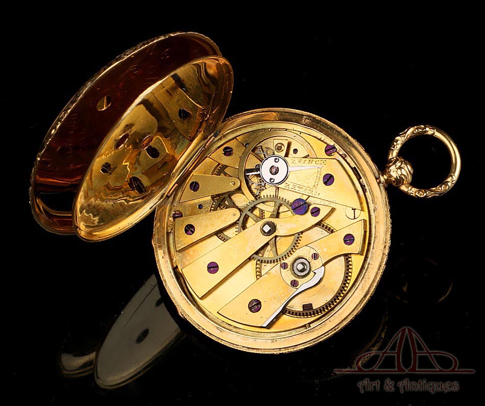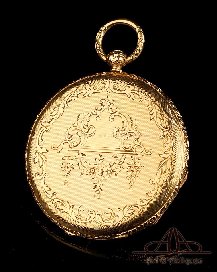 Fantástico reloj de bolsillo antiguo para señora en oro de 18K, firmado por M. Bolviller y fabricado en Francia circa 1860. Este reloj es de pequeño tamaño, diseñado para ser llevado a modo de broche o como colgante para el cuello, y funcionando bien. Lleva tres tapas de oro macizo de 18K, todas ellas con varios contrastes. Entre las marcas podemos ver una cabeza de águila, un sello empleado entonces para distinguir el oro de 18K en Francia. Las tapas están decoradas con preciosos grabados de estilo clásico, plenos de volutas simétricas y motivos florales. La esfera es blanca, con números romanos negros y agujas Breguet. La tapa guardapolvo lleva grabado el nombre de Moïse Bolviller (1800-1874), relojero francés que vivió y trabajó en París, acompañado de hermosas volutas grabadas a mano. En el interior de las tapas también podemos ver el número de serie 5623.