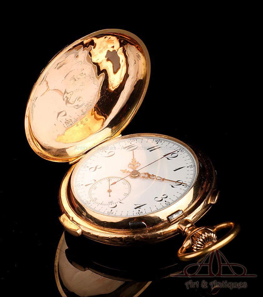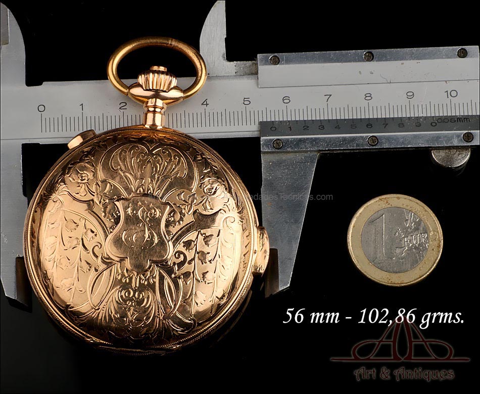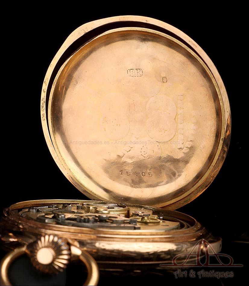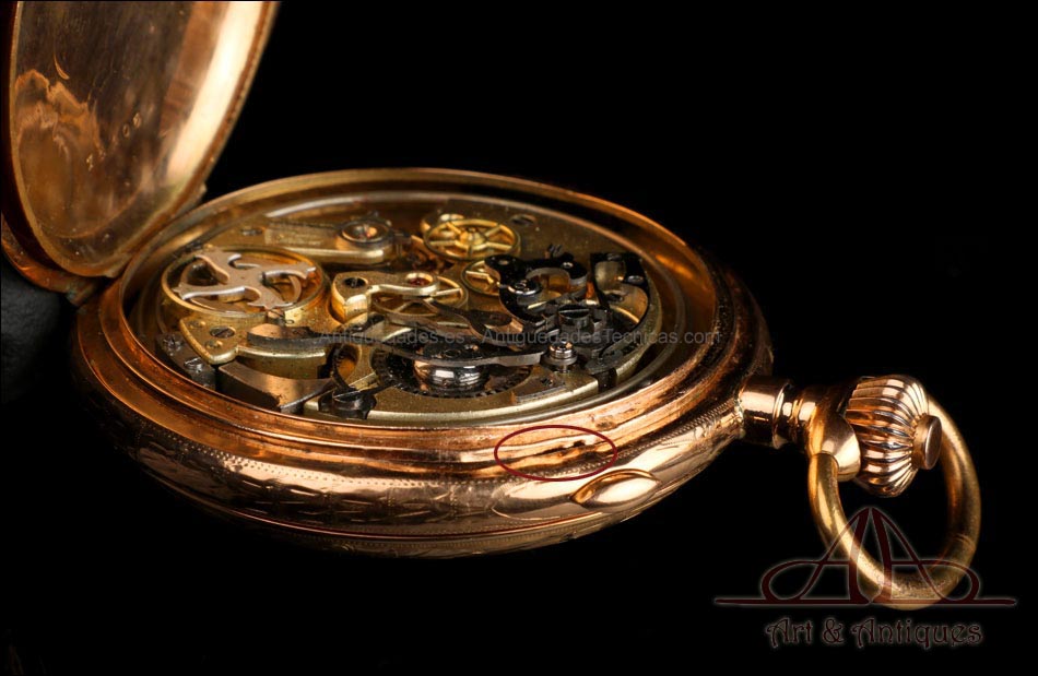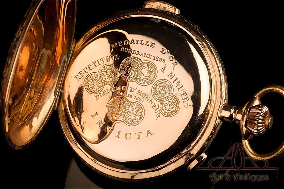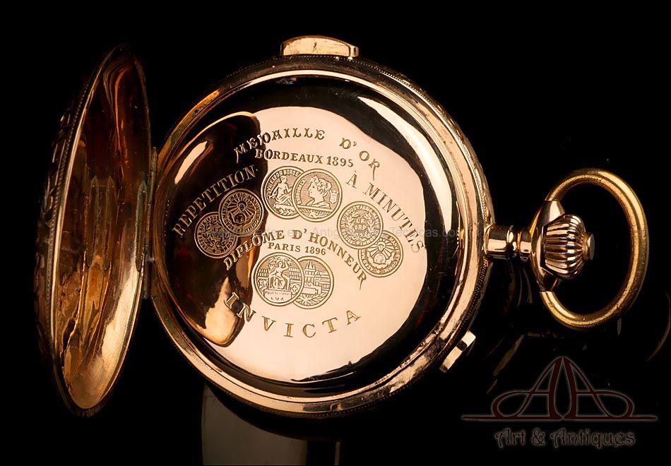 Extraordinario reloj de bolsillo antiguo Invicta con sonería a minutos y cronómetro, de oro de 18K y fabricado en Suiza circa 1900. El reloj es de gran tamaño, funciona bien y se encuentra en muy buen estado. El único desperfecto que muestra es una ligera fisura en el ribete de la tapa posterior, apenas discernible y que está fotografiado. La caja lleva tres tapas de oro macizo; las exteriores están profusamente labradas a mano. En la tapa delantera podemos ver un escudo central con las iniciales de un propietario anterior. La decoración es realmente hermosa, formada por motivos vegetales y clásicos repartidos simétricamente. Las tres tapas llevan el contraste del oro de 18K y el número de serie 75405. La esfera es blanca con números arábigos negros y agujas doradas estilo Luis XV. La tapa guardapolvo está labrada a mano con las imágenes de los premios otorgados a la marca y el nombre de esta, INVICTA.