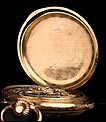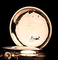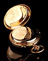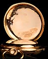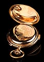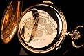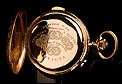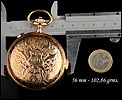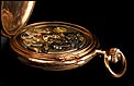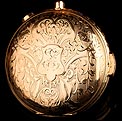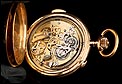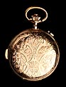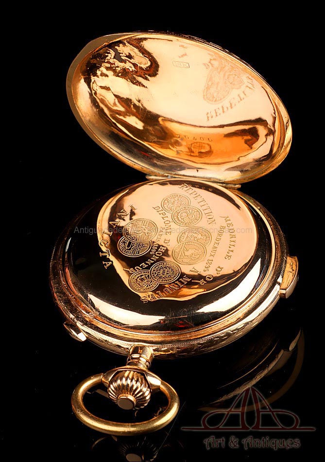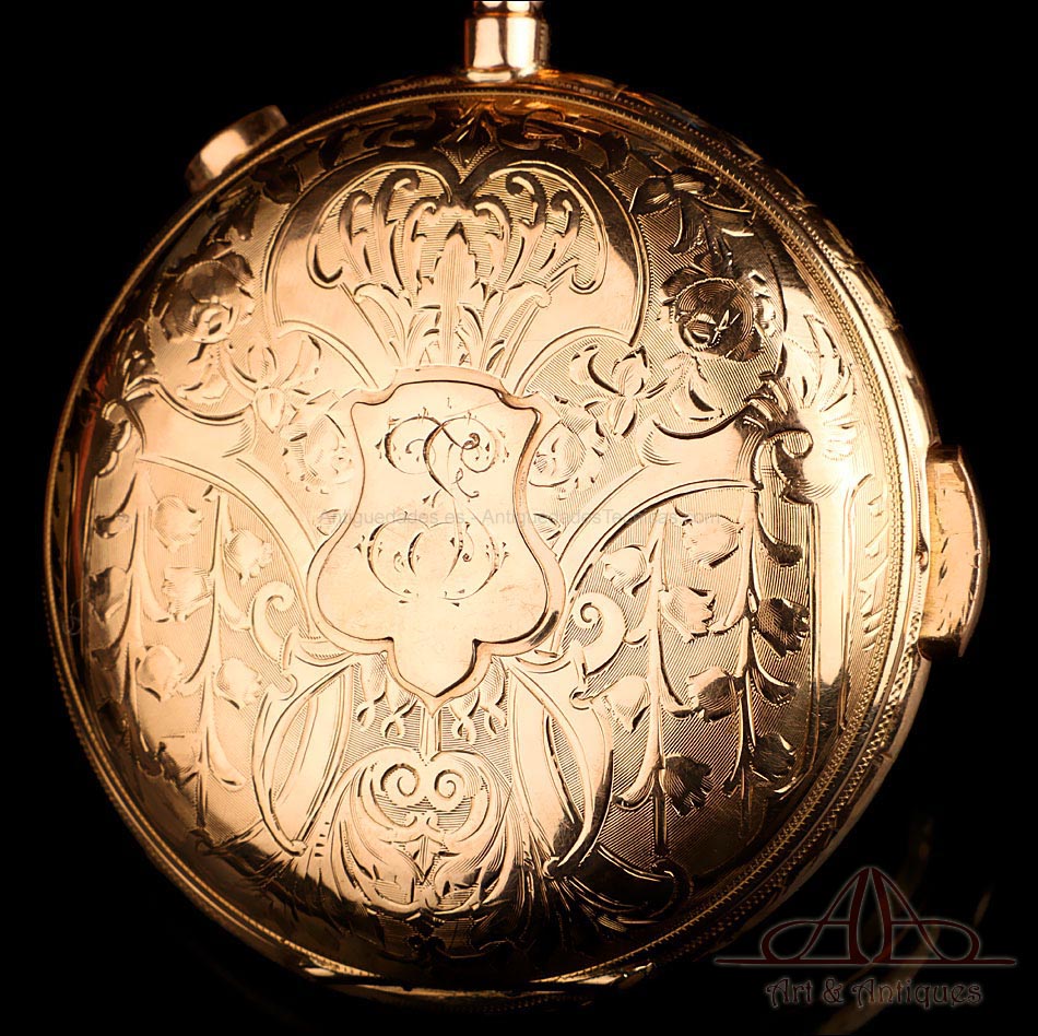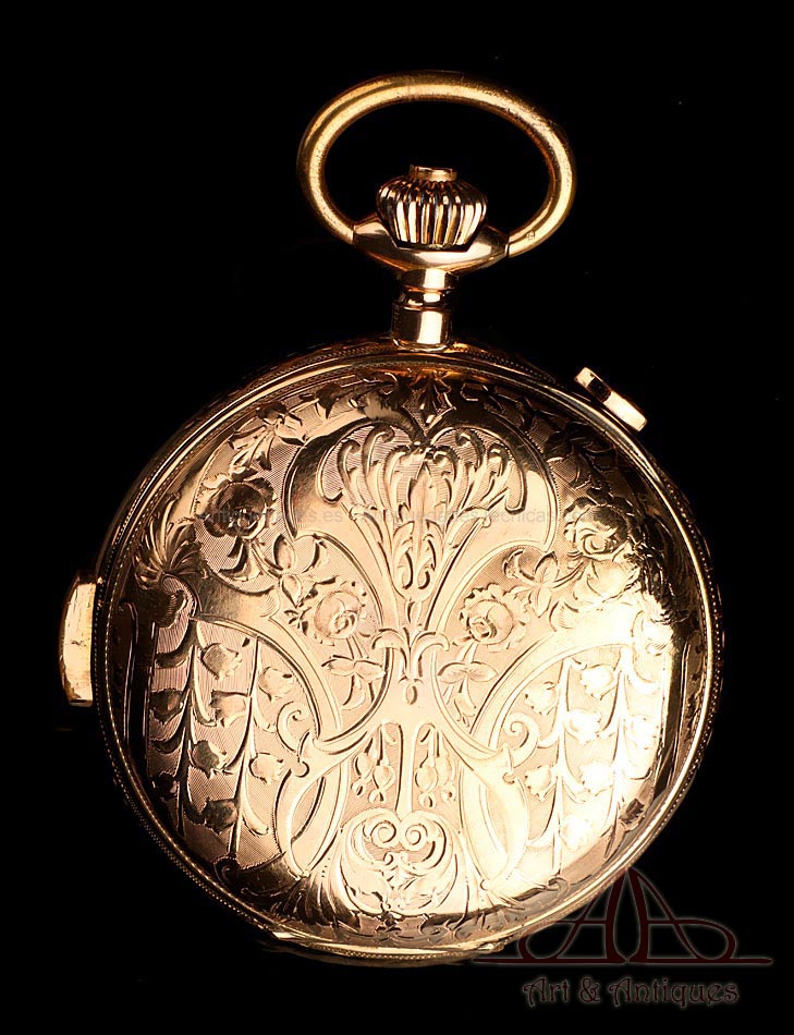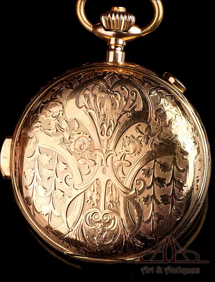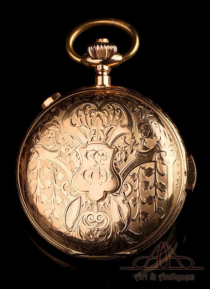Extraordinario reloj de bolsillo antiguo Invicta con sonería a minutos y cronómetro, de oro de 18K y fabricado en Suiza circa 1900. El reloj es de gran tamaño, funciona bien y se encuentra en muy buen estado. El único desperfecto que muestra es una ligera fisura en el ribete de la tapa posterior, apenas discernible y que está fotografiado. La caja lleva tres tapas de oro macizo; las exteriores están profusamente labradas a mano. En la tapa delantera podemos ver un escudo central con las iniciales de un propietario anterior. La decoración es realmente hermosa, formada por motivos vegetales y clásicos repartidos simétricamente. Las tres tapas llevan el contraste del oro de 18K y el número de serie 75405. La esfera es blanca con números arábigos negros y agujas doradas estilo Luis XV. La tapa guardapolvo está labrada a mano con las imágenes de los premios otorgados a la marca y el nombre de esta, INVICTA.