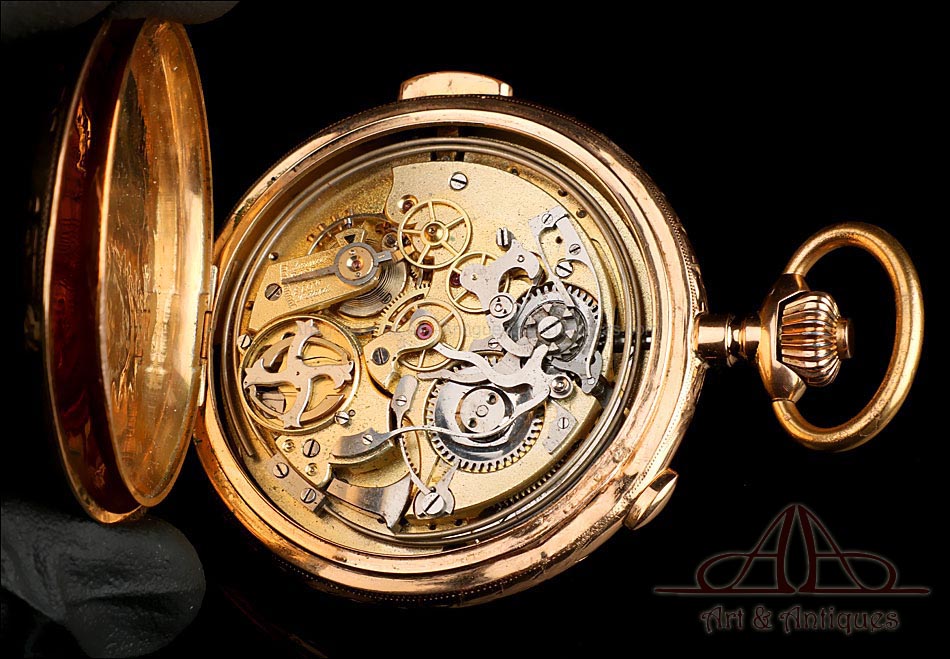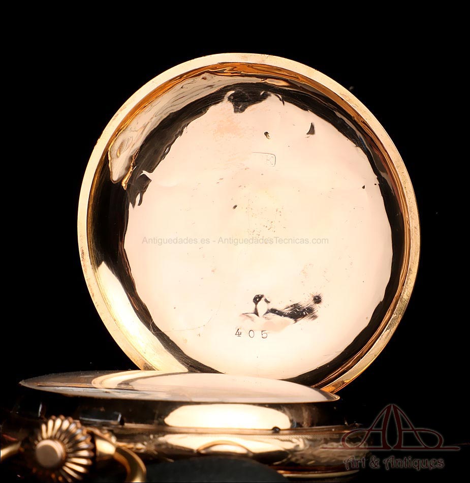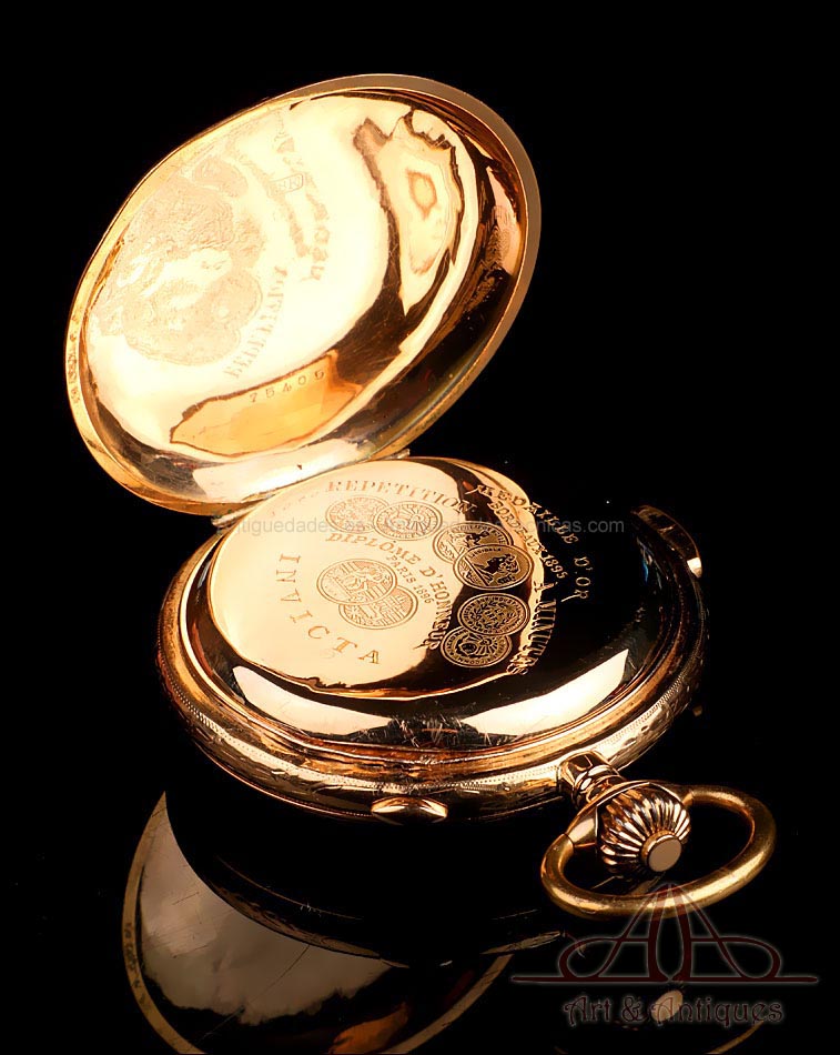 Reloj de Bolsillo Antiguo Invicta. Sonería a Minutos y Crono. Oro 18K. Suiza, Circa 1900 |