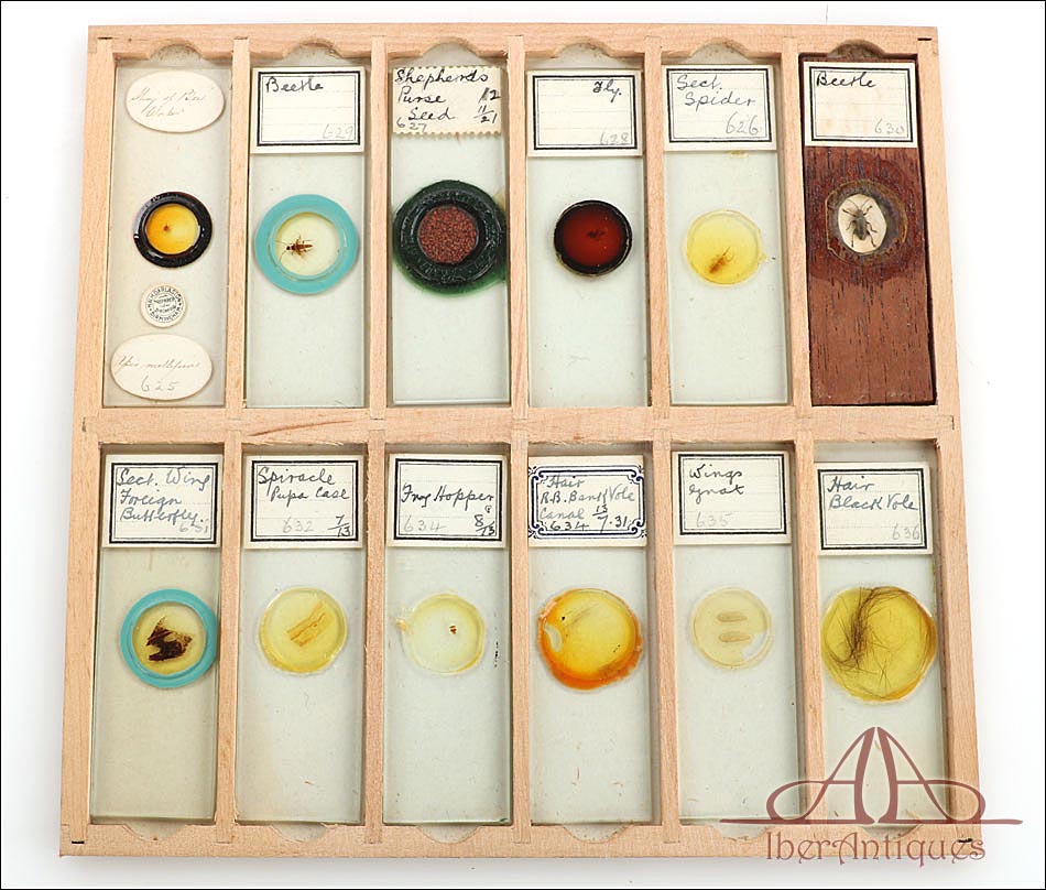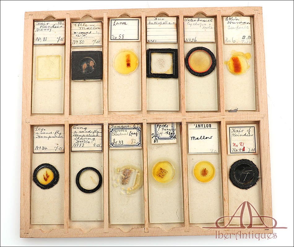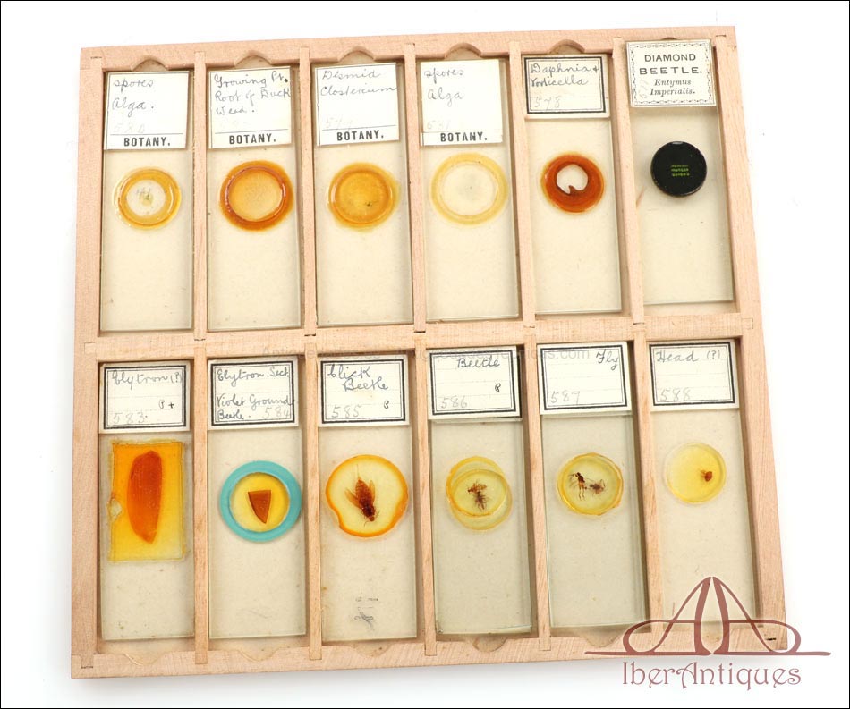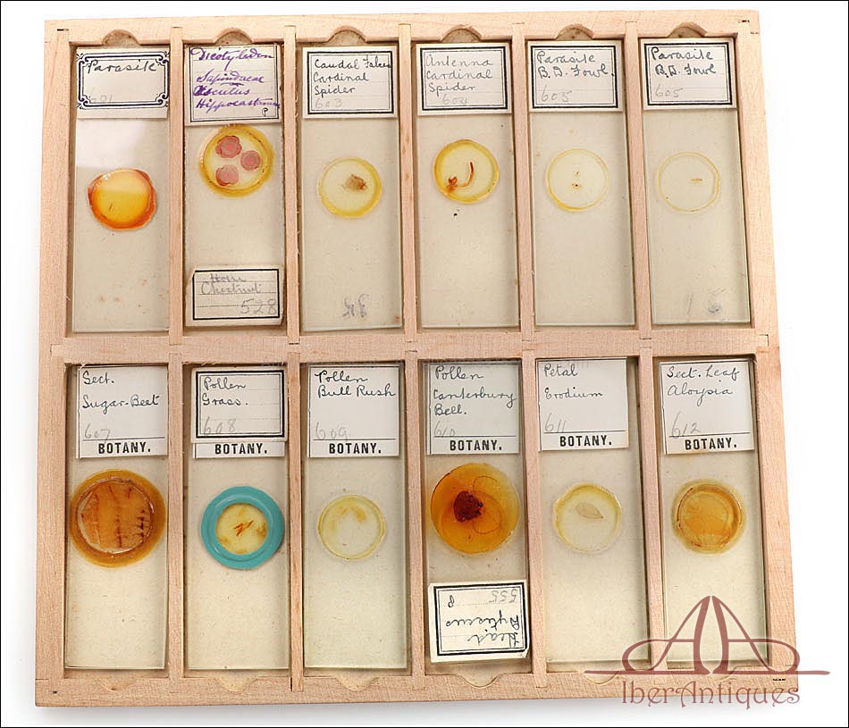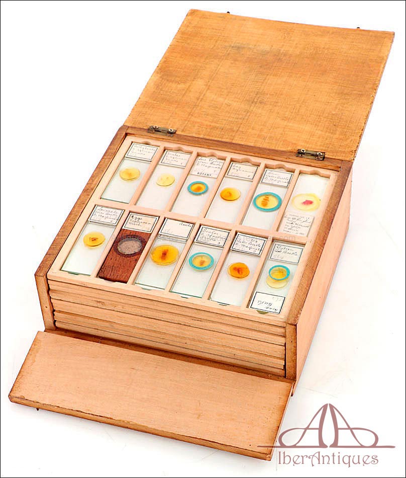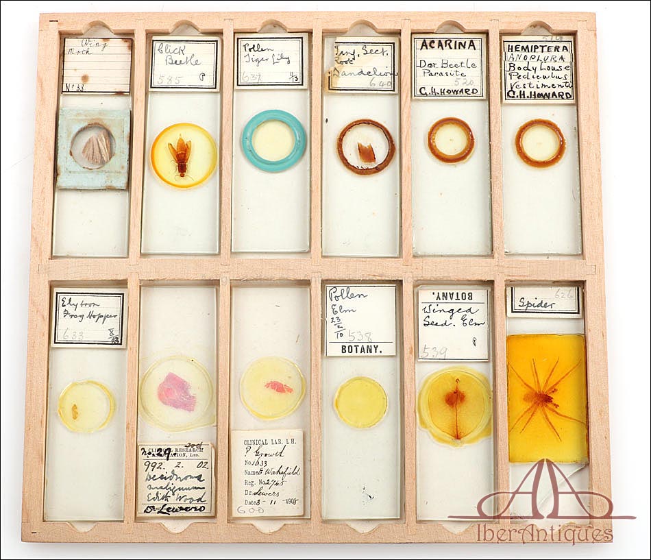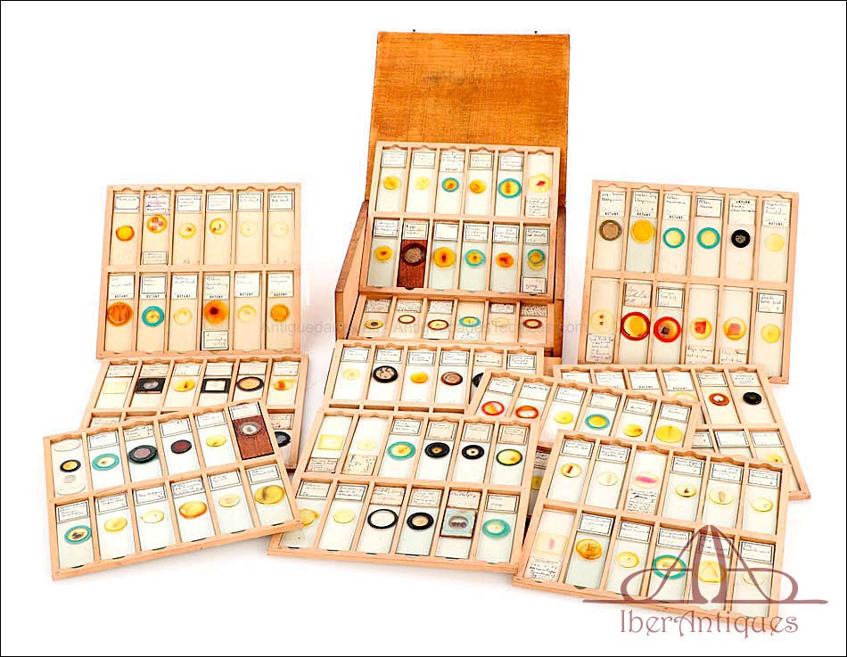 Gran colección de 144 preparados de microscopio antiguos, realizada en Inglaterra en el siglo XIX y muy bien conservada. La colección está completa y tiene un enorme interés, tanto científico como histórico. Está formada por distintos tipos de insectos y partes de plantas, todos ellos etiquetados con sus nombres manuscritos en inglés: polen, pétalos, arañas, escarabajos... Los preparados van montados mayoritariamente sobre placas de vidrio. Están organizados en bandejas que se ajustan en el estuche; la parte delantera es abatible para facilitar su extracción y guardado.